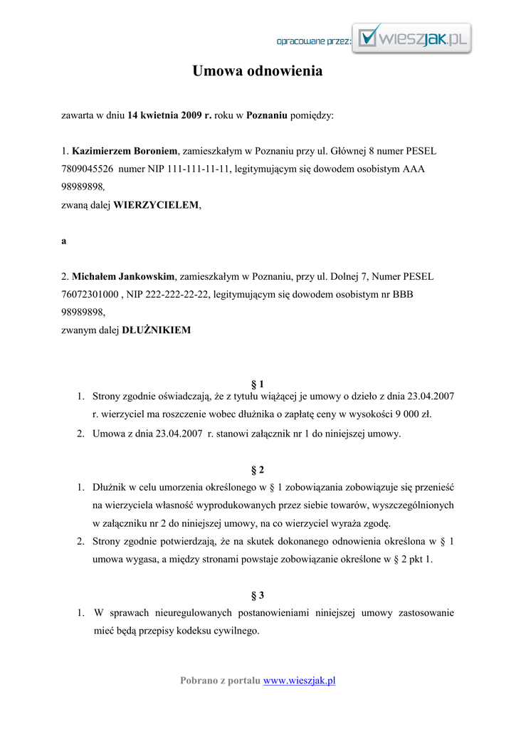 Umowa odnowienia zawarta w dniu 14 kwietnia 2009 r. roku w Poznaniu pomiędzy: 1. Kazimierzem Boroniem, zamieszkałym w Poznaniu przy ul. Głównej 8 numer PESEL 7809045526 numer NIP 111-111-11-11, legitymującym się dowodem osobistym AAA 98989898, zwaną dalej WIERZYCIELEM, a 2. Michałem Jankowskim, zamieszkałym w Poznaniu, przy ul. Dolnej 7, Numer PESEL 76072301000 , NIP 222-222-22-22, legitymującym się dowodem osobistym nr BBB 98989898, zwanym dalej DŁUŻNIKIEM §1 1. Strony zgodnie oświadczają, że z tytułu wiążącej je umowy o dzieło z dnia 23.04.2007 r. wierzyciel ma roszczenie wobec dłużnika o zapłatę ceny w wysokości 9 000 zł. 2. Umowa z dnia 23.04.2007 r. stanowi załącznik nr 1 do niniejszej umowy. §2 1. Dłużnik w celu umorzenia określonego w § 1 zobowiązania zobowiązuje się przenieść na wierzyciela własność wyprodukowanych przez siebie towarów, wyszczególnionych w załączniku nr 2 do niniejszej umowy, na co wierzyciel wyraża zgodę. 2. Strony zgodnie potwierdzają, że na skutek dokonanego odnowienia określona w § 1 umowa wygasa, a między stronami powstaje zobowiązanie określone w § 2 pkt 1. §3 1. W sprawach nieuregulowanych postanowieniami niniejszej umowy zastosowanie mieć będą przepisy kodeksu cywilnego. Pobrano z portalu www.wieszjak.pl 2. Wszelkie spory na tle wykonywania umowy rozstrzygać będzie właściwy sąd powszechny w Warszawie. 3. Wszystkie załączniki stanowią integralną część niniejszej umowy. 4. Wszelkie zmiany umowy wymagają formy pisemnej pod rygorem nieważności. 5. Umowę sporządzono w dwóch jednobrzmiących egzemplarzach, jednym dla wierzyciela i jednym dla dłużnika. WIERZYCIEL DŁUŻNIK …………………………….. Pobrano z portalu www.wieszjak.pl ...………………………