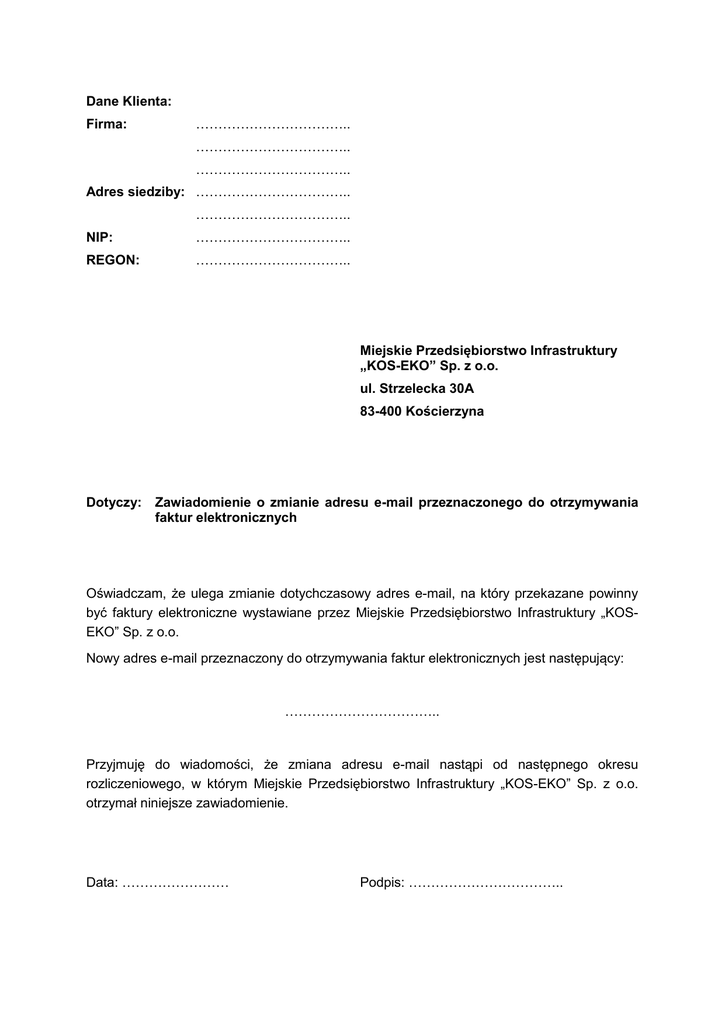 Dane Klienta: Firma: …………………………….. …………………………….. …………………………….. Adres siedziby: …………………………….. …………………………….. NIP: …………………………….. REGON: …………………………….. Miejskie Przedsiębiorstwo Infrastruktury „KOS-EKO” Sp. z o.o. ul. Strzelecka 30A 83-400 Kościerzyna Dotyczy: Zawiadomienie o zmianie adresu e-mail przeznaczonego do otrzymywania faktur elektronicznych Oświadczam, że ulega zmianie dotychczasowy adres e-mail, na który przekazane powinny być faktury elektroniczne wystawiane przez Miejskie Przedsiębiorstwo Infrastruktury „KOSEKO” Sp. z o.o. Nowy adres e-mail przeznaczony do otrzymywania faktur elektronicznych jest następujący: …………………………….. Przyjmuję do wiadomości, że zmiana adresu e-mail nastąpi od następnego okresu rozliczeniowego, w którym Miejskie Przedsiębiorstwo Infrastruktury „KOS-EKO” Sp. z o.o. otrzymał niniejsze zawiadomienie. Data: …………………… Podpis: ……………………………..