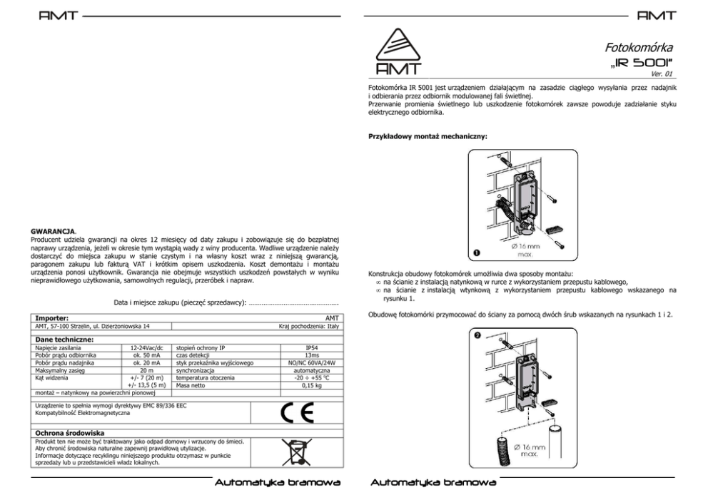- Fotokomórka „IR 5001” Ver. 01 Fotokomórka IR 5001 jest urządzeniem działającym na zasadzie ciągłego wysyłania przez nadajnik i odbierania przez odbiornik modulowanej fali świetlnej. Przerwanie promienia świetlnego lub uszkodzenie fotokomórek zawsze powoduje zadziałanie styku elektrycznego odbiornika. Przykładowy montaŜ mechaniczny: GWARANCJA. Producent udziela gwarancji na okres 12 miesięcy od daty zakupu i zobowiązuje się do bezpłatnej naprawy urządzenia, jeŜeli w okresie tym wystąpią wady z winy producenta. Wadliwe urządzenie naleŜy dostarczyć do miejsca zakupu w stanie czystym i na własny koszt wraz z niniejszą gwarancją, paragonem zakupu lub fakturą VAT i krótkim opisem uszkodzenia. Koszt demontaŜu i montaŜu urządzenia ponosi uŜytkownik. Gwarancja nie obejmuje wszystkich uszkodzeń powstałych w wyniku nieprawidłowego uŜytkowania, samowolnych regulacji, przeróbek i napraw. Data i miejsce zakupu (pieczęć sprzedawcy): …………………………………………. Importer: AMT AMT, 57-100 Strzelin, ul. DzierŜoniowska 14 Konstrukcja obudowy fotokomórek umoŜliwia dwa sposoby montaŜu: • na ścianie z instalacją natynkową w rurce z wykorzystaniem przepustu kablowego, • na ścianie z instalacją wtynkową z wykorzystaniem przepustu kablowego wskazanego na rysunku 1. Obudowę fotokomórki przymocować do ściany za pomocą dwóch śrub wskazanych na rysunkach 1 i 2. Kraj pochodzenia: Italy Dane techniczne: Napięcie zasilania Pobór prądu odbiornika Pobór prądu nadajnika Maksymalny zasięg Kąt widzenia 12-24Vac/dc ok. 50 mA ok. 20 mA 20 m +/- 7 (20 m) +/- 13,5 (5 m) montaŜ – natynkowy na powierzchni pionowej stopień ochrony IP czas detekcji styk przekaźnika wyjściowego synchronizacja temperatura otoczenia Masa netto IP54 13ms NO/NC 60VA/24W automatyczna -20 ÷ +55 oC 0,15 kg Urządzenie to spełnia wymogi dyrektywy EMC 89/336 EEC Kompatybilność Elektromagnetyczna Ochrona środowiska Produkt ten nie moŜe być traktowany jako odpad domowy i wrzucony do śmieci. Aby chronić środowiska naturalne zapewnij prawidłową utylizacje. Informacje dotyczące recyklingu niniejszego produktu otrzymasz w punkcie sprzedaŜy lub u przedstawicieli władz lokalnych. Automatyka bramowa Automatyka bramowa - - Podłączenia elektryczne: Vcc 12 V – plus zasilania 12V AC/DC. Vcc 24 V - plus zasilania 24V AC/DC. Gnd – minus zasilania 12-24V AC/DC. Przy zasilaniu napięciem zmiennym biegunowość nie ma znaczenia. COM NC NO – styk wspólny przekaźnika. – wyjście sygnałowe NC fotokomórki. – wyjście sygnałowe NO fotokomórki. Uruchomienie fotokomórek: • Załączyć zasilanie nadajnika i odbiornika. • Zmontować obudowę w jedną całość. • Prawidłowo – współosiowo – zamontowane fotokomórki i poprawnie podłączone rozpoznaje się po zgaśnięciu diody w odbiorniku. Pojawienie się przeszkody na drodze fotobariery (wystarczy ręką przesłonić jedną z fotokomórek) spowoduje zapalenie diody i słyszalne przełączenie przekaźnika. Automatyka bramowa Automatyka bramowa