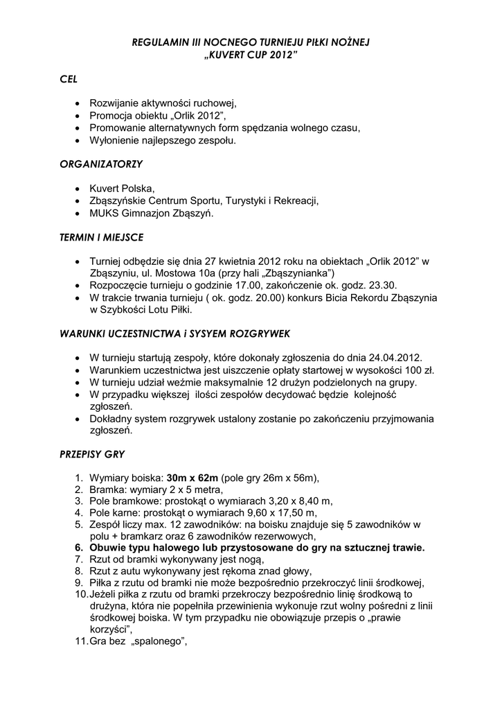 REGULAMIN III NOCNEGO TURNIEJU PIŁKI NOŻNEJ „KUVERT CUP 2012” CEL Rozwijanie aktywności ruchowej, Promocja obiektu „Orlik 2012”, Promowanie alternatywnych form spędzania wolnego czasu, Wyłonienie najlepszego zespołu. ORGANIZATORZY Kuvert Polska, Zbąszyńskie Centrum Sportu, Turystyki i Rekreacji, MUKS Gimnazjon Zbąszyń. TERMIN I MIEJSCE Turniej odbędzie się dnia 27 kwietnia 2012 roku na obiektach „Orlik 2012” w Zbąszyniu, ul. Mostowa 10a (przy hali „Zbąszynianka”) Rozpoczęcie turnieju o godzinie 17.00, zakończenie ok. godz. 23.30. W trakcie trwania turnieju ( ok. godz. 20.00) konkurs Bicia Rekordu Zbąszynia w Szybkości Lotu Piłki. WARUNKI UCZESTNICTWA i SYSYEM ROZGRYWEK W turnieju startują zespoły, które dokonały zgłoszenia do dnia 24.04.2012. Warunkiem uczestnictwa jest uiszczenie opłaty startowej w wysokości 100 zł. W turnieju udział weźmie maksymalnie 12 drużyn podzielonych na grupy. W przypadku większej ilości zespołów decydować będzie kolejność zgłoszeń. Dokładny system rozgrywek ustalony zostanie po zakończeniu przyjmowania zgłoszeń. PRZEPISY GRY 1. 2. 3. 4. 5. Wymiary boiska: 30m x 62m (pole gry 26m x 56m), Bramka: wymiary 2 x 5 metra, Pole bramkowe: prostokąt o wymiarach 3,20 x 8,40 m, Pole karne: prostokąt o wymiarach 9,60 x 17,50 m, Zespół liczy max. 12 zawodników: na boisku znajduje się 5 zawodników w polu + bramkarz oraz 6 zawodników rezerwowych, 6. Obuwie typu halowego lub przystosowane do gry na sztucznej trawie. 7. Rzut od bramki wykonywany jest nogą, 8. Rzut z autu wykonywany jest rękoma znad głowy, 9. Piłka z rzutu od bramki nie może bezpośrednio przekroczyć linii środkowej, 10. Jeżeli piłka z rzutu od bramki przekroczy bezpośrednio linię środkową to drużyna, która nie popełniła przewinienia wykonuje rzut wolny pośredni z linii środkowej boiska. W tym przypadku nie obowiązuje przepis o „prawie korzyści”, 11. Gra bez „spalonego”, 12. Zmiany hokejowe. Podczas zmiany zawodnik może wejść na boisko dopiero wtedy kiedy jego partner z zespołu opuści plac gry. Zmiany muszą odbywać się przy linii środkowej boiska, nie dalej niż 3 metry od niej, 13. Podczas wykonywania stałych fragmentów gry zawodnicy drużyny przeciwnej muszą znajdować się przynajmniej w odległości 5 metrów od piłki, 14. Rzut karny wykonywany jest z lini pola karnego czyli z odległości 9,60 m od bramki, 15. Pozostałe przepisy zgodnie z przepisami PZPN, 16. W przypadku rażąco niesportowego zachowania w trakcie pobytu na boisku jak i na widowni organizatorzy mają prawo do ukarania zawodników lub całej drużyny przez odsunięcie z turnieju, uwzględniając wcześniejsze decyzje sędziego. PUNKTACJA Za wygrany mecz drużyna otrzymuje 3 pkt., za remis 1 pkt., w przypadku porażki 0 pkt. O kolejności miejsc w grupie decydują: 1. Większa liczba zdobytych punktów, 2. W przypadku uzyskania równej liczby punktów przez dwa zespoły decydują: A/ wynik bezpośredniego spotkania, B/ lepsza różnica bramek w całym mini turnieju, C/ większa liczba zdobytych bramek w całym mini turnieju. 3. W przypadku uzyskania równej liczby punktów przez więcej niż dwa zespoły przeprowadza się dodatkową punktację pomocniczą spotkań wyłącznie między zainteresowanymi zespołami (tzw. „mała tabela”), kierując się kolejno zasadami podanymi w punkcie 2 w podpunktach A, B oraz C biorąc pod uwagę jedynie wyniki spotkań pomiędzy zainteresowanymi zespołami, 4. Jeżeli powyższe punkty nie przyniosą rozstrzygnięcia należy przeprowadzić serię rzutów karnych pomiędzy zainteresowanymi zespołami. Rzuty karne wykonywane są najpierw po 5, potem po 1 razie do skutku. W meczach, które muszą wyłonić zwycięzcę, w przypadku remisu, przeprowadza się dogrywkę trwającą 5 minut. Następnie rzuty karne strzelane najpierw po 5, potem po 1 razie do skutku. NAGRODY Miejsce 1 - 4 w grupie zaawansowanej i niezaawansowanej puchary dla zespołów, Medale dla wszystkich zawodników z miejsc 1-3 w grupie zaawansowanej i niezaawansowanej, Miejsca 5 – 7, statuetki za udział w turnieju, Wyróżnienie indywidualne w kategorii: Rekord Zbąszynia w Szybkości Lotu Piłki – statuetka lub puchar. SPRAWY RÓŻNE Obsługę sędziowską, techniczną oraz sprzęt do gry zapewnia organizator, Zawodnicy biorą udział w rozgrywkach na własną odpowiedzialność, Organizator nie ubezpiecza dodatkowo uczestników od następstw nieszczęśliwych wypadków, Za przedmioty pozostawione w szatniach organizatorzy nie biorą odpowiedzialności, Interpretacja regulaminu należy wyłącznie do organizatora, Życzymy wszystkim zespołom osiągnięcia jak najlepszych wyników sportowych w duchu zdrowej rywalizacji na boisku.