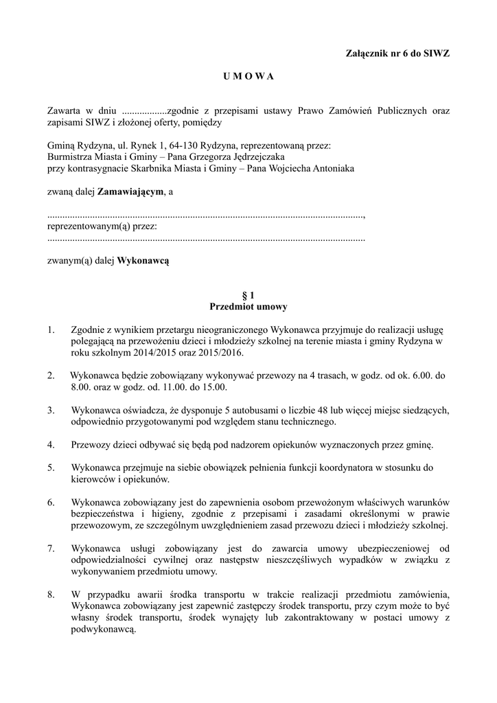Załącznik nr 6 do SIWZ U M O WA Zawarta w dniu ..................zgodnie z przepisami ustawy Prawo Zamówień Publicznych oraz zapisami SIWZ i złoŜonej oferty, pomiędzy Gminą Rydzyna, ul. Rynek 1, 64-130 Rydzyna, reprezentowaną przez: Burmistrza Miasta i Gminy – Pana Grzegorza Jędrzejczaka przy kontrasygnacie Skarbnika Miasta i Gminy – Pana Wojciecha Antoniaka zwaną dalej Zamawiającym, a .............................................................................................................................., reprezentowanym(ą) przez: ............................................................................................................................... zwanym(ą) dalej Wykonawcą §1 Przedmiot umowy 1. Zgodnie z wynikiem przetargu nieograniczonego Wykonawca przyjmuje do realizacji usługę polegającą na przewoŜeniu dzieci i młodzieŜy szkolnej na terenie miasta i gminy Rydzyna w roku szkolnym 2014/2015 oraz 2015/2016. 2. Wykonawca będzie zobowiązany wykonywać przewozy na 4 trasach, w godz. od ok. 6.00. do 8.00. oraz w godz. od. 11.00. do 15.00. 3. Wykonawca oświadcza, Ŝe dysponuje 5 autobusami o liczbie 48 lub więcej miejsc siedzących, odpowiednio przygotowanymi pod względem stanu technicznego. 4. Przewozy dzieci odbywać się będą pod nadzorem opiekunów wyznaczonych przez gminę. 5. Wykonawca przejmuje na siebie obowiązek pełnienia funkcji koordynatora w stosunku do kierowców i opiekunów. 6. Wykonawca zobowiązany jest do zapewnienia osobom przewoŜonym właściwych warunków bezpieczeństwa i higieny, zgodnie z przepisami i zasadami określonymi w prawie przewozowym, ze szczególnym uwzględnieniem zasad przewozu dzieci i młodzieŜy szkolnej. 7. Wykonawca usługi zobowiązany jest do zawarcia umowy ubezpieczeniowej od odpowiedzialności cywilnej oraz następstw nieszczęśliwych wypadków w związku z wykonywaniem przedmiotu umowy. 8. W przypadku awarii środka transportu w trakcie realizacji przedmiotu zamówienia, Wykonawca zobowiązany jest zapewnić zastępczy środek transportu, przy czym moŜe to być własny środek transportu, środek wynajęty lub zakontraktowany w postaci umowy z podwykonawcą. 9. Zamawiający zastrzega sobie prawo wprowadzenia zmian w zakresie zmniejszenia ilości kilometrów, liczby dzieci, godzin odwoŜenia i dowoŜenia oraz liczby autobusów, a takŜe prawo wskazania dodatkowych miejsc przestankowych, w zaleŜności od zapotrzebowania. §2 Wynagrodzenie 1. Strony ustalają, Ŝe obowiązującą formą wynagrodzenia, za wykonanie przedmiotu umowy, zgodnie ze złoŜoną ofertą, jest wynagrodzenie w wysokości netto: ........................................ zł za 1 km przewozu, plus obowiązujący podatek VAT w wysokości: ...........zł (....%), co stanowi kwotę brutto:........................................zł za km przewozu, słownie ...................................... zł. 2. Zamawiający dopuszcza zmianę ceny za 1 km co 3 miesiące, o procentowy wskaźnik zmiany ceny oleju napędowego, przy czym zmiana moŜe dotyczyć jedynie kosztów paliwa w cenie za 1 km. Ww. wskaźnik zmiany ceny naleŜy rozumieć jako średnią cenę oleju napędowego z ostatnich 3 miesięcy, publikowanych na stronie internetowej Polskiej Izby Paliw Płynnych (www.paliwa.pl – wykres cen paliw), w odniesieniu do ceny z ostatniego notowania przed złoŜeniem wniosku (www.paliwa.pl – ceny paliw). 3. Wykonawca zobowiązuje się do prowadzenia wykazu dni i ewidencji wskazań liczników autobusów w kaŜdym dniu, w którym w danym miesiącu świadczona jest usługa przewozu i przedkładania tego wykazu wraz z fakturą Zamawiającemu. 4. Za wykonane usługi strony będą się rozliczać fakturami wystawionymi przez Wykonawcę po upływie miesiąca, w którym wykonano usługę. 5. Wynagrodzenie płatne będzie przelewem w ciągu 14 dni od daty doręczenia faktury wraz z dokumentami rozliczeniowymi. §3 Termin wykonania Zamówienie naleŜy zrealizować w terminach: a) od dnia 1 września 2014 r. do końca roku szkolnego 2015 r. b) od dnia 1 września 2015 r. do końca roku szkolnego 2016 r. §4 Kary umowne 1. Wykonawca zapłaci Zamawiającemu kary umowne w przypadku: 1) odstąpienia od umowy przez Zamawiającego z przyczyn, za które ponosi odpowiedzialność Wykonawca – w wysokości 5.000 zł, 2) spowodowania przerwy w realizacji przedmiotu zamówienia – w wysokości 1.000 zł za kaŜdy dzień przerwy w realizacji przedmiotu zamówienia. 3) braku zapłaty lub nieterminowej zapłaty wynagrodzenia naleŜnego podwykonawcom lub dalszym podwykonawcom – w wysokości 5.000 zł, 4) nieprzedłoŜenia do zaakceptowania projektu umowy o podwykonawstwo lub projektu zmiany umowy o podwykonawstwo - w wysokości 2.000 zł, 5) nieprzedłoŜenia poświadczonej za zgodność z podwykonawstwo lub jej zmiany - w wysokości 2.000 zł, oryginałem kopii umowy o 6) braku zmiany umowy o podwykonawstwo w zakresie terminu zapłaty - w wysokości 2.000 zł. 2. Zamawiający ma prawo dochodzić odszkodowania uzupełniającego na zasadach określonych w Kodeksie cywilnym, jeŜeli szkoda przewyŜszy wysokość kar umownych. 3. Ewentualne kary umowne Zamawiający ma prawo potrącić z wynagrodzenia naleŜnego Wykonawcy. §5 Odstąpienie od umowy 1. Zamawiającemu przysługuje prawo do odstąpienia od umowy w terminie 10 dni od powzięcia wiadomości o następujących zdarzeniach: 1) w razie wystąpienia istotnej zmiany okoliczności powodującej, Ŝe wykonanie umowy nie leŜy w interesie publicznym, czego nie moŜna było przewidzieć w chwili zawarcia umowy, 2) gdy zostanie ogłoszona upadłość lub otwarcie likwidacji firmy Wykonawcy, 3) gdy Wykonawca nie rozpoczął wykonywania usługi bez uzasadnionych przyczyn oraz nie kontynuuje ich pomimo wezwania Zamawiającego złoŜonego na piśmie, 4) gdy Wykonawca przerwał realizację usługi bez uzasadnionych przyczyn i przerwa ta trwa dłuŜej niŜ 1 dzień. 2. Odstąpienie od umowy powinno nastąpić w formi