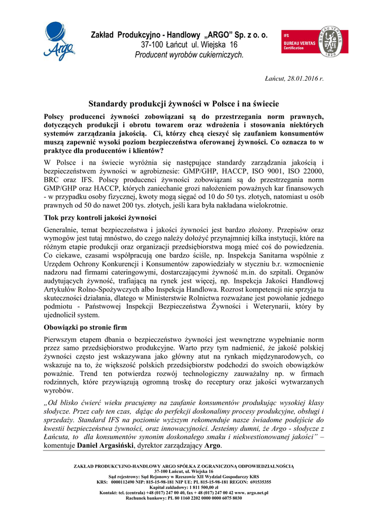 Zakład Produkcyjno - Handlowy „ARGO” Sp. z o. o. 37-100 Łańcut ul. Wiejska 16 Producent wyrobów cukierniczych. Łańcut, 28.01.2016 r. Standardy produkcji żywności w Polsce i na świecie Polscy producenci żywności zobowiązani są do przestrzegania norm prawnych, dotyczących produkcji i obrotu towarem oraz wdrożenia i stosowania niektórych systemów zarządzania jakością. Ci, którzy chcą cieszyć się zaufaniem konsumentów muszą zapewnić wysoki poziom bezpieczeństwa oferowanej żywności. Co oznacza to w praktyce dla producentów i klientów? W Polsce i na świecie wyróżnia się następujące standardy zarządzania jakością i bezpieczeństwem żywności w agrobiznesie: GMP/GHP, HACCP, ISO 9001, ISO 22000, BRC oraz IFS. Polscy producenci żywności zobowiązani są do przestrzegania norm GMP/GHP oraz HACCP, których zaniechanie grozi nałożeniem poważnych kar finansowych - w przypadku osoby fizycznej, kwoty mogą sięgać od 10 do 50 tys. złotych, natomiast u osób prawnych od 50 do nawet 200 tys. złotych, jeśli kara była nakładana wielokrotnie. Tłok przy kontroli jakości żywności Generalnie, temat bezpieczeństwa i jakości żywności jest bardzo złożony. Przepisów oraz wymogów jest tutaj mnóstwo, do czego należy dołożyć przynajmniej kilka instytucji, które na różnym etapie produkcji oraz organizacji przedsiębiorstwa mogą mieć coś do powiedzenia. Co ciekawe, czasami współpracują one bardzo ściśle, np. Inspekcja Sanitarna wspólnie z Urzędem Ochrony Konkurencji i Konsumentów zapowiedziały w styczniu b.r. wzmocnienie nadzoru nad firmami cateringowymi, dostarczającymi żywność m.in. do szpitali. Organów audytujących żywność, trafiającą na rynek jest więcej, np. Inspekcja Jakości Handlowej Artykułów Rolno-Spożywczych albo Inspekcja Handlowa. Rozrost kompetencji nie sprzyja tu skuteczności działania, dlatego w Ministerstwie Rolnictwa rozważane jest powołanie jednego podmiotu - Państwowej Inspekcji Bezpieczeństwa Żywności i Weterynarii, który by ujednolicił system. Obowiązki po stronie firm Pierwszym etapem dbania o bezpieczeństwo żywności jest wewnętrzne wypełnianie norm przez samo przedsiębiorstwo produkcyjne. Warto przy tym nadmienić, że jakość polskiej żywności często jest wskazywana jako główny atut na rynkach międzynarodowych, co wskazuje na to, że większość polskich przedsiębiorstw podchodzi do swoich obowiązków poważnie. Trend ten potwierdza rozwój technologiczny zauważalny np. w firmach rodzinnych, które przywiązują ogromną troskę do receptury oraz jakości wytwarzanych wyrobów. „Od blisko ćwierć wieku pracujemy na zaufanie konsumentów produkując wysokiej klasy słodycze. Przez cały ten czas, dążąc do perfekcji doskonalimy procesy produkcyjne, obsługi i sprzedaży. Standard IFS na poziomie wyższym rekomenduje nasze świadome podejście do kwestii bezpieczeństwa żywności, oraz innowacyjności. Jesteśmy dumni, że Argo - słodycze z Łańcuta, to dla konsumentów synonim doskonałego smaku i niekwestionowanej jakości” – komentuje Daniel Argasiński, dyrektor zarządzający Argo. ZAKŁAD PRODUKCYJNO-HANDLOWY ARGO SPÓŁKA Z OGRANICZONĄ ODPOWIEDZIALNOŚCIĄ 37-100 Łańcut, ul. Wiejska 16 Sąd rejestrowy: Sąd Rejonowy w Rzeszowie XII Wydział Gospodarczy KRS KRS: 0000112490 NIP: 815-15-98-181 NIP UE: PL 815-15-98-181 REGON: 691535355 Kapitał zakładowy: 1 811 500,00 zł Kontakt: tel. (centrala) +48 (017) 247 00 40, fax + 48 (017) 247 00 42 www. argo.net.pl Rachunek bankowy: PL 80 1160 2202 0000 0000 6075 8030 Zakład Produkcyjno - Handlowy „ARGO” Sp. z o. o. 37-100 Łańcut ul. Wiejska 16 Producent wyrobów cukierniczych. Przegląd najważniejszych certyfikatów: GMP/GHP. Reguluje takie aspekty działania przedsiębiorstwa, jak lokalizacja wraz z otoczeniem zakładu produkcyjnego oraz związane z tym zagrożenia – m.in. kurz, dym, zanieczyszczenia pochodzące z działalności przemysłowej. HACCP. System Analizy Zagrożeń i Krytycznych Punktów Kontroli to działania podejmowane przez firmę w celu zapewnienia bezpieczeństwa zdrowotnego żywności poprzez identyfikację biologicznych, chemicznych oraz fizycznych zagrożeń oraz ocenianie skali tych zagrożeń. ISO 9001. Zbiór warunków koniecznych do spełnienia przez organizację, której zależy na wdrożeniu systemu zarządzania jakością. Norma ta wymaga od przedsiębiorstwa wprowadzenia nadzoru nad prowadzoną dokumentacją, zaangażowania kierownictwa w działania z tym związane, ustanowienia procesów realizacji wyrobu oraz usystematyzowanego zarządzania zasobami. ISO 22000. System zarządzania bezpieczeństwem żywności dla organizacji znajdujących się w łańcuchu żywnościowym. Jego głównym celem, poprzez ograniczenie możliwości wystąpienia ryzyka na różnych etapach łańcucha żywnościowego, jest zapewnienie dostarczania konsumentom zdrowych i bezpiecznych produktów. Norma stosowana jest we wszystkich etapach dostaw. BRC. Standard BRC łączy w sobie w przepisy zawarte w systemie HACCP oraz w normie ISO 9000, a także zasady dobrej praktyki higienicznej i produkcyjnej GHP i GMP. Inne wymagania standardu BRC to obowiązek posiadania prawidłowej dokumentacji systemu, a także informacji na temat opakowań produktu, terminu przydatności do spożycia, zabezpieczenia przed zanieczyszczeniami. Standard BRC wymaga również od przedsiębiorstwa opracowania zasad higieny oraz przeprowadzenia szkoleń personelu z opracowanych procedur. IFS. Standard IFS (International Food Standard) to jednakowy dla wszystkich producentów żywności standard bezpieczeństwa, dedykowany w szczególności zakładom spożywczym, które dostarczają żywność do sieci handlowych pod własną marką. Uzyskanie certyfikatu IFS uwarunkowane jest wcześniejszym wprowadzeniem dobrych praktyk GMP/GHP, systemu bezpieczeństwa żywności HACCP oraz norm serii ISO, przy jednoczesnym skoncentrowan
