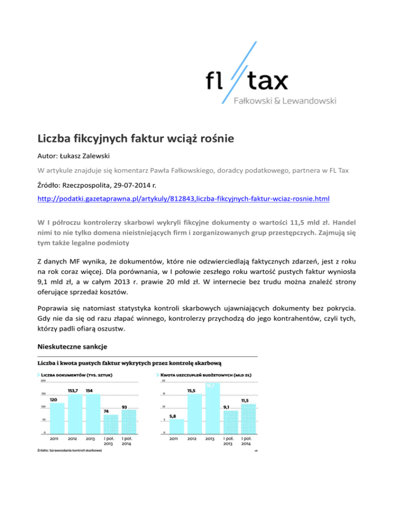 Liczba fikcyjnych faktur wciąż rośnie Autor: Łukasz Zalewski W artykule znajduje się komentarz Pawła Fałkowskiego, doradcy podatkowego, partnera w FL Tax Źródło: Rzeczpospolita, 29-07-2014 r. http://podatki.gazetaprawna.pl/artykuly/812843,liczba-fikcyjnych-faktur-wciaz-rosnie.html W I półroczu kontrolerzy skarbowi wykryli fikcyjne dokumenty o wartości 11,5 mld zł. Handel nimi to nie tylko domena nieistniejących firm i zorganizowanych grup przestępczych. Zajmują się tym także legalne podmioty Z danych MF wynika, że dokumentów, które nie odzwierciedlają faktycznych zdarzeń, jest z roku na rok coraz więcej. Dla porównania, w I połowie zeszłego roku wartość pustych faktur wyniosła 9,1 mld zł, a w całym 2013 r. prawie 20 mld zł. W internecie bez trudu można znaleźć strony oferujące sprzedaż kosztów. Poprawia się natomiast statystyka kontroli skarbowych ujawniających dokumenty bez pokrycia. Gdy nie da się od razu złapać winnego, kontrolerzy przychodzą do jego kontrahentów, czyli tych, którzy padli ofiarą oszustw. Nieskuteczne sankcje Andrzej Nikończyk, doradca podatkowy i partner w KNDP, uważa, że aby skutecznie walczyć z pustymi fakturami, należy zwiększyć kary dla oszustów. – Dziś więcej można dostać za kradzież w sklepie niż za puste faktury. Sankcje więc są, ale – jak pokazuje praktyka – nieskuteczne – mówi ekspert. Andrzej Nikończyk tłumaczy, że wynika to z orzecznictwa dotyczącego art. 108 ustawy o VAT. Według sądów organy nie mają podstaw żądać podatku od sprzedawcy, jeśli skutecznie wyeliminowały możliwość odliczenia u nabywcy, a więc np. w drodze decyzji pozbawiły nabywcę prawa do odliczenia (wówczas wystawca nie musi płacić VAT wykazanego w fakturach). Wprawdzie wystawcom pustych faktur grożą sankcje karne, ale często idą oni na współpracę z organami ścigania. – W efekcie wystawca dostaje wyrok karny, ale często niewielki (w stosunku do kwot, które wyłudził) lub w zawieszeniu i nie musi wpłacać podatku, ponieważ albo sam koryguje faktury, albo organ już wcześniej wykluczył możliwość odliczenia z nich VAT u nabywców – stwierdza ekspert KNDP. – Wcześniej funkcjonowała sankcja 30 proc., która hamowała nieuczciwych wystawców. Po wykryciu procederu można było wyegzekwować sankcję z majątku podatnika – przypomina Nikończyk. Stosowanie 30-proc. stawki zakwestionował jednak Trybunał Konstytucyjny już w 1998 r. (sygn. akt K 17/97). Orzekł wtedy, że nie można jej wykorzystywać wobec osoby, która poniosła już odpowiedzialność karną skarbową. Z kolei nabywcy pustych faktur, jeśli kupują je świadomie, ryzykują tylko odsetkami (10 proc. W skali roku). Po podpisaniu protokołu kontroli skarbowej, a przed wszczęciem postępowania podatkowego przysługuje im prawo do korekty deklaracji i – jak mówi Nikończyk – dochodzi wtedy do wyłączenia karalności. Jest popyt, jest podaż Procederem fikcyjnych faktur zajmują się zarówno legalnie działające firmy, jak i zorganizowane grupy przestępcze. – Rządzi prawo popytu i podaży. Zainteresowani fikcyjnymi fakturami są zarówno sprzedający, jak i nabywcy – stwierdza Roman Namysłowski, doradca podatkowy i partner w Crido Taxand. Przekrój sprzedających jest zróżnicowany. Są to zarówno osoby, których jedyną „działalnością” jest podrabianie faktur, jak i podmioty, które wykazują stratę podatkową i nie mają widoków na jej odliczenie w najbliższych latach, np. ze względu na jej wysokość czy brak spodziewanych przychodów. – Nawet jeżeli je wykażą, to wystawienie pustej faktury nie będzie się dla nich wiązać z koniecznością zapłaty podatku dochodowego, bo strata nadal będzie przewyższać przychody. Podobnie postępują firmy, których przychody są opodatkowane ryczałtowo – wyjaśnia Namysłowski. Z drugiej strony są nabywcy fikcyjnych dokumentów – ci, którzy kupują puste faktury, żeby zwiększyć sobie koszty podatkowe i zmniejszyć VAT należny. Głównie niematerialne Roman Namysłowski zauważa, że najczęściej przedmiotem transakcji wykazywanym na pustych fakturach są usługi o charakterze niematerialnym, takie jak szkolenia, marketing, doradztwo. Czyli takie, przy których trudno wykazać, że nie zostały wykonane. Efekt nie zawsze musi mieć przecież postać materialną, np. opinii czy prezentacji. – Nieuczciwy proceder może dotyczyć także usług transportowych. Przejazd z miasta do miasta można łatwo udowodnić potrzebami biznesowymi. Podobnie zużycie paliwa – przyznaje ekspert Crido Taxand. Uczciwi i oszukani Ale jest też druga strona medalu. To nabywcy pustych faktur, którzy stają się ofiarami oszustów. – To firmy, które kupiły towary lub usługi, a ich dostawcy zniknęli z rynku, nie rozliczając się z fiskusem – tłumaczy doradca podatkowy Wojciech Serafiński. W tym wypadku – dodaje – fiskus przychodzi więc do uczciwych przedsiębiorców. – Niestety, organy podatkowe zbyt często kierują się odpowiedzialnością zbiorową, przenosząc konsekwencje wyłudzenia podatku na uczciwych przedsiębiorców, których jedyną winą było nawiązanie współpracy z nierzetelnym kontrahentem – ocenia Paweł Fałkowski, partner i doradca podatkowy w FL Tax. Zwraca uwagę, że takie działanie jest niezgodne z orzeczeniami Trybunału Sprawiedliwości UE, w których wskazuje się, że identyfikacja i ściganie oszustów podatkowych jest rolą organów państwa i nie można tych obowiązków przenosić na podatników (np. w sprawie C18/13 Maks Pen, w sprawach C-80/11 i C-142/11 Mahagében i Dávid oraz C-285/11 Bonik). Skuteczność kontroli Oficjalne dane pokazują, że kontrolerzy są coraz bardziej skuteczni w wykrywaniu fikcyjnych faktur. W 2012 r. ujawnili ich ponad 150 tys. o łącznej wartości 15,5 mld zł. Rok temu wykryto podobną liczbę, ale już na prawie 20 mld zł, natomiast w I połowie br. – p