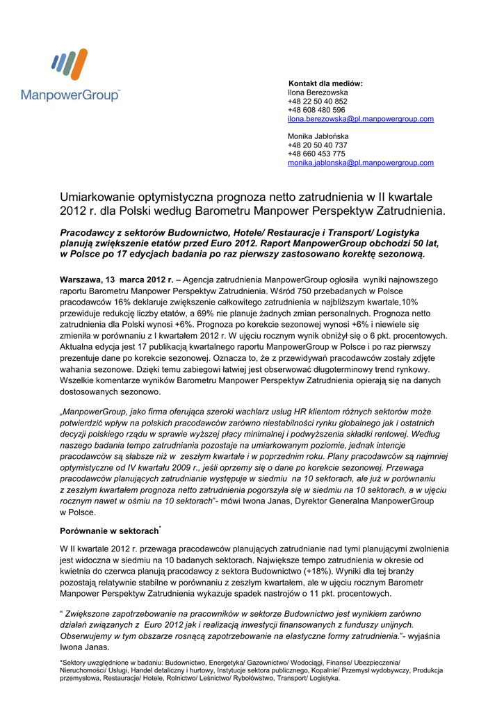 Kontakt dla mediów: Ilona Berezowska +48 22 50 40 852 +48 608 480 596 [email protected] Monika Jabłońska +48 20 50 40 737 +48 660 453 775 [email protected] Umiarkowanie optymistyczna prognoza netto zatrudnienia w II kwartale 2012 r. dla Polski według Barometru Manpower Perspektyw Zatrudnienia. Pracodawcy z sektorów Budownictwo, Hotele/ Restauracje i Transport/ Logistyka planują zwiększenie etatów przed Euro 2012. Raport ManpowerGroup obchodzi 50 lat, w Polsce po 17 edycjach badania po raz pierwszy zastosowano korektę sezonową. Warszawa, 13 marca 2012 r. – Agencja zatrudnienia ManpowerGroup ogłosiła wyniki najnowszego raportu Barometru Manpower Perspektyw Zatrudnienia. Wśród 750 przebadanych w Polsce pracodawców 16% deklaruje zwiększenie całkowitego zatrudnienia w najbliższym kwartale,10% przewiduje redukcję liczby etatów, a 69% nie planuje żadnych zmian personalnych. Prognoza netto zatrudnienia dla Polski wynosi +6%. Prognoza po korekcie sezonowej wynosi +6% i niewiele się zmieniła w porównaniu z I kwartałem 2012 r. W ujęciu rocznym wynik obniżył się o 6 pkt. procentowych. Aktualna edycja jest 17 publikacją kwartalnego raportu ManpowerGroup w Polsce i po raz pierwszy prezentuje dane po korekcie sezonowej. Oznacza to, że z przewidywań pracodawców zostały zdjęte wahania sezonowe. Dzięki temu zabiegowi łatwiej jest obserwować długoterminowy trend rynkowy. Wszelkie komentarze wyników Barometru Manpower Perspektyw Zatrudnienia opierają się na danych dostosowanych sezonowo. „ManpowerGroup, jako firma oferująca szeroki wachlarz usług HR klientom różnych sektorów może potwierdzić wpływ na polskich pracodawców zarówno niestabilności rynku globalnego jak i ostatnich decyzji polskiego rządu w sprawie wyższej płacy minimalnej i podwyższenia składki rentowej. Według naszego badania tempo zatrudniania pozostaje na umiarkowanym poziomie, jednak intencje pracodawców są słabsze niż w zeszłym kwartale i w poprzednim roku. Plany pracodawców są najmniej optymistyczne od IV kwartału 2009 r., jeśli oprzemy się o dane po korekcie sezonowej. Przewaga pracodawców planujących zatrudnianie występuje w siedmiu na 10 sektorach, ale już w porównaniu z zeszłym kwartałem prognoza netto zatrudnienia pogorszyła się w siedmiu na 10 sektorach, a w ujęciu rocznym nawet w ośmiu na 10 sektorach”- mówi Iwona Janas, Dyrektor Generalna ManpowerGroup w Polsce. Porównanie w sektorach * W II kwartale 2012 r. przewaga pracodawców planujących zatrudnianie nad tymi planującymi zwolnienia jest widoczna w siedmiu na 10 badanych sektorach. Największe tempo zatrudnienia w okresie od kwietnia do czerwca planują pracodawcy z sektora Budownictwo (+18%). Wyniki dla tej branży pozostają relatywnie stabilne w porównaniu z zeszłym kwartałem, ale w ujęciu rocznym Barometr Manpower Perspektyw Zatrudnienia wykazuje spadek nastrojów o 11 pkt. procentowych. “ Zwiększone zapotrzebowanie na pracowników w sektorze Budownictwo jest wynikiem zarówno działań związanych z Euro 2012 jak i realizacją inwestycji finansowanych z funduszy unijnych. Obserwujemy w tym obszarze rosnącą zapotrzebowanie na elastyczne formy zatrudnienia.”- wyjaśnia Iwona Janas. *Sektory uwzględnione w badaniu: Budownictwo, Energetyka/ Gazownictwo/ Wodociągi, Finanse/ Ubezpieczenia/ Nieruchomości/ Usługi, Handel detaliczny i hurtowy, Instytucje sektora publicznego, Kopalnie/ Przemysł wydobywczy, Produkcja przemysłowa, Restauracje/ Hotele, Rolnictwo/ Leśnictwo/ Rybołówstwo, Transport/ Logistyka. Poszukujący pracy w sektorze Hotele i Restauracje mogą się spodziewać zwiększenia ilości ofert w ciągu następnych trzech miesięcy. Prognoza netto zatrudnienia po korekcie sezonowej wynosi tu +15% i jest wyższa o 5 pkt. procentowych zarówno od tej z zeszłego kwartału jak i z zeszłego roku. Sektor Transport/ Logistyka także skorzysta na zbliżającym się Euro. Prognoza netto zatrudnienia wynosi w tym obszarze +11 %. Na podstawie deklaracji pracodawców z sektorów Rolnictwo /Leśnictwo / Rybołówstwo i Energetyka/ Gazownictwo/Wodociągi uzyskano najsłabsze plany zatrudnienia, -5% dla obu sektorów . W tym pierwszym nastąpił spadek prognozy o 4 pkt. procentowe w ujęciu kwartalnym i o 8 pkt. procentowych w ciągu roku. Jest to najmniej optymistyczny wynik od II kwartału 2008 r., kiedy rozpoczęto prowadzenie badanie w Polsce. Prognoza dla sektora Energetyka/ Gazownictwo/ Wodociągi pozostała względnie stabilna w porównaniu z zeszłym rokiem, zaś w ujęciu kwartalnym wzrosła o 4 pkt. procentowe. Pomimo, że prognoza dla sektora Finanse/ Ubezpieczenia/ Nieruchomości/Usługi jest najniższą od początku prowadzenia badania w Polsce, pracodawców planujących zwiększenie zatrudnienia w najbliższych trzech miesiącach jest o 6% więcej niż tych planujących zwolnienia. Porównanie w regionach ** Prognoza netto zatrudnienia jest pozytywna dla wszystkich sześciu badanych regionów. Najwyższą prognozę netto zatrudnienia +9% odnotowano w regionie Południowo- Zachodnim. Jest to wynik relatywnie stabilny w porównaniu z poprzednim kwartałem, jednak o 3 pkt. procentowe niższy niż przed rokiem. Z kolei najmniej optymistyczna prognoza netto zatrudnienia +2% wyłania się z deklaracji pracodawców regionu Centralnego i Północnego. Pomimo lekkiej przewagi po stronie pracodawców planujących zwiększenie zatrudnienia utrzymującej się już drugi kwartał na tym samym poziomie, spadek prognozy w ujęciu rocznym jest największym wśród wszystkich regionów i wynosi 18 pkt. procentowych. Natomiast spadek prognozy dla regionu Północnego w ujęciu kwartalnym wyniósł 7 pkt. procentowych, ale już tylko 2 pkt. procentowe w porównaniu z II kwartałem 2011 r. Region Wschodni zanotował prognozę na poziomie +3%, co stanowi najsłabszy wynik od początku prowadzenia badania. Jednocześnie prognoza w ujęciu kwartalnym obniżyła się o 7 pkt. procentowych