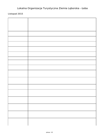 Lokalna Organizacja Turystyczna Ziemia Lęborska - Łeba Listopad 2015 6 listopada – stycze? ZAMKI i REZYDENCJE NA POMORZU – wystawa prezentuj?ca wybrane zabytki powsta?e od XV do pocz?tków XX wieku, zwi?zane z przesz?o?ci? Pomorza, ksi???cym rodem Gryfitów i szlacht? pomorsk?; 9 makiet rezydencji z Po?czynaZdroju, Trzebiatowa, Tuczna, Swobnicy, Kr?gu, ?wierzna, P?zina, Ludwigsburga i Quilow oraz plansze zawieraj?ce opisy i fotografie 35 pomorskich rezydencji (Muzeum w L?borku) 7 listopada BIEGI NIEPODLEG?O?CIOWE – wst?p wolny; tereny le?ne przy stadionie miejskim (Centrum Sportu i Rekreacji w L?borku) 11 listopada OBCHODY ?WI?TA NIEPODLEG?O?CI – uroczysto?? patriotyczna pod Obeliskiem Niepodleg?o?ci przy rondzie Solidarno?ci (Urz?d Miejski w L?borku) ?WI?TO NIEPODLEG?O?CI – okoliczno?ciowa wystawa plenerowa (Gminne Centrum Kultury w Cewicach) 14 listopada V URODZINY DOMU KULTURY ORAZ GMINNEJ BIBLIOTEKI PUBLICZNEJ W MASZEWIE (Gminne Centrum Kultury w Cewicach, Dom Kultury w Maszewie) DUATHLON NA WYDMACH (Zdrowotel ?eba, Burmistrz Miasta ?eby, Stowarzyszenie Kolpinga) 21 listopada WARSZTATY MI?DZY NAMI KOBIETAMI (Gminne Centrum Kultury w Cewicach) COLD WATER BA?TYCKIE K?PIELE MORSÓW – Zdrowotel ?eba, ul. Nadmorska 15/17 (Zdrowotel ?eba, Klub Morsów ?ebskich, Burmistrz Miasta ?eby) 22 listopada SCENA JEST FAJNA – KONCERT UCZNIÓW KLAS I – sala koncertowa Pa?stwowej Szko?y Muzycznej (Pa?stwowa Szko?a Muzyczna I st. w L?borku) 22 – 26 listopada POWIATOWE OBCHODY DNI HONOROWYCH DAWCÓW KRWI PCK – Zespó? Szkó? w Nowej Wsi L?borskiej (Polski Czerwony Krzy? w L?borku, Gminny O?rodek Kultury w Nowej Wsi L?borskiej) 28 listopada BA?TYCKIE MISTRZOSTWA W BIEGACH PRZE?AJOWYCH i NORDIC WALKING – start oraz meta przy Zdrowotelu w ?ebie, ul. Nadmorska 15/17 (Zdrowotel ?eba, Burmistrz Miasta ?eby, Stowarzyszenie Kolpinga) COLD WATER BA?TYCKIE K?PIELE MORSÓW – Zdrowotel ?eba, ul. Nadmorska 15/17 (Zdrowotel ?eba, Klub Morsów ?ebskich, Burmistrz Miasta ?eby) listopad WIECZÓR ANDRZEJKOWY – impreza dla dzieci (rady so?eckie so?ectw ?ebie?, Chocielewko, Janowice, Pogorzelice, Nowa Wie? L?borska, Redkowice, Gminny O?rodek Kultury w Nowej Wsi L?borskiej) WIECZÓR POETYCKO-MUZYCZNY TYM, CO ODESZLI (Gminny O?rodek Kultury w Nowej Wsi L?borskiej) OGÓLNOPOLSKIE ZAWODY P?YWACKIE MEYN – impreza sportowa; wst?p wolny; P?ywalnia Miejska Rafa (Centrum Sportu i Rekreacji w L?borku, „SOLEX” L?bork) DYKTANDO ORTOGRAFICZNE O PIÓRO WÓJTA – konkurs maj?cy na celu wy?onienie mistrza ortografii; sala widowiskowa Gminnego O?rodka Kultury i Sportu w Wicku (Gminny O?rodek Kultury i Sportu w Wicku) UROCZYSTO?? Z OKAZJI ?WI?TA NIEPODLEG?O?CI – monta? s?ownomuzyczny, hala sportowa ?ebskiego Towarzystwa O?wiatowego, strona 1/3 ul. Nadmorska 21a (Gimnazjum im. Jana Paw?a II w ?ebie) strona 2/3 OBCHODY ?WI?TA NIEPODLEG?O?CI – ko?ció? pw. ?w. Jakuba Aposto?a w ?ebie (Parafia pw. ?w. Jakuba Aposto?a w ?ebie) OTWARTE MISTRZOSTWA L?BORKA AMATORÓW W TENISIE STO?OWYM – wst?p wolny; Miejska Hala Sportowa (Centrum Sportu i Rekreacji w L?borku) IV DRU?YNOWY TURNIEJ W TENISIE STO?OWYM – Zespó? Szkó? w Nowej Wsi L?borskiej (Komisja Sportowa przy Radzie Gminy w Nowej Wsi L?borskiej, Gminny O?rodek Kultury w Nowej Wsi L?borskiej) WIECZORNICA – cykl apeli niepodleg?o?ciowych przygotowywanych przez uczniów Zespo?u Szkó? w Wicku pod okiem miejscowych nauczycieli; sala widowiskowa Gminnego O?rodka Kultury i Sportu w Wicku (Gminny O?rodek Kultury i Sportu w Wicku, Zespó? Szkó? w Wicku) IV KONKURS PLASTYCZNY NIEPODLEG?O?? W OCZACH DZIECI – konkurs skierowany do dzieci i m?odzie?y w wieku od 7 do 21 lat, regulamin na stronie www.mdklebork.tivi.net.pl oraz www.facebook.com/MDKLebork (M?odzie?owy Dom Kultury w L?borku) X TURNIEJ INDYWIDUALNO?CI i DEBIUTÓW TANECZNYCH L?BORK 2015 – oferta skierowana do dzieci i m?odzie?y uzdolnionej tanecznie, kategorie solo i duety w ró?nym wieku (M?odzie?owy Dom Kultury w L?borku) listopad – kwiecie? ROZGRYWKI MIEJSKIEJ AMATORSKIEJ LIGI KOSZYKÓWKI – wst?p wolny; Miejska Hala Sportowa (Centrum Sportu i Rekreacji w L?borku) strona 3/3 Powered by TCPDF (www.tcpdf.org)