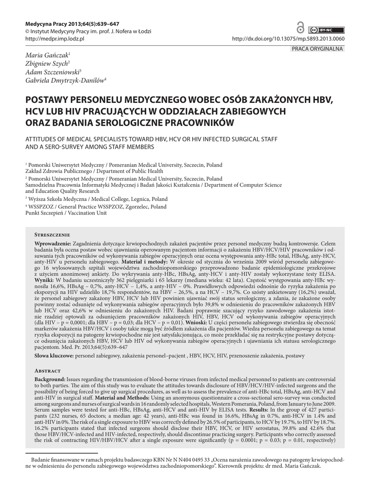 Medycyna Pracy 2013;64(5):639–647 © Instytut Medycyny Pracy im. prof. J. Nofera w Łodzi http://medpr.imp.lodz.pl http://dx.doi.org/10.13075/mp.5893.2013.0060 Maria Gańczak1 Zbigniew Szych2 Adam Szczeniowski3 Gabriela Dmytrzyk-Danilów4 PRACA ORYGINALNA POSTAWY PERSONELU MEDYCZNEGO WOBEC OSÓB ZAKAŻONYCH HBV, HCV LUB HIV PRACUJĄCYCH W ODDZIAŁACH ZABIEGOWYCH ORAZ BADANIA SEROLOGICZNE PRACOWNIKÓW ATTITUDES OF MEDICAL SPECIALISTS TOWARD HBV, HCV OR HIV INFECTED SURGICAL STAFF AND A SERO-SURVEY AMONG STAFF MEMBERS Pomorski Uniwersytet Medyczny / Pomeranian Medical University, Szczecin, Poland Zakład Zdrowia Publicznego / Department of Public Health 2 Pomorski Uniwersytet Medyczny / Pomeranian Medical University, Szczecin, Poland Samodzielna Pracownia Informatyki Medycznej i Badań Jakości Kształcenia / Department of Computer Science and Education Quality Research 3 Wyższa Szkoła Medyczna / Medical College, Legnica, Poland 4 WSSPZOZ / General Practice WSSPZOZ, Zgorzelec, Poland Punkt Szczepień / Vaccination Unit 1 Streszczenie Wprowadzenie: Zagadnienia dotyczące krwiopochodnych zakażeń pacjentów przez personel medyczny budzą kontrowersje. Celem badania była ocena postaw wobec ujawniania operowanym pacjentom informacji o zakażeniu HBV/HCV/HIV pracowników i odsuwania tych pracowników od wykonywania zabiegów operacyjnych oraz ocena występowania anty-HBc total, HBsAg, anty-HCV, anty-HIV u personelu zabiegowego. Materiał i metody: W okresie od stycznia do września 2009 wśród personelu zabiegowego 16 wylosowanych szpitali województwa zachodniopomorskiego przeprowadzono badanie epidemiologiczne przekrojowe z użyciem anonimowej ankiety. Do wykrywania anty-HBc, HBsAg, anty-HCV i anty-HIV zostały wykorzystane testy ELISA. Wyniki: W badaniu uczestniczyły 362 pielęgniarki i 65 lekarzy (mediana wieku: 42 lata). Częstość występowania anty-HBc wynosiła 16,6%, HBsAg – 0,7%, anty-HCV – 1,4%, a anty-HIV – 0%. Prawidłowych odpowiedzi odnośnie do ryzyka zakażenia po ekspozycji na HIV udzieliło 18,7% respondentów, na HBV – 26,5%, a na HCV – 19,7%. Co szósty ankietowany (16,2%) uważał, że personel zabiegowy zakażony HBV, HCV lub HIV powinien ujawniać swój status serologiczny, a zdania, że zakażone osoby powinny zostać odsunięte od wykonywania zabiegów operacyjnych było 39,8% w odniesieniu do pracowników zakażonych HBV lub HCV oraz 42,6% w odniesieniu do zakażonych HIV. Badani poprawnie szacujący ryzyko zawodowego zakażenia istotnie rzadziej optowali za odsunięciem pracowników zakażonych HIV, HBV, HCV od wykonywania zabiegów operacyjnych (dla HIV – p = 0,0001; dla HBV – p = 0,03; dla HCV – p = 0,01). Wnioski: U części personelu zabiegowego stwierdza się obecność markerów zakażenia HBV/HCV i osoby takie mogą być źródłem zakażenia dla pacjentów. Wiedza personelu zabiegowego na temat ryzyka ekspozycji na patogeny krwiopochodne nie jest satysfakcjonująca, co może przekładać się na restrykcyjne postawy dotyczące odsunięcia zakażonych HBV, HCV lub HIV od wykonywania zabiegów operacyjnych i ujawniania ich statusu serologicznego pacjentom. Med. Pr. 2013;64(5):639–647 Słowa kluczowe: personel zabiegowy, zakażenia personel–pacjent , HBV, HCV, HIV, przenoszenie zakażenia, postawy Abstract Background: Issues regarding the transmission of blood-borne viruses from infected medical personnel to patients are controversial to both parties. The aim of this study was to evaluate the attitudes towards disclosure of HBV/HCV/HIV-infected surgeons and the possibility of being forced to give up surgical procedures, as well as to assess the prevalence of anti-HBc total, HBsAg, anti-HCV and anti-HIV in surgical staff. Material and Methods: Using an anonymous questionnaire a cross-sectional sero-survey was conducted among surgeons and nurses of surgical wards in 16 randomly selected hospitals, Western Pomerania, Poland, from January to June 2009. Serum samples were tested for anti-HBc, HBsAg, anti-HCV and anti-HIV by ELISA tests. Results: In the group of 427 participants (232 nurses, 65 doctors; a median age: 42 years), anti-HBc was found in 16.6%, HBsAg in 0.7%, anti-HCV in 1.4% and anti-HIV in 0%. The risk of a single exposure to HBV was correctly defined by 26.5% of participants, to HCV by 19.7%, to HIV by 18.7%. 16.2% participants stated that infected surgeons should disclose their HBV, HCV, or HIV serostatus, 39.8% and 42.6% that those HBV/HCV-infected and HIV-infected, respectively, should discontinue practicing surgery. Participants who correctly assessed the risk of contracting HIV/HBV/HCV after a single exposure were significantly (p = 0.0001; p = 0.03; p = 0.01, respectively) Badanie finansowane w ramach projektu badawczego KBN Nr N N404 0495 33 „Ocena narażenia zawodowego na patogeny krwiopochodne w odniesieniu do personelu zabiegowego województwa zachodniopomorskiego”. Kierownik projektu: dr med. Maria Gańczak. 640 M. Gańczak i wsp. Nr 5 less likely to favor infected staff being forced to discontinue surgical procedures. Conclusions: A fraction of surgical staff showed detectable markers of HBV/HCV infection, they may be a source of infection for operated patients. Surgical staff ’s knowledge about occupational blood exposure risk was not satisfactory, which might have influenced the restrictive attitudes to force those infected with HBV/HCV/HIV to give up surgical procedures and a willingness to disclose their serological status. Med Pr 2013;64(5):639–647 Key words: surgical staff, cross infections, HBV, HCV, HIV, infection transmission, attitudes Autorka do korespondencji / Corresponding author: Maria Gańczak, Zakład Zdrowia Publicznego, Wydział Nauk o Zdrowiu, Pomorski Uniwersytet Medyczny, ul. Żołnierska 48, 71-204 Szczecin, e-mail: [email protected] Nadesłano: 16 lipca 2013, zatwierdzono: 30 października 2013 WPROWADZENIE Coroczne raporty publikowane przez Instytut Medycyny Pracy im. prof. J. Nof