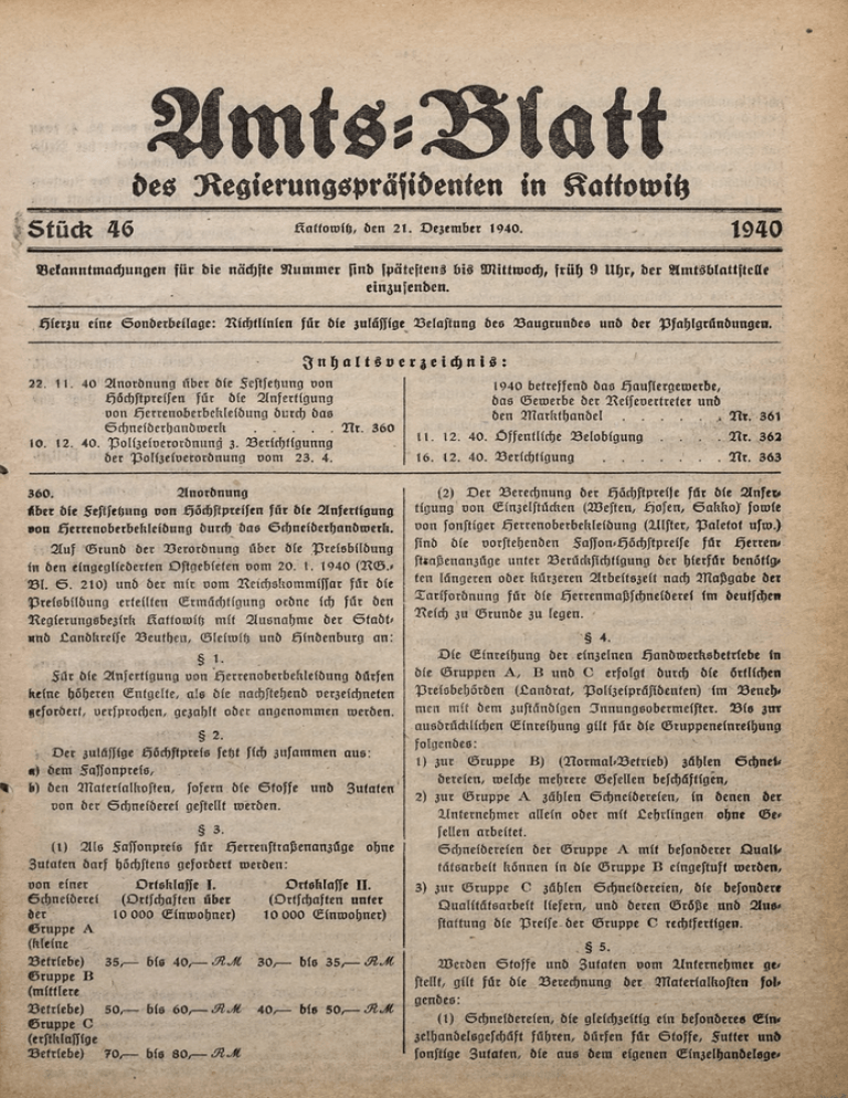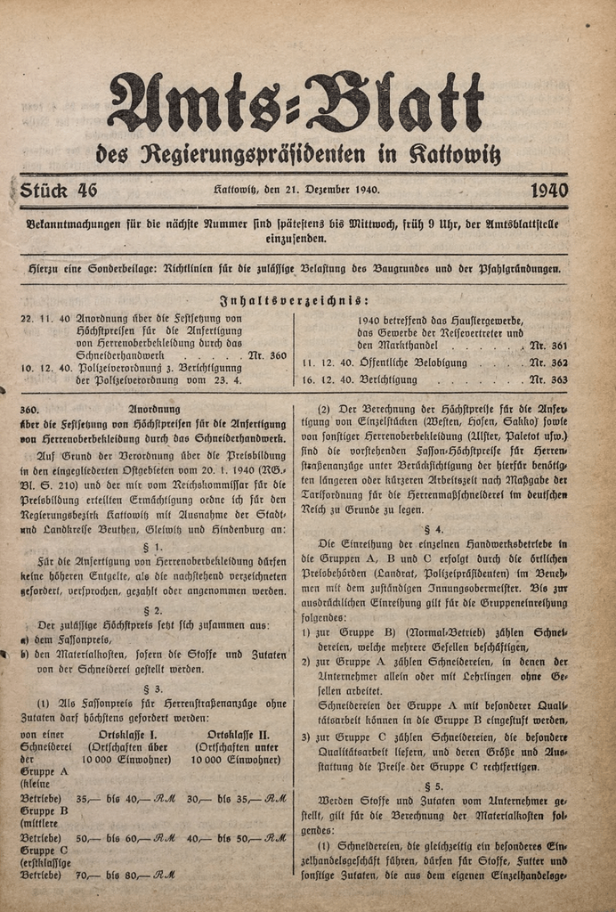 b e s 3R egiem n g6p r(i< ii> en (en iti S a f f o t o ii) Stück 46 1940 ß a ffo r o ü j, Öen 2 t . O eje r a b e r 1 9 4 0 . ® e !o m ttm n d )u n g en fü r bic nödjfte S tu m m er (inb fpoteftend bid OJiittroorifj, früf) 9 U ljr, b er S lm td b lattftcö e ein ju fen b en . Q fttju ein e © o n b e tb e ü a g c : R ic h tlin ie n fü r b ie 3u lä flfg e 23c(affn n g b to 2 3 a u g r u n b ee u n b ber p fa fjig tftn b u n g e n . ^ n lja ltd D e r je td jn id : 2 2 . 1 1 . 4 0 2 ln o r ö n u n g über b(e S cftfefn m g o o n £) 6 cf)ftpre(fen fü r b(c 2 ln fer ((g u n g o o n fjerren ob erb cfrtefb u n g butcf) baa ........................ R t . 3 6 0 6 ri)ne(bctl)anóm er[t 1 0 . 12 . 4 0 . P o K s e io c r o tb m m g 3. 23er(rf)f(gunng ber P o [ ( 3e (o c to r b n n n g o o m 2 3 . 4 . 360. 2 ln o tb n u n g Uber d ie 5 tftftb itn g o o n H ód jftp reffen fu r b it A n fe r tig u n g e o n £ )e u c n o b e tb e b lc1 b u n g burd) bno G cb n elb eth an b ro erh . A u f © r u n d ber B e r o r d n u n g über bie P r e is b ild u n g In b en eln g eg lfcb erfen O stg eb ieten o o m 2 0 . I. 1 9 4 0 (R © .* B I . 6 . 210 ) unb ber m ir o o m R e ic h sh o m m lffa t fü r bie P r e is b ild u n g erteilten (E rm ächtigung ocb nc Ich fü r ben R e g ie r u n g sb e z ir k ß a f fo w llj m it A u s n a h m e ber 6 tabt< u nd £ a n b k re1 fc B c u fh e u , © le lw lh u n b filn b e n b u r g a n : § 1. 5 ür bie 21n fc r t 1g u n g o o n E jetren o b etb eh lelb u n g b ü tfen k ein e höheren (E n tg elte, a ls bie nachftehenb o erjelch n eten g eford ert, oerfprochcn, g ez a h lt ober a n g e n o m m e n w erb en . § 2. D er «) dem b) ben oon ju lä fflg e H öch stpreis fekf fleh ju fa m m e n a u s: 5 a ffo n p re(s, A la fe r fa lk o fte n , fofern d ie G to ffe u n b S u ta te n der G cb n efö erel g eftellt w erb en . § 3. ( t ) A l s S o ffo n p te ls fü r Q erreu ftr a ß e n a n zü g e S u ta te n d a rf hóchftens gefo rd ert w erd en : ohne o o n e in e t O r tsk la ffe I. O r ts h la ffe II. G ch n elb erel (O rtfch a ften über (O rtfch affen u n ter ber 10 000 (E in w o h n er) 10 000 (E in w o h n er) G ruppe A (k lein e B e tr ie b e ) 3 5 ^ - b is 4 0 ,— J M l 3 0 ,— b is 3 5 ,— M J i G ruppe B (m ittlere B e tr ie b e ) 5 0 ,— b is 6 0 ,— <21J t 4 0 ,— b is 5 0 ,— <21J t G ru p p e C (erftk la fflg e B e tr ie b e ) 7 0 ,— b is 8 0 ,— 21 J i 1 9 4 0 betreffend b a e .Q au ftetg em etb e, b a s (B ew erbe b e t R e lfe a e c tr e fe r unb ben R I a r l t t b a n ö e l .......................... R t . 361 11 . 12 .4 0 . ö ffe n tlic h e B e lo b ig u n g 16. 12 .4 0 . B e r ic h tig u n g . . . . R r. 362 R r. 363 ( 2 ) D e r B e r ec h n u n g b et fjö cb ftp te lfe fü r d ie A n fet* tlg u n g o o n © In zelftü ck cn (Z öeftcn , H o fe n , G a k k o ) fo m le o o n fo n ftlg er ß e r r e n o b e tb e k le lb u n g ( lllf t e r , P a le t o t u fw .) find d ie o o rfteh en b en S a ffo w fjö c h ftp r e lfe fü r Ę etrcn # ftra ß e n a n z ü g e u n ter B erü ck sich tig u n g ber hierfü r benötig# ten lä n g e ren ober kürzeren A r b e itsz e it nach R la ß g a b e b et T a r ifo r d n u n g fü r d ie Q erren m a ß fch n elb erel (m beutfehen R eich zu © r u n d e zu leg en . § 4. D i e © In r eih u n g b et e in ze ln e n H a n d w e r k sb e trie b e In d ie © r u p p e n A , B u n d C erfo lg t durch d ie örtlichen P r e ls b e h ö td e n (£ a n ä r a t , P o liz e ip r ä sid e n te n ) Im B enefj» m en m it dem zu stä n d ig en D n n u n g so b e r m e lfte r . B i s z n t a u sd rü ck lich en © In r e lh u n g g ilt fü r die © tu p p e n e ln r e lh u n g fo lg e n d es: 1 ) zur © r u p p e B ) (R o r m a b B e tr le b ) zä h le n G cbnei* b e te lc n , w elche m ehrere © e fe lle n b efch äftlgen , 2) zur © r u p p e A zä h le n G c h n c lä e te le n , In d en en ber R n ter n e h m e r a llein oder m it £ eb i'U n g en o h n e © e# feilen a rb eitet. G ch n eld erelen der © r u p p e A m it befon derer jQ uall# fä fsn r b elt k ö n n en ln d ie © r u p p e B eln g eftu ft w er d e n , 3) zur © r u p p e C zä h le n G ch n eld erelen , die b efan d et* Q u a litä ts a r b e it liefern , u n b b e te n © r ö ß e u n b A n s» fta ttu n g die R t e lf e der © r u p p e C rechtfertigen . § 5. W e rd e n G to ffe und S u ta te n o o m R n ter n e h m e r ge# Stellt, g ilt fü r d ie B er e c h n u n g der A T aferla lh o ften fol# g e n ä e s: ( t ) G ch n eld erelen , d ie g leich zeitig ein b efo n ä e r e s © ln * z e th a n ä elsg e fd jä ft fü h ren , d ü rfen fü r G to ffe , S u tte r u n b fo n ftlg e S u ta te n , die a u s dem eig e n e n © In zelh an b elsge« 361. p o lis e io e r o tb m r o g febäft en tn o m m e n w e r b e n , böcbftens b ie nach b et P e to r b « 3« t D e ttr fjfig n n g b et P o lis e io c t o tb n u n g oora 2 3 . 4 . 1 9 4 0 n u n g b es O b erp rä fib en ten b et P r o o in s G cbtefien — P r e is« b itb u n g sftetle — über b ie P r e is b itb u n g b et S p in n fto ffe b efteffen b b a s f ja u fic tg e w e tb e , b a s © cr o e tb e b t t P e ife « u n b S p in n fto ffw a r e n im © in s e lb a n b e l o o m 24. 11. 1939 B e tite le t u n b ben 2T la th fb a n b el. ( P e g . A m ts b la tt P t . 3) su tä ffig e n A u ffd jlä g e a u f ihre A u f © tu n b b et P e r o r ö n u n g b es C h e fs b et 3 io (lo e t« fatfäcfjticfjcn © in b a u fs p r e ife berechnen. w a lfu n g ü b e t b(e p a n b lja b u n g b et P o lis e ig e m a lt o o m (2 ) G cb n eib ereien , bie nicht g leich seitig ein b efon b eres 2 4 . 1 0 . 1 9 3 9 ( 2 3 0 3 1 . 2 3 t. 2 1 ) w ir b ,h ie r m it fü r ben P e « © in se tb a n b e lsg efcb ä ff fü h ren , b ü tfe n a ls 2 T lafetiaIh often g ie r u n g sb e sir k ß a tfo m itj oljne öle S ta b tk r e lfe © le im ifj, k e in e höheren P t e if e in A n fa t) b ri