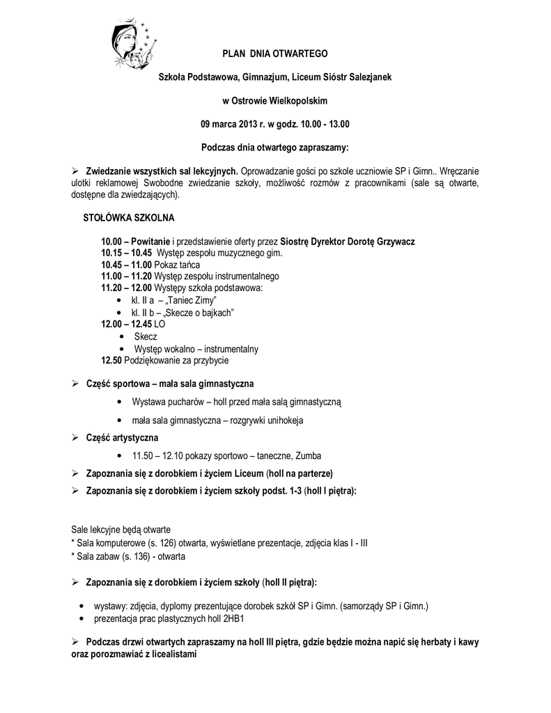 PLAN DNIA OTWARTEGO Szkoła Podstawowa, Gimnazjum, Liceum