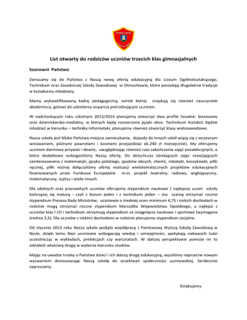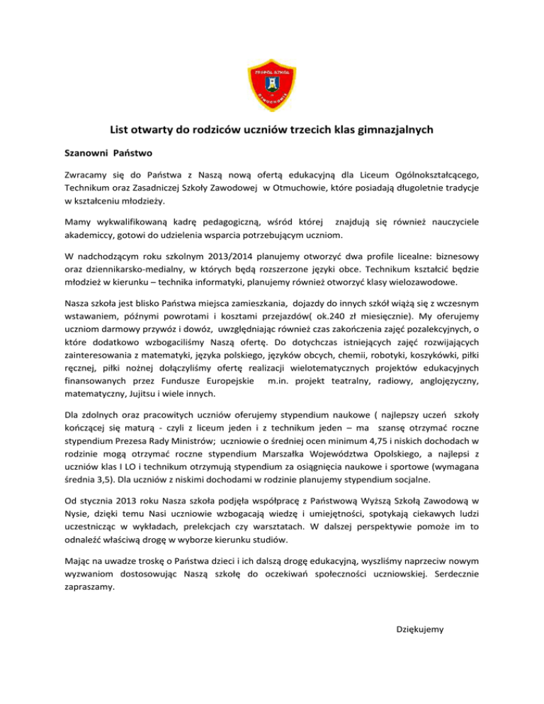 List otwarty do rodziców uczniów trzecich klas gimnazjalnych Szanowni Państwo Zwracamy się do Państwa z Naszą nową ofertą edukacyjną dla Liceum Ogólnokształcącego, Technikum oraz Zasadniczej Szkoły Zawodowej w Otmuchowie, które posiadają długoletnie tradycje w kształceniu młodzieży. Mamy wykwalifikowaną kadrę pedagogiczną, wśród której znajdują się również nauczyciele akademiccy, gotowi do udzielenia wsparcia potrzebującym uczniom. W nadchodzącym roku szkolnym 2013/2014 planujemy otworzyć dwa profile licealne: biznesowy oraz dziennikarsko-medialny, w których będą rozszerzone języki obce. Technikum kształcić będzie młodzież w kierunku – technika informatyki, planujemy również otworzyć klasy wielozawodowe. Nasza szkoła jest blisko Państwa miejsca zamieszkania, dojazdy do innych szkół wiążą się z wczesnym wstawaniem, późnymi powrotami i kosztami przejazdów( ok.240 zł miesięcznie). My oferujemy uczniom darmowy przywóz i dowóz, uwzględniając również czas zakończenia zajęć pozalekcyjnych, o które dodatkowo wzbogaciliśmy Naszą ofertę. Do dotychczas istniejących zajęć rozwijających zainteresowania z matematyki, języka polskiego, języków obcych, chemii, robotyki, koszykówki, piłki ręcznej, piłki nożnej dołączyliśmy ofertę realizacji wielotematycznych projektów edukacyjnych finansowanych przez Fundusze Europejskie m.in. projekt teatralny, radiowy, anglojęzyczny, matematyczny, Jujitsu i wiele innych. Dla zdolnych oraz pracowitych uczniów oferujemy stypendium naukowe ( najlepszy uczeń szkoły kończącej się maturą - czyli z liceum jeden i z technikum jeden – ma szansę otrzymać roczne stypendium Prezesa Rady Ministrów; uczniowie o średniej ocen minimum 4,75 i niskich dochodach w rodzinie mogą otrzymać roczne stypendium Marszałka Województwa Opolskiego, a najlepsi z uczniów klas I LO i technikum otrzymują stypendium za osiągnięcia naukowe i sportowe (wymagana średnia 3,5). Dla uczniów z niskimi dochodami w rodzinie planujemy stypendium socjalne. Od stycznia 2013 roku Nasza szkoła podjęła współpracę z Państwową Wyższą Szkołą Zawodową w Nysie, dzięki temu Nasi uczniowie wzbogacają wiedzę i umiejętności, spotykają ciekawych ludzi uczestnicząc w wykładach, prelekcjach czy warsztatach. W dalszej perspektywie pomoże im to odnaleźć właściwą drogę w wyborze kierunku studiów. Mając na uwadze troskę o Państwa dzieci i ich dalszą drogę edukacyjną, wyszliśmy naprzeciw nowym wyzwaniom dostosowując Naszą szkołę do oczekiwań społeczności uczniowskiej. Serdecznie zapraszamy. Dziękujemy