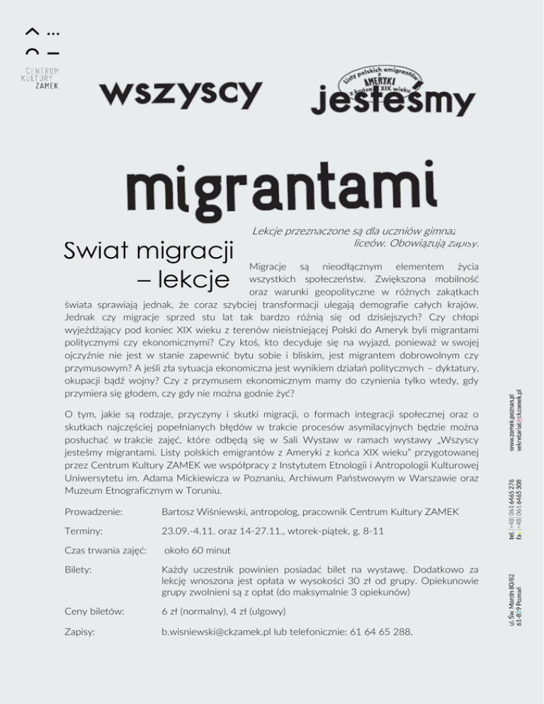 Świat migracji – lekcje Lekcje przeznaczone są dla uczniów gimnazjów i liceów. Obowiązują zapisy. Migracje są nieodłącznym elementem życia wszystkich społeczeństw. Zwiększona mobilność oraz warunki geopolityczne w różnych zakątkach świata sprawiają jednak, że coraz szybciej transformacji ulegają demografie całych krajów. Jednak czy migracje sprzed stu lat tak bardzo różnią się od dzisiejszych? Czy chłopi wyjeżdżający pod koniec XIX wieku z terenów nieistniejącej Polski do Ameryk byli migrantami politycznymi czy ekonomicznymi? Czy ktoś, kto decyduje się na wyjazd, ponieważ w swojej ojczyźnie nie jest w stanie zapewnić bytu sobie i bliskim, jest migrantem dobrowolnym czy przymusowym? A jeśli zła sytuacja ekonomiczna jest wynikiem działań politycznych – dyktatury, okupacji bądź wojny? Czy z przymusem ekonomicznym mamy do czynienia tylko wtedy, gdy przymiera się głodem, czy gdy nie można godnie żyć? O tym, jakie są rodzaje, przyczyny i skutki migracji, o formach integracji społecznej oraz o skutkach najczęściej popełnianych błędów w trakcie procesów asymilacyjnych będzie można posłuchać w trakcie zajęć, które odbędą się w Sali Wystaw w ramach wystawy „Wszyscy jesteśmy migrantami. Listy polskich emigrantów z Ameryki z końca XIX wieku” przygotowanej przez Centrum Kultury ZAMEK we współpracy z Instytutem Etnologii i Antropologii Kulturowej Uniwersytetu im. Adama Mickiewicza w Poznaniu, Archiwum Państwowym w Warszawie oraz Muzeum Etnograficznym w Toruniu. Prowadzenie: Bartosz Wiśniewski, antropolog, pracownik Centrum Kultury ZAMEK Terminy: 23.09.-4.11. oraz 14-27.11., wtorek-piątek, g. 8-11 Czas trwania zajęć: około 60 minut Bilety: Każdy uczestnik powinien posiadać bilet na wystawę. Dodatkowo za lekcję wnoszona jest opłata w wysokości 30 zł od grupy. Opiekunowie grupy zwolnieni są z opłat (do maksymalnie 3 opiekunów) Ceny biletów: 6 zł (normalny), 4 zł (ulgowy) Zapisy: [email protected] lub telefonicznie: 61 64 65 288.