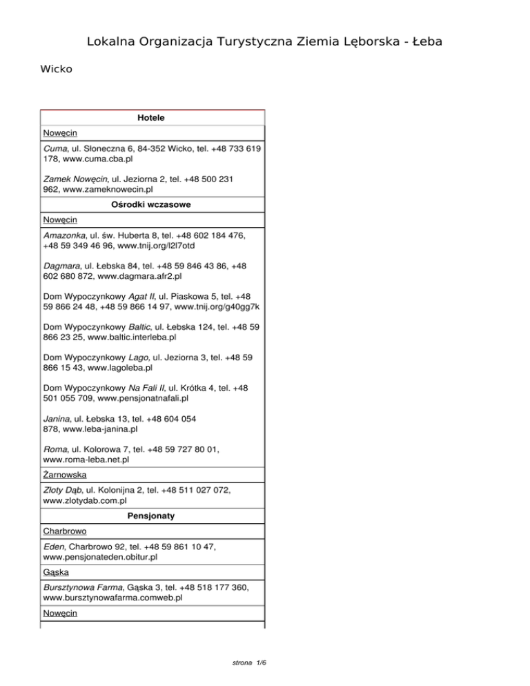 Lokalna Organizacja Turystyczna Ziemia Lęborska - Łeba Wicko Hotele Nowęcin Cuma, ul. Słoneczna 6, 84-352 Wicko, tel. +48 733 619 178, www.cuma.cba.pl Zamek Nowęcin, ul. Jeziorna 2, tel. +48 500 231 962, www.zameknowecin.pl Ośrodki wczasowe Nowęcin Amazonka, ul. św. Huberta 8, tel. +48 602 184 476, +48 59 349 46 96, www.tnij.org/l2l7otd Dagmara, ul. Łebska 84, tel. +48 59 846 43 86, +48 602 680 872, www.dagmara.afr2.pl Dom Wypoczynkowy Agat II, ul. Piaskowa 5, tel. +48 59 866 24 48, +48 59 866 14 97, www.tnij.org/g40gg7k Dom Wypoczynkowy Baltic, ul. Łebska 124, tel. +48 59 866 23 25, www.baltic.interleba.pl Dom Wypoczynkowy Lago, ul. Jeziorna 3, tel. +48 59 866 15 43, www.lagoleba.pl Dom Wypoczynkowy Na Fali II, ul. Krótka 4, tel. +48 501 055 709, www.pensjonatnafali.pl Janina, ul. Łebska 13, tel. +48 604 054 878, www.leba-janina.pl Roma, ul. Kolorowa 7, tel. +48 59 727 80 01, www.roma-leba.net.pl Żarnowska Złoty Dąb, ul. Kolonijna 2, tel. +48 511 027 072, www.zlotydab.com.pl Pensjonaty Charbrowo Eden, Charbrowo 92, tel. +48 59 861 10 47, www.pensjonateden.obitur.pl Gąska Bursztynowa Farma, Gąska 3, tel. +48 518 177 360, www.bursztynowafarma.comweb.pl Nowęcin strona 1/6 Hubertus, ul. Łebska 126, tel. +48 59 866 21 33, www.pensjonathubertus.twojobiekt.pl Jolka, ul. Miła 3, tel. +48 512 030 303, +48 503 580 932, www.pensjonatjolka.pl Krystyna, ul. Łebska 128, tel. +48 59 866 21 27, www.krystyna.interleba.pl Słoneczny Dom, ul. Słoneczna 20, tel. +48 59 863 93 11, +48 502 336 665, www.pensjonatwlebie.pl Apartamenty Żarnowska Figaro, ul. Lęborska 18/6, tel. +48 601 650 675, www.apartamentfigaro.pl Julia, ul. Lęborska 18a/4, tel. +48 605 427 741, www.apartamentjulia.pl Marinera, ul. Lęborska 18d/5, tel. +48 512 267 933, www.apartamentmarinera.pl Słoneczny, ul. Wydmowa 1c/4, tel. +48 693 932 501, www.zarnowska.nadmorzem.net/wydmowa1 Pokoje gościnne Charbrowo Ewa Staniecka, Charbrowo 86a, tel. +48 609 041 501, www.teleadreson.pl/pomorskie/wicko/pokojegoscinne-c8124fcf71.html Maja, Charbrowo 93, tel. +48 708 477 507, www.tnij.org/z25zzzf U Anki, ul. Liliowa 3, tel. +48 518 776 509, www.meteorturystyka.pl/uanki-charbrowo,charbrowo.html Łebieniec Gościniec pod Łebą, Łebieniec 2, tel. +48 788 305 944, +48 533 445 777, www.gosciniecpodleba.pl Nowęcin Akacja, ul. Relaksowa 27, tel. +48 59 866 20 55, +48 885 345 945, www.leba.pomorskie.pl/akacja-oferta.html Aleksandra, ul. Słoneczna 1, tel. +48 663 205 229, www.tnij.org/4as8lco Alicja, ul. Sportowa 6, tel. +48 606 643 284, www.alicjaleba.pl Bronk, ul. Słoneczna 8, tel. +48 606 661 627, www.fajnewczasy.pl/noclegi/nowecin/pokoje_goscinne/ 17008 strona 2/6 Darek, ul. Sportowa 8, tel. +48 608 101 341, www.darek-leba.pl Dawid, ul. Relaksowa 9, tel. +48 693 955 884, www.pokojedawid.pl Dorota, ul. Słoneczna 12, tel. +48 59 866 19 06, www.tnij.org/zqz8ge8 Elwira, ul. Łebska 82, tel. +48 600 571 585, www.meteor-turystyka.pl/lebapokoje,nowecin.html Fregata, ul. Łebska 130, tel. +48 59 866 23 17, www.meteor-turystyka.pl/fregata-nowecin,leba.html Jadwiga, ul. Sportowa 44, tel. +48 661 064 781, www.tnij.org/z36la6j Mariola, ul. Łebska 134, tel. +48 59 866 26 06, www.tnij.org/djd6c3c Oliwka, ul. Łebska 28, tel. +48 792 521 976, www.oliwka-leba.pl Perła Bałtyku, ul. Relaksowa 19, tel. +48 504 706 927, www.tnij.org/15z4lld Piratka, ul. Łebska 26, tel. +48 606 507 028, www.tnij.org/hkjelk4 Stadnina Koni Maciukiewicz, ul. św. Huberta 4, tel. +48 59 866 18 74, www.nowecin.com.pl U Janeczki, ul. Łebska 14, tel. +48 59 866 18 34, www.tnij.org/y6vck80 Villa Sillenzio, ul. Spokojna 9, tel. +48 600 023 355, www.villasillenzio.pl Willa REMEDIOS, ul. Łebska 2, tel. +48 59 866 20 97, www.remedios.afr.pl Willa Wenus, ul Polanki 19, tel. +48 602 552 396, www.meteor-turystyka.pl/wenus-nowecin,nowecin.html Wizygran, ul. Wczasowa 7, tel. +48 603 883 069, www.meteor-turystyka.pl/wizygran,nowecin.html Woronowicz, ul. Łebska 144, tel. +48 59 866 26 06, www.meteor-turystyka.pl/woronowicz,nowecin.html Zacisze, ul. Relaksowa 23, tel. +48 59 866 17 95, +48 503 988 870, www.tnij.org/szgs0e2 Szczenurze Wanda, Szczenurze 65, tel. +48 695 919 682, www.szczenurze.com strona 3/6 Żarnowska Gosia, ul. Lęborska 1b, tel. +48 59 866 28 63, +48 514 141 082, www.gosia.afr.pl Kasieńka, ul. Jeziorna 30, tel. +48 59 866 21 00, +48 783 032 477, www.eholiday.pl/noclegi-hl3696.html Pod Bocianem, ul. Jeziorna 17, tel. +48 59 866 22 53, +48 604 430 237, www.tnij.org/qtlv4ce Pod Różami, ul. Jeziorna 14a, tel. +48 59 866 16 64, +48 662 001 962, www.tnij.org/89k8z1x Rezydencja nad jeziorem Łebsko, ul. Jeziorna 21a, tel. +48 59 866 28 29, www.rezydencja-porta-baltic.pl U Asi, ul. Rolna 16, tel. +48 691 716 021, www.tnij.org/bqs9hx5 Domki letniskowe Charbrowo Chmielewski Kazimierz, Charbrowo 28, tel. +48 501 631 436, www.e-wczasy.pl/domki-letniskowecharbrowo-leba,4383 Domki u Kazi, Charbrowo 59, tel. +48 667 375 310, www.eholiday.pl/noclegi-ja1029.html Nowęcin Alkana, ul. Łebska 9, tel. +48 509 842 996, www.alkana.za.pl Dworek Łeba, ul. Polanki 11-13, tel. +48 59 842 15 55, +48 662 052 447, www.dworekleba.pl Holiday Park Kacze Stawy, ul. Żwirowa 10, tel. +48 59 866 29 00, www.kaczestawy.pl Joanna, ul. Krótka 5, tel. +48 59 842 27 96, +48 607 242 177, www.leba-domki.com.pl Ranczo, ul. Polanki 28, tel. +48 59 866 25 45, +48 784 923 702, www.eholiday.pl/noclegi-nd8619.html U Jacka, ul. Łebska 37/1, tel. +48 505 969 062, www.tnij.org/b688erx Szczenurze Asia, Szczenurze 25, tel. +48 609 472 940, +48 601 838 179, www.tnij.org/kuidc78 U Jadzi, Szczenurze 36, tel. +48 608 732 971, www.eholiday.pl/noclegi-vn0301.html Wicko Domek za stodołą, Wicko 2, tel. +48 724 977 353, www.tnij.org/z0sz4wm strona 4/6 Żarnowska Benia, ul. Lęborska 15, tel. +48 59 866 28 61, +48 698 991 600, www.benia.dobrynocleg.pl Betty, ul. Rolna 17, tel. +48 698 534 073, www.tnij.org/70l6n7x Bursztynowy Dworek, ul. Jeziorna 23, tel. +48 698 485 903, www.bursztynowydworek.pl DajaN, ul. Jezio