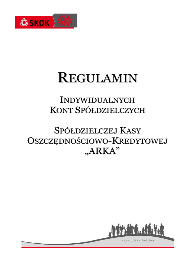 REGULAMIN INDYWIDUALNYCH KONT SPÓŁDZIELCZYCH SPÓŁDZIELCZEJ KASY OSZCZĘDNOŚCIOWO-KREDYTOWEJ „ARKA” REGULAMIN IKS DLA CZŁONKÓW SKOK „ARKA” Uchwała nr 6/2012 z 11.10.2012 I. Postanowienia ogólne §1 Regulamin określa zasady prowadzenia przez Spółdzielczą Kasę Oszczędnościowo-Kredytową „ARKA” z siedzibą w Dąbrowie Górniczej, ul. 11 Listopada 24 kod pocztowy 41-300 wpisaną do Krajowego Rejestru Sądowego prowadzonego przez Sąd Rejonowy w Częstochowie Wydział XVII Gospodarczy KRS pod numerem KRS 0000061786, NIP 573-02-57-553, której główne miejsce wykonywania działalności znajduje się w Dąbrowie Górniczej, a informacja o wszystkich miejscach wykonywania przez nią działalności znajduje się w każdej placówce SKOK oraz na stronie internetowej www. skokarka.pl, adres mailowy: [email protected], zarejestrowaną w prowadzonym przez Komisję Nadzoru Finansowego rejestrze dostawców usług płatniczych pod nr SK26/2011, nad której działalnością w zakresie usług płatniczych nadzór sprawuje: do dnia 26.10.2012 - Krajowa Spółdzielcza Kasa Oszczędnościowo-Kredytowa z siedziba w Sopocie, ul. Władysława IV 22, od dnia 27.10.2012 r. Komisja Nadzoru Finansowego z siedziba w Warszawie, Plac Powstaoców Warszawy 1, 00-950 Warszawa, zwaną dalej SKOK lub Kasą, Indywidualnych Kont Spółdzielczych zwanych dalej „IKS”. §2 Użyte w dalszej części określenia oznaczają: 1. Data waluty – moment w czasie, od którego lub do którego dostawca nalicza odsetki od środków pieniężnych którymi obciążono lub uznano rachunek płatniczy. 2. Dostawca odbiorcy- bank, spółdzielcza kasa oszczędnościowo-kredytowa lub inny dostawca prowadzący rachunek, który ma zostad uznany kwotą wynikająca z Transakcji płatniczej. 3. Dostawca płatnika - SKOK. 4. Dzieo roboczy – dla przelewów, wpłat i wypłat gotówkowych dzieo od poniedziałku do piątku, z wyłączeniem dni ustawowo wolnych od pracy. 5. IKS, Rachunek – imienny rachunek prowadzony dla członka SKOK, będący rachunkiem płatniczym w rozumieniu ustawy z 19 sierpnia 2011 r. o usługach płatniczych (Dz.U. Nr 199, poz. 1175); 6. Kwota minimalna – kwota, którą Posiadacz IKS jest obowiązany utrzymywad na IKS, stanowiąca równowartośd 6-miesięcznych Obowiązkowych wpłat na IKS, z tym zastrzeżeniem, że w okresie pierwszych pięciu miesięcy następujących po otwarciu IKS jest to kwota stanowiąca równowartośd sumy Obowiązkowych wpłat na IKS, którą Posiadacz IKS obowiązany był zgromadzid w okresie od dnia otwarcia IKS. 7. Obowiązkowe wpłaty na IKS – comiesięczne wpłaty wnoszone przez Posiadacza IKS w zadeklarowanej przez niego wysokości, nie mniejszej str. 2 REGULAMIN IKS DLA CZŁONKÓW SKOK „ARKA” Uchwała nr 6/2012 z 11.10.2012 jednak niż określonej w Statucie, a w przypadku, gdy Statut tej kwoty nie określa - w uchwale Zarządu Kasy. 8. Odbiorca – osoba fizyczna, osoba prawna oraz jednostka organizacyjna nie będąca osobą prawną, której ustawa przyznaje zdolnośd prawną, będąca odbiorcą środków pieniężnych stanowiących przedmiot Transakcji płatniczej. 9. Płatnik - osoba składająca Zlecenie płatnicze. 10. Posiadacz IKS - członek Kasy, dla którego prowadzone jest Indywidualne Konto Spółdzielcze, 11. Transakcja płatnicza - zainicjowana przez Posiadacza IKS wpłata lub wypłata środków zgromadzonych na Rachunku. 12. Unikatowy identyfikator – numer rachunku bankowego. 13. Wolne środki – środki zgromadzone na Rachunku pomniejszone o Kwotę minimalną oraz o kwotę należną z tytułu dokonanych a nie rozliczonych Transakcji płatniczych, jak również o blokady z innych tytułów; 14. Zlecenie płatnicze – oświadczenie Płatnika skierowane do jego dostawcy zawierające polecenie wykonania Transakcji płatniczej. 15. Trwały nośnik informacji - nośnik umożliwiający Płatnikowi lub Odbiorcy przechowywanie adresowanych do niego informacji w sposób umożliwiający dostęp do nich przez okres odpowiedni do celów sporządzenia tych informacji i pozwalający na odtworzenie przechowywanych informacji w niezmienionej postaci. §3 1. IKS prowadzony jest w celu gromadzenia oszczędności członków Kasy, w szczególności w formie Obowiązkowych wpłat na IKS oraz w celu przeprowadzania rozliczeo w postaci wpłat, wypłat lub przelew środków na inny rachunek Posiadacza IKS w Kasie, na zlecenie Posiadacza IKS, z zastrzeżeniem ust. 2. Dla każdego członka SKOK prowadzony jest tylko jeden IKS. 2. Dla członków, dla których Kasa prowadzi, na zasadach określonych w odrębnym regulaminie, rachunek oszczędnościowo-rozliczeniowy (ROR), IKS jest prowadzony wyłącznie w celu gromadzenia Obowiązkowych wpłat. 3. Kasa może oferowad swoim członkom różne rodzaje rachunków IKS. §4 Zarząd Kasy może: a) w stosunku do emerytów i rencistów – zwolnid ich od obowiązku wnoszenia lub zmniejszyd wysokośd dokonywanych Obowiązkowych wpłat na IKS, str. 3 REGULAMIN IKS DLA CZŁONKÓW SKOK „ARKA” Uchwała nr 6/2012 z 11.10.2012 b) w stosunku do osób przebywających na urlopach bezpłatnych, macierzyoskich lub wychowawczych albo korzystających z zasiłku chorobowego i innych podobnych świadczeo – zawiesid obowiązek dokonywania Obowiązkowych wpłat na IKS lub zmniejszyd ich wysokośd, c) w stosunku do osób, dla których Kasa prowadzi wyłącznie rachunki oszczędnościowych lokat terminowych lub inne rachunki oszczędnościowe – zawiesid obowiązek dokonywania Obowiązkowych wpłat na IKS; możliwośd ta nie dotyczy członków, dla których Kasa prowadzi, na zasadach określonych w odrębnym regulaminie, rachunki oszczędnościowo-rozliczeniowe. § 5 1. IKS prowadzony jest w walucie polskiej. 2. Wpłaty na Rachunek, wypłaty, przelew środków na inny rachunek Posiadacza IKS w Kasie z Rachunku mogą byd dokonywane wyłącznie w walucie polskiej. II. Otwarcie IKS §6 1. Kasa otwiera i prowadzi IKS na imię i nazwisko Posia