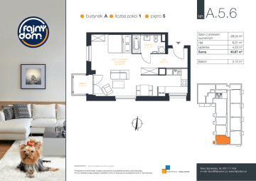 Salon z aneksem kuchennym 28,04 m2 Hall 8,31 m2 Łazienka 4,52 m2 Suma 40,87 m2 Balkon 3,10 m2