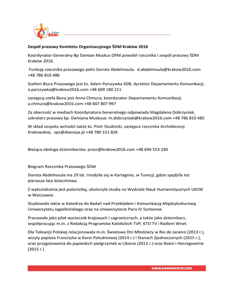 Zespół prasowy Komitetu Organizacyjnego ŚDM Kraków 2016 Koordynator Generalny Bp Damian Muskus OFM powołał rzecznika i zespół prasowy ŚDM Kraków 2016. Funkcję rzecznika prasowego pełni Dorota Abdelmoula. [email protected] +48 786 810 486 Szefem Biura Prasowego jest ks. Adam Parszywka SDB, dyrektor Departamentu Komunikacji, [email protected] +48 609 180 211 zastępcą szefa Biura jest Anna Chmura, koordynator Departamentu Komunikacji. [email protected] +48 607 807 997 Za obecność w mediach Koordynatora Generalnego odpowiada Magdalena Dobrzyniak, sekretarz prasowy bp. Damiana Muskusa: [email protected] +48 786 810 485 W skład zespołu wchodzi także ks. Piotr Studnicki, zastępca rzecznika Archidiecezji Krakowskiej. [email protected] +48 780 151 826 Bieżąca obsługa dziennikarska: [email protected] +48 694 553 330 Biogram Rzecznika Prasowego ŚDM Dorota Abdelmoula ma 29 lat. Urodziła się w Kartaginie, w Tunezji, gdzie spędziła też pierwsze lata dzieciństwa. Z wykształcenia jest polonistką, ukończyła studia na Wydziale Nauk Humanistycznych UKSW w Warszawie. Studiowała także w Katedrze do Badań nad Przekładem i Komunikacją Międzykulturową Uniwersytetu Jagiellońskiego oraz na Uniwersytecie Paris IV Sorbonne. Pracowała jako pilot wycieczek krajowych i zagranicznych, a także jako dziennikarz, współpracując m.in. z Redakcją Programów Katolickich TVP, KTO TV i Radiem Wnet. Dla Telewizji Polskiej relacjonowała m.in. Światowe Dni Młodzieży w Rio de Janeiro (2013 r.), wizyty papieża Franciszka w Korei Południowej (2014 r.) i Stanach Zjednoczonych (2015 r.), oraz przygotowania do papieskich pielgrzymek w Libanie (2012 r.) oraz Bośni i Hercegowinie (2015 r.) Posługuje się językiem francuskim, angielskim i włoskim. Dwukrotnie brała udział w Światowych Dniach Młodzieży (Madryt 2011, Rio 2013). (BP ŚDM)
