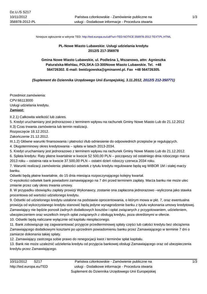 Dz.U./S S217 10/11/2012 356978-2012-PL Państwa członkowskie - Zamówienie publiczne na usługi - Dodatkowe informacje - Procedura otwarta 1/3 Niniejsze ogłoszenie w witrynie TED: http://ted.europa.eu/udl?uri=TED:NOTICE:356978-2012:TEXT:PL:HTML PL-Nowe Miasto Lubawskie: Usługi udzielania kredytu 2012/S 217-356978 Gmina Nowe Miasto Lubawskie, ul. Podleśna 1, Mszanowo, attn: Agnieszka Paturalska-Miehlau, POLSKA-13-300Nowe Miasto Lubawskie. Tel. +48 564726302. E-mail: [email protected]. Fax +48 564726305. (Suplement do Dziennika Urzędowego Unii Europejskiej, 3.11.2012, 2012/S 212-350771) Przedmiot zamówienia: CPV:66113000 Usługi udzielania kredytu. Zamiast: II.2.1) Całkowita wielkość lub zakres. 5. Kredyt uruchamiany jest jednorazowo z terminem wpływu na rachunek Gminy Nowe Miasto Lub do 21.12.2012 II.3) Czas trwania zamówienia lub termin realizacji. Rozpoczęcie 18.12.2012. Zakończenie 21.12.2012. III.1.2) Główne warunki finansowania i płatności i/lub odniesienie do odpowiednich przepisów je regulujących. 4. Długoterminowy okres kredytowania – spłata w latach 2013-2034. 5. Kredyt uruchamiany jest jednorazowo z terminem wpływu na rachunek Gminy Nowe Miasto Lub do 21.12.2012. 6. Spłata kredytu: Raty płatne kwartalnie w kwocie 52 500,00 PLN – począwszy od ostatniego dnia roboczego marca 2013 roku – ostatnia rata w kwocie 37.500,00 PLN – ostatni dzień roboczy czerwca 2034 roku. 7. Warunki realizacji zamówienia: płatności odsetek z tytułu kredytu regulowane będą wg WIBOR 1M i stałej marży banku. Odsetki będą płatne kwartalnie, do 15 dnia miesiąca rozpoczynającego kolejny kwartał. O wysokości odsetek bank powiadomi zamawiającego na 7 dni przed terminem zapłaty. Marża banku nie może ulec zmianie przez cały okres trwania umowy. 8. W przypadku obowiązku zapłaty prowizji Wykonawcy, zostanie ona zapłacona jednorazowo –wyliczona jako stawka procentowa od wartości udzielonego kredytu. 9. Odsetki od udzielonego kredytu ustalone na podstawie oprocentowania, o którym mowa w pkt. 7, oraz ewentualna prowizja od wykorzystanego kredytu stanowić będą jedyne wynagrodzenie banku z tytułu wykonania umowy kredytowej. Zamawiający nie będzie ponosił żadnych dodatkowych kosztów i opłat związanych z przygotowaniem, udzieleniem, ubezpieczeniem oraz wszelkich innych opłat związanych z obsługą kredytu, poza określonymi w ofercie. 10. Odsetki będą naliczane wyłącznie od kapitału niespłaconego. 11. Bank zobowiązuje się zagwarantować przyjęcie przedterminowej spłaty części lub całości kredytu bez obciążenia Zamawiającego dodatkowymi kosztami po uprzednim powiadomieniu banku przez Zamawiającego w terminie 7 dni o zamiarze dokonania takiej spłaty. 12. Zamawiający zastrzega sobie prawo do renegocjacji kwot i terminów spłat kapitału. 13. Bank nie może uzależnić udzielenia kredytu od przyjęcia bankowej obsługi Zamawiającego oraz od ubezpieczenia kredytu przez Zamawiającego. 10/11/2012 S217 http://ted.europa.eu/TED Państwa członkowskie - Zamówienie publiczne na usługi - Dodatkowe informacje - Procedura otwarta Suplement do Dziennika Urzędowego Unii Europejskiej 1/3 Dz.U./S S217 10/11/2012 356978-2012-PL Państwa członkowskie - Zamówienie publiczne na usługi - Dodatkowe informacje - Procedura otwarta 2/3 14. Wykonawca nie będzie wymagał innego zabezpieczenia zaciągniętego kredytu poza wekslem in blanco wraz z deklaracją wekslową. 15. Zamawiający informuje, że na stronie internetowej gminy: www.bip.gminanml.pl w zakładce „Majątek i finanse” dostępne są wszystkie informacje niezbędne do przygotowania oferty. III.1.3) Forma prawna, jaką musi przyjąć grupa wykonawców, której zostanie udzielone zamówienie. Wykonawcy występujący wspólnie muszą ustanowić pełnomocnika do reprezentowania ich w postępowaniu albo do reprezentowania w postępowaniu i zawarcia umowy w sprawie zamówienia publicznego. Dokument potwierdzający ustanowienie pełnomocnika powinien zawierać wskazanie postępowania o zamówienie publiczne, którego dotyczy, wykonawców ubiegających się wspólnie o udzielenie zamówienia, ustanowionego pełnomocnika oraz zakres jego umocowania także oświadczenie o przyjęciu wspólnej solidarnej odpowiedzialności za wykonanie lub nienależyte wykonanie zamówienia. Podpisany przez wszystkich wykonawców ubiegających się wspólnie o zamówienie publiczne. Podpisy muszą zostać złożone przez osoby uprawnione do składania oświadczeń woli wymienione we właściwym rejestrze lub wpisie do ewidencji działalności gospodarczej. Dokument pełnomocnika należy przedstawić w formie oryginału. Wszelka korespondencja oraz rozliczenia dokonywane będą wyłącznie z podmiotem występującym jako pełnomocnik. VI.3) Informacje dodatkowe. 1. Zamawiający wymagać będzie od wybranego Wykonawcy zawarcia umowy zgodnej z postanowieniami SIWZ. 2. Projekt umowy w sprawie zamówienia publicznego z uwzględnieniem treści Działu IV - ustawy, opracuje Wykonawca i załączy do oferty. 3. Zamawiający wymagać będzie od wybranego Wykonawcy zawarcia umowy zgodnej w szczególności z postanowieniami zawartymi w Rozdziale III i IV SIWZ. Powinno być: II.2.1) Całkowita wielkość lub zakres. 5. Kredyt uruchamiany jest jednorazowo z terminem wpływu na rachunek Gminy Nowe Miasto Lub do 27.12.2012 II.3) Czas trwania zamówienia lub termin realizacji. Rozpoczęcie 27.12.2012. Zakończenie 30.6.2034. III.1.2) Główne warunki finansowania i płatności i/lub odniesienie do odpowiednich przepisów je regulujących. 1. Długoterminowy okres kredytowania – spłata w latach 2013-2034. 2. Kredyt uruchamiany jest jednorazowo z terminem wpływu na rachunek Gminy Nowe Miasto Lub do 27.12.2012. 3. Spłata kredytu: Raty płatne kwartalnie w kwocie 52 500,00 PLN – począwszy od ostatniego dnia roboczego marca 2013 roku – ostatnia rata w kwocie 37 500,00 PLN – ostatni dzień roboczy czerwca 2034 roku. 4. Wa
