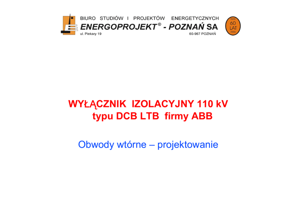WYŁĄCZNIK IZOLACYJNY 110 kV typu DCB LTB firmy ABB Obwody wtórne – projektowanie W projekcie łącznik DCB przewidziano w polu 110 kV transformatora 110/15 kV W polu 110 kV transformatora 110/15 kV jeden łącznik DCB zastąpił trzy istniejące aparaty: - odłącznik szynowy, - odłącznik szybki - uziemnik Łącznik DCB BLK wyposażony jest fabrycznie w powiązane między sobą trzy skrzynki napędów: skrzynkę napędu wyłącznika LTB skrzynkę napędu urządzenia blokującego (AD100) skrzynkę napędu uziemnika (AD350) Uniwersalne silniki napędów zasilane mogą być: napięciem stałym 220V DC lub napięciem przemiennym 230V AC OBWODY STERUJĄCE wyłącznika, urządzenia blokującego i uziemnika zasilane są napięciem stałym 220 V DC Uwzględniony w projekcie napęd wyłącznika LTB wyposażony jest w: jedną cewkę zamykającą (Y3) trzy cewki otwierające (Y1, Y2 i Y2.2) trzecia cewka wyłączająca przeznaczona jest do współpracy z zabezpieczeniem autonomicznym transformatora Na konstrukcji wyłącznika z funkcją odłącznika DCB zlokalizowane są trzy skrzynki napędów: skrzynka napędu uziemnika AD350 skrzynka napędu urządzenia blokującego AD100 skrzynka napędu wyłącznika LTB Połączenia pomiędzy poszczególnymi skrzynkami napędów wykonane są dostarczonymi przez Producenta kablami fabrycznymi Kable dla powiązań zewnętrznych łącznika DCB z szafką kablową pola 110 kV wyprowadzone są ze skrzynki napędu wyłącznika LTB SKRZYNKA NAPĘDU WYŁĄCZNIKA LTB Przełącznik wyboru poziomu sterowania łącznikiem DCB (lokalny lub zdalny). Przełączniki dedykowane do sterowania: wyłącznikiem urządzeniem blokującym uziemnikiem W zależności od wybranego przełącznikiem, w skrzynce napędu wyłącznika LTB, poziomu sterowania (lokalny lub zdalny) DCB może być sterowany: przy przełączniku ustawionym w pozycji sterowanie lokalne - ze skrzynki napędu wyłącznika przy przełączniku ustawionym w pozycji sterowanie zdalne - z szafki kablowej pola 110 kV, - z tablicy sterowniczo-przekaźnikowej w nastawni, - z telemechaniki Oprócz sterowania lokalnego z zainstalowanej na konstrukcji skrzynki napędu LTB w projekcie przewidziano: sterowanie wyłącznikiem, urządzeniem blokującym i uziemnikiem - przyciskami zainstalowanymi w szafce kablowej pola 110 kV sterowanie wyłącznikiem i urządzeniem blokującym - sterownikami zainstalowanymi na tablicy sterowniczo-przekaźnikowej ustawionej w nastawni odwzorowanie stanu położenia uziemnika - za pomocą wskaźnika położenia zainstalowanego na tablicy sterowniczo-przekaźnikowej ustawionej w nastawni sterowanie wyłącznikiem i urządzeniem blokującym - z systemu telemechaniki stacji odwzorowanie stanów położeń wyłącznika, urządzenia blokującego i uziemnika - w systemie telemechaniki stacji Łączniki DCB – fabryczne blokady elektryczne Przy zamkniętym wyłączniku: urządzenie blokujące jest nieaktywne, a jego sterowanie jest zablokowane uziemnik jest otwarty, a jego sterowanie jest zablokowane Łączniki DCB – fabryczne blokady elektryczne Przy otwartym wyłączniku i nieaktywnym urządzeniu blokującym: wyłącznik może być sterowany urządzenie blokujące może być sterowane sterowanie uziemnikiem jest zablokowane Łączniki DCB – fabryczne blokady elektryczne Przy otwartym wyłączniku i aktywnym urządzeniu blokującym: sterowanie wyłącznikiem jest zablokowane uziemnik może być sterowany Łączniki DCB – fabryczne blokady elektryczne Przy zamkniętym uziemniku: sterowanie wyłącznikiem jest zablokowane urządzenie blokujące jest w położeniu blokady, a jego sterowanie jest zablokowane Łączniki DCB – fabryczne blokady elektryczne Przy otwartym uziemniku i nieaktywnym urządzeniu blokującym: wyłącznik może być sterowany sterowanie uziemnikiem jest zablokowane Łączniki DCB – fabryczne blokady elektryczne Przy otwartym uziemniku i urządzeniu blokującym w położeniu blokady: wyłącznik jest otwarty, a jego sterowanie jest zablokowane uziemnik może być sterowany W projekcie łącznik DCB zastosowany został w polu 110 kV transformatora 110/15 kV. Oprócz elektrycznych blokad polowych zrealizowanych fabrycznie w łączniku DCB w projekcie przewidziano: dodatkową blokadę elektryczną sterowania urządzeniem blokującym przy zamkniętym uziemniku po stronie 15 kV transformatora 110/15 kV dodatkową blokadę elektryczną sterowania uziemnikiem przy zamkniętym odłączniku po stronie 15 kV transformatora 110/15 kV Korzyści z zastosowania łącznika DCB Fabrycznie zrealizowane elektryczne blokady polowe. Mniejsza ilość kabli sterowniczych ułożonych na terenie rozdzielni napowietrznej, ze skrzynek napędów łączników 110 kV do szafki kablowej pola. Szafka kablowa pola wyposażona w jedne, wspólne obwody okrężne zasilania silników napędów łączników 110 kV DZIĘKUJĘ ZA UWAGĘ Barbara Zagrocka