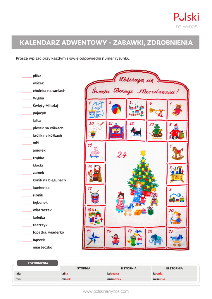 na wynos KALENDARZ ADWENTOWY - ZABAWKI, ZDROBNIENIA Proszę wpisać przy każdym słowie odpowiedni numer rysunku. ______ piłka ______ wózek ______ choinka na saniach ______ Wigilia ______ Święty Mikołaj ______ pajacyk ______ lalka ______ piesek na kółkach ______ królik na kółkach ______ miś ______ aniołek ______ trąbka ______ klocki ______ zamek ______ konik na biegunach ______ kuchenka ______ słonik ______ bębenek ______ wiatraczek ______ kolejka ______ teatrzyk ______ łopatka, wiaderko ______ bączek ______ miasteczko ZDROBNIENIA I STOPNIA II STOPNIA III STOPNIA lala lalka laleczka lalunia miś misiek misiaczek misiunio www.polskinawynos.com