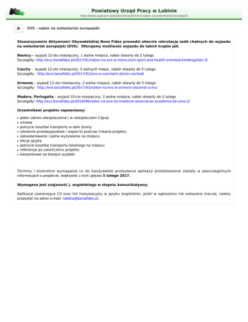 Powiatowy Urząd Pracy w Lubinie http://www.puplubin.pl/wydarzenie/267/evs-nabor-na-wolontariat-europejski EVS - nabór na wolontariat europejski Stowarzyszenie Aktywności Obywatelskiej Bona Fides prowadzi obecnie rekrutację osób chętnych do wyjazdu na wolontariat europejski (EVS). Oferujemy możliwość wyjazdu do takich krajów jak: Niemcy – wyjazd 12-sto miesięczny, 1 wolne miejsca, nabór otwarty do 5 lutego Szczegóły: http://evs.bonafides.pl/2017/01/nabor-na-evs-w-niemczech-sport-and-health-oriented-kindergarten-3/ Czechy - wyjazd 12-sto miesięczny, 5 wolnych miejsc, nabór otwarty do 5 lutego Szczegóły: http://evs.bonafides.pl/2017/01/evs-w-czechach-decko-nachod/ Armenia – wyjazd 12-sto miesięczny, 2 wolne miejsce, nabór otwarty do 5 lutego Szczegóły: http://evs.bonafides.pl/2017/01/nabor-na-evs-w-armenii-alaverdi-ccms/ Madera, Portugalia – wyjazd 10-cio miesięczny, 2 wolne miejsce, nabór otwarty do 5 lutego Szczegóły: http://evs.bonafides.pl/2016/06/nabor-na-evs-na-maderze-associacao-academia-da-uma-2/ Uczestnikowi projektu zapewniamy: ● ● ● ● ● ● ● ● ● pełen zakres ubezpieczenia ( w ubezpieczalni Cigna) umowę pokrycie kosztów transportu w obie strony szkolenie przedwyjazdowe i wsparcie podczas trwania projektu zakwaterowanie i pełne wyżywienie na miejscu lekcje języka pokrycie kosztów transportu lokalnego na miejscu referencje po zakończeniu projektu kieszonkowe na bieżące wydatki Terminy i konkretne wymagania co do kandydatów przesyłania aplikacji przedstawione zostały w poszczególnych informacjach o projekcie, większość z nich upływa 5 lutego 2017. Wymagana jest znajomość j. angielskiego w stopniu komunikatywny. Aplikacje zawierające CV oraz list motywacyjny w języku angielskim, jeżeli w ogłoszeniu nie wskazano inaczej, należy przesyłać na adres e-mail: [email protected].