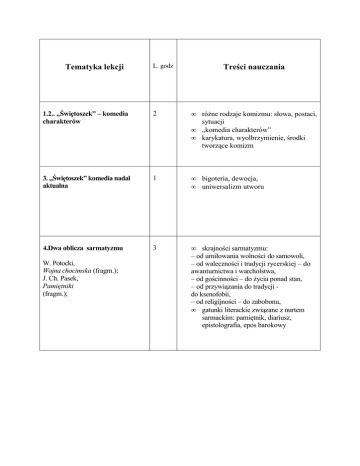Tematyka lekcji 1.2.. „Świętoszek” – komedia charakterów L. godz 2 Treści nauczania • • • różne rodzaje komizmu: słowa, postaci, sytuacji „komedia charakterów” karykatura, wyolbrzymienie, środki tworzące komizm bigoteria, dewocja, uniwersalizm utworu 3. „Świętoszek” komedia nadal aktualna 1 • • 4.Dwa oblicza sarmatyzmu 3 • skrajności sarmatyzmu: – od umiłowania wolności do samowoli, – od waleczności i tradycji rycerskiej – do awanturnictwa i warcholstwa, – od gościnności – do życia ponad stan, – od przywiązania do tradycji do ksenofobii, – od religijności – do zabobonu, • gatunki literackie związane z nurtem sarmackim: pamiętnik, diariusz, epistolografia, epos barokowy W. Potocki, Wojna chocimska (fragm.); J. Ch. Pasek, Pamiętniki (fragm.); 5. Sarmatyzm jako rodzima formacja kulturowa sarmatyzm, Sarmata, zespół wartości i postaw związanych z postacią Sarmaty, • kult rycerskości, cnoty sarmackie, wolność, honor, genealogie, tradycja, • koncepcja Rzeczypospolitej jako przedmurza chrześcijaństwa, • demokracja szlachecka 1 • • • • barok, kontrreformacja, kościoły jezuitów, styl barokowy (niepokój ruch, nieład, niejasność, dysharmonia, zmysłowość), 2 • • • • • • kult rozumu, wiedzy i wynalazków, człowiek ujarzmiający przyrodę, klasycyzm oświeceniowy i jego racjonalistyczne podłoże, oda, peryfraza, racjonalizm, empiryzm, człowiek jako tabula rasa • • • Powiastka filozoficzna Fatalista fatalizm determinizm J. Tazbir, Kultura szlachecka w dawnej Polsce 6. Synteza baroku prezentacje uczniowskie 7.Oświeceniowa wizja świata i miejsce w nim człowieka A. Naruszewicz „Balon” 8.Gdy odważono się użyć rozumu D.Diderot „Kubuś Fatalista i jego pan” fragm.. • • 1 1 9.10.. Patriotyzm czasów klęski 2 I. Krasicki, Hymn do miłości Ojczyzny • czasy stanisławowskie; próby ratowania kraju; reforma szkolnictwa; Collegium Nobilium; początki teatru polskiego; „Monitor”, publicystyka oświeceniowa; Sejm Czteroletni – czas walki o reformy; paszkwil, parodia jako gatunki ulotnej poezji politycznej okresu Sejmu Czteroletniego 11.O nowy, rozumny kształt państwa I. Krasicki, Mikołaja Doświadczyńskiego przypadki (fragm.); Utopia T. Morusa; J. Snopek, Oświecenie. Szkic do portretu epoki (fragm..); • • • • 2 • • • • hymn, klasycyzm, styl klasyczny: ład, proporcja, symetria, równowaga, próby reform podejmowane w celu ratowania państwa, ważne przedsięwzięcia społeczne i kulturalne czasów stanisławowskich utopia, państwo utopijne, powiastka filozoficzna a początki powieści europejskiej, powieść, świat przedstawiony, akcja, bohater, narrator i narracja 12.Mazurek Dąbrowskiego – nowy wymiar patriotyzmu 2 • • • J. Wybicki, Pieśń Legionów Polskich we Włoszech Hymn do miłości ojczyzny I. Krasickiego jako odmienna formuła patriotyzmu 13.. „Satyra prawdę mówi...” 3 • • • I. Krasicki, Pijaństwo (ewentualnie inne satyry); M. Jastrun, Pijaństwo inne satyry oświeceniowe, np.: Do króla, Żona modna 14.”A cóż to jest za bajka…”analiza bajek I. Krasickiego Wstęp do bajek; Jagnię i wilcy; Ptaszki w klatce; Przyjaciel; Dewotka I. Krasickiego (Monachomachia, Myszeida) fragm. • 2 • • • • • • • • • • zbiorowy podmiot liryczny, adresat, sytuacja liryczna, liryka apelu, obraz zbiorowości, postacie bohaterów narodowych, odwołanie się do polskich mitów narodowych, rola refrenu, retoryczność i prostota, nawiązania do folkloru, etos narodu bez państwa (nowa koncepcja narodu) satyra jako gatunek i jako konwencja estetyczna, pesymistyczna wizja świata, aluzja, ironia, sarkazm, pijaństwo jako trudne dziedzictwo kultury sarmackiej (w związku z wierszem M. Jastruna Pijaństwo) bajka, alegoryzm, lapidarność, bajka narracyjna i epigramatyczna, gatunki klasycystyczne, zasady symetrii, kontrastu, puenta, morał, sentencjonalność stylu, pesymistyczna wizja świata, poemat heroikomiczny, złamanie zasady decorum 15. „Poezja tkliwej prostoty”interpretujemy sielanki sentymentalne F. Karpiński, Do Justyny. Tęskność na wiosnę; Przypomnienie dawnej miłości; park sentymentalny; 1 • • • • • • • 16. „Wiek rozumu” –synteza 2 • • • 17.Praca klasowa z poprawą 18.Z wizytą w świecie romantyzmu sposób pokazania natury jej funkcja w utworze, sentymentalizm, wzorce liryki ludowej, konwencjonalność (Laura i Filon) i prawda uczuć (Do Justyny), miniatura poetycka, sylwetki poetyckie F. Karpińskiego („żubr białowieski”, „śpiewak Justyny”, „poeta serca”) i F. D. Kniaźnina, ich związek z Puławami, Puławy – stolica polskiego sentymentalizmu; malarstwo J. P. Norblina, M. Jastrun, W Puławach racjonalizm, empiryzm, krytycyzm, utylitaryzm, ateizm, deizm, libertynizm, klasycyzm, sentymentalizm, rokoko, Encyklopedia, encyklopedyści, 3 • zasady analizy i interpretacji tekstów literackich 1 • • • wieloznaczność wyrazu „romantyczny”, najważniejsi twórcy, „preromantyzm”, gotycyzm, osjanizm, walterskotyzm, 19. I to jest świat?- niepokoje egzystencjalne Fausta bohatera dzieła Goethego J. W. Goethe, Faust (fragm.) 20. „Wstańcie ludzie , wstańcie wszędzie, ja nowinę niosę wam…”-oda „Do Radości” F. Schillera . Schiller, Do Radości 21.22 „Hej!Ramię do ramienia!”„Oda do młodości” A. Mickiewicza A. Mickiewicz, Oda do młodości 2 1 2 • • • historia Fausta, krzewienie postępu, cechy stylu romantycznego, • • idee zawarte w odzie Do Radości, muzyka Beethovena i jej związek z charakterem wiersza • • • utwory hasła i idee filomackie, antynomia młodości i starości, cechy romantyczne i klasyczne, • idee i postawy romantyczne • najważniejsze fakty z życia i twórczości Mickiewicza i Słowackiego, elementy biografii romantycznej Program romantyczny - A.Mickiewicz, Romantyczność M. Mochnack