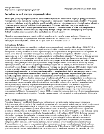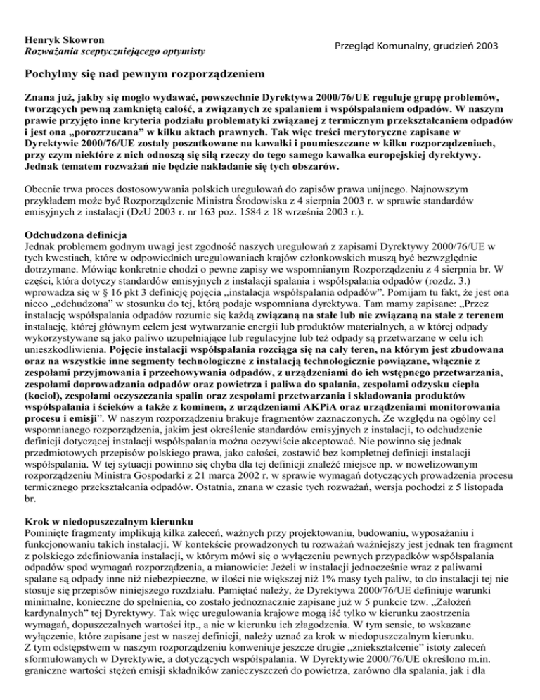 Henryk Skowron RozwaŜania sceptyczniejącego optymisty Przegląd Komunalny, grudzień 2003 Pochylmy się nad pewnym rozporządzeniem Znana juŜ, jakby się mogło wydawać, powszechnie Dyrektywa 2000/76/UE reguluje grupę problemów, tworzących pewną zamkniętą całość, a związanych ze spalaniem i współspalaniem odpadów. W naszym prawie przyjęto inne kryteria podziału problematyki związanej z termicznym przekształcaniem odpadów i jest ona „porozrzucana” w kilku aktach prawnych. Tak więc treści merytoryczne zapisane w Dyrektywie 2000/76/UE zostały poszatkowane na kawałki i poumieszczane w kilku rozporządzeniach, przy czym niektóre z nich odnoszą się siłą rzeczy do tego samego kawałka europejskiej dyrektywy. Jednak tematem rozwaŜań nie będzie nakładanie się tych obszarów. Obecnie trwa proces dostosowywania polskich uregulowań do zapisów prawa unijnego. Najnowszym przykładem moŜe być Rozporządzenie Ministra Środowiska z 4 sierpnia 2003 r. w sprawie standardów emisyjnych z instalacji (DzU 2003 r. nr 163 poz. 1584 z 18 września 2003 r.). Odchudzona definicja Jednak problemem godnym uwagi jest zgodność naszych uregulowań z zapisami Dyrektywy 2000/76/UE w tych kwestiach, które w odpowiednich uregulowaniach krajów członkowskich muszą być bezwzględnie dotrzymane. Mówiąc konkretnie chodzi o pewne zapisy we wspomnianym Rozporządzeniu z 4 sierpnia br. W części, która dotyczy standardów emisyjnych z instalacji spalania i współspalania odpadów (rozdz. 3.) wprowadza się w § 16 pkt 3 definicję pojęcia „instalacja współspalania odpadów”. Pomijam tu fakt, Ŝe jest ona nieco „odchudzona” w stosunku do tej, którą podaje wspomniana dyrektywa. Tam mamy zapisane: „Przez instalację współspalania odpadów rozumie się kaŜdą związaną na stałe lub nie związaną na stałe z terenem instalację, której głównym celem jest wytwarzanie energii lub produktów materialnych, a w której odpady wykorzystywane są jako paliwo uzupełniające lub regulacyjne lub teŜ odpady są przetwarzane w celu ich unieszkodliwienia. Pojęcie instalacji współspalania rozciąga się na cały teren, na którym jest zbudowana oraz na wszystkie inne segmenty technologiczne z instalacją technologicznie powiązane, włącznie z zespołami przyjmowania i przechowywania odpadów, z urządzeniami do ich wstępnego przetwarzania, zespołami doprowadzania odpadów oraz powietrza i paliwa do spalania, zespołami odzysku ciepła (kocioł), zespołami oczyszczania spalin oraz zespołami przetwarzania i składowania produktów współspalania i ścieków a takŜe z kominem, z urządzeniami AKPiA oraz urządzeniami monitorowania procesu i emisji”. W naszym rozporządzeniu brakuje fragmentów zaznaczonych. Ze względu na ogólny cel wspomnianego rozporządzenia, jakim jest określenie standardów emisyjnych z instalacji, to odchudzenie definicji dotyczącej instalacji współspalania moŜna oczywiście akceptować. Nie powinno się jednak przedmiotowych przepisów polskiego prawa, jako całości, zostawić bez kompletnej definicji instalacji współspalania. W tej sytuacji powinno się chyba dla tej definicji znaleźć miejsce np. w nowelizowanym rozporządzeniu Ministra Gospodarki z 21 marca 2002 r. w sprawie wymagań dotyczących prowadzenia procesu termicznego przekształcania odpadów. Ostatnia, znana w czasie tych rozwaŜań, wersja pochodzi z 5 listopada br. Krok w niedopuszczalnym kierunku Pominięte fragmenty implikują kilka zaleceń, waŜnych przy projektowaniu, budowaniu, wyposaŜaniu i funkcjonowaniu takich instalacji. W kontekście prowadzonych tu rozwaŜań waŜniejszy jest jednak ten fragment z polskiego zdefiniowania instalacji, w którym mówi się o wyłączeniu pewnych przypadków współspalania odpadów spod wymagań rozporządzenia, a mianowicie: JeŜeli w instalacji jednocześnie wraz z paliwami spalane są odpady inne niŜ niebezpieczne, w ilości nie większej niŜ 1% masy tych paliw, to do instalacji tej nie stosuje się przepisów niniejszego rozdziału. Pamiętać naleŜy, Ŝe Dyrektywa 2000/76/UE definiuje warunki minimalne, konieczne do spełnienia, co zostało jednoznacznie zapisane juŜ w 5 punkcie tzw. „ZałoŜeń kardynalnych” tej Dyrektywy. Tak więc uregulowania krajowe mogą iść tylko w kierunku zaostrzenia wymagań, dopuszczalnych wartości itp., a nie w kierunku ich złagodzenia. W tym sensie, to wskazane wyłączenie, które zapisane jest w naszej definicji, naleŜy uznać za krok w niedopuszczalnym kierunku. Z tym odstępstwem w naszym rozporządzeniu konweniuje jeszcze drugie „zniekształcenie” istoty zaleceń sformułowanych w Dyrektywie, a dotyczących współspalania. W Dyrektywie 2000/76/UE określono m.in. graniczne wartości stęŜeń emisji składników zanieczyszczeń do powietrza, zarówno dla spalania, jak i dla róŜnych wariantów współspalania odpadów (istotę formułowania granicznych wartości stęŜenia emisji składników zanieczyszczeń w spalinach, dla róŜnych konfiguracji spalania i współspalania odpadów, obrazowo przedstawiono na rys. 1). Z rys. 1 wynika, Ŝe w przypadkach współspalania odpadów wartości graniczne stęŜenia emisji składników zanieczyszczeń (standardy emisyjne) mają być określane w zróŜnicowany sposób – w zaleŜności od rodzaju instalacji, w której odpady są współspalane. Dla takiego niemal klasycznego przypadku współspalania, jakim są piece cementowe, zarówno w Dyrektywie jak i w naszym Rozporządzeniu określono od razu, dla całego strumienia spalin, wartości graniczne wszystkich, spośród ocenianych w spalinach składników zanieczyszczeń. RównieŜ dla palenisk energetycznych i przemysłowych wartości graniczne stęŜenia emisji niektórych składników zanieczyszczeń (metale cięŜkie oraz PCDD/F) określa się od razu dla całego strumienia spalin. Natomiast dla pozostałych spośród ocenianych składników zanieczyszczeń gr