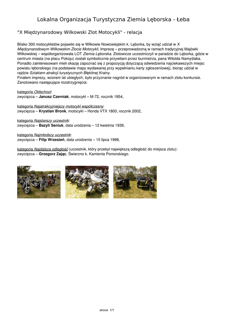 Lokalna Organizacja Turystyczna Ziemia Lęborska - Łeba "X Międzynarodowy Wilkowski Zlot Motocykli" - relacja Blisko 300 motocyklistów pojawiło się w Wilkowie Nowowiejskim k. Lęborka, by wziąć udział w X Międzynarodowym Wilkowskim Zlocie Motocykli. Imprezę – przeprowadzoną w ramach tradycyjnej Majówki Wilkowskiej – współorganizowała LOT Ziemia Lęborska. Zlotowicze uczestniczyli w paradzie do Lęborka, gdzie w centrum miasta (na placu Pokoju) zostali symbolicznie przywitani przez burmistrza, pana Witolda Namyślaka. Ponadto zainteresowani mieli okazję zapoznać się z propozycją dotyczącą odwiedzenia najciekawszych miejsc powiatu lęborskiego (na podstawie mapy wydawanej przy wypełnianiu karty zgłoszeniowej), biorąc udział w rajdzie Szlakiem atrakcji turystycznych Błękitnej Krainy. Finałem imprezy, wzorem lat ubiegłych, było przyznanie nagród w organizowanym w ramach zlotu konkursie. Zanotowano następujące rozstrzygnięcia: kategoria Oldschool: zwycięzca – Janusz Czerniak, motocykl – M-72, rocznik 1954, kategoria Najatrakcyjniejszy motocykl współczesny: zwycięzca – Krystian Bronk, motocykl – Honda VTX 1800, rocznik 2002, kategoria Najstarszy uczestnik: zwycięzca – Bazyli Seniuk, data urodzenia – 12 kwietnia 1939, kategoria Najmłodszy uczestnik: zwycięzca – Filip Wrzesień, data urodzenia – 15 lipca 1998, kategoria Najdalsza odległość (uczestnik, który przebył największą odległość do miejsca zlotu): zwycięzca – Grzegorz Zając, Świerzno k. Kamienia Pomorskiego. strona 1/1 Powered by TCPDF (www.tcpdf.org)