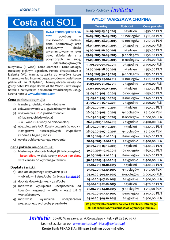 JESIEŃ 2015 Biuro Podróży . Costa del SOL . Hotel TORREQUEBRADA **** położony w miejscowości Benalmadena. Komfortowy oraz ekskluzywny obiekt wyremontowany w roku 2010, składa się z 2 połączonych ze sobą, jedenastopiętrowych budynków (6 wind): Torre Marbella i Torre Malaga, otoczony pięknym ogrodem. Pokoje dwuosobowe z łazienką (WC, wanna, suszarka do włosów). Łącze internetowe lub Internet bezprzewodowy (dodatkowo płatne ok. 10 EUR/dzień). Torrequebrada należy do grupy hoteli Prestige Hotels of the World - zrzeszające hotele z najwyższym poziomem świadczonych usług. Strona hotelu: www.thbhotels.com Cena pakietu obejmuje: 1) transfery: lotnisko - hotel – lotnisko 2) zakwaterowanie w 4–gwiazdkowym hotelu 3) wyżywienie (HB) 2 posiłki dziennie: (śniadanie, obiadokolacja) + ¼ l. wina i ¼ l. wody do obiadokolacji 4) ubezpieczenie AXA: Koszty Leczenia (10 000 €) Następstwa Nieszczęśliwych Wypadków (2 000 € ), bagaż ( 200 €) 5) opiekę polskojęzycznego rezydenta Cena pakietu nie obejmuje: 1) biletu na przelot do/z Malagi (linia Norwegian) - koszt biletu w dwie strony ok.500-900 zł/os. w zależności od wybranego terminu Dopłaty i zniżki: 1) dopłata do pełnego wyżywienia (FB) – obiadu – 18 zł/os./doba (w biurze ) 2) dopłata do pokoju 1-os. – 72 zł/doba 3) możliwość wykupienia ubezpieczenia od kosztów rezygnacji w AXA – koszt 2,8 % wartości umowy 4) możliwość wykupienia ubezpieczenia poszerzonego o choroby przewlekłe WYLOT WARSZAWA CHOPINA Terminy 16.09.2015-23.09.2015 16.09.2015-26.09.2015 16.09.2015-28.09.2015 16.09.2015-30.09.2015 19.09.2015-26.09.2015 19.09.2015-28.09.2015 19.09.2015-30.09.2015 19.09.2015-03.10.2015 21.09.2015-28.09.2015 21.09.2015-30.09.2015 21.09.2015-03.10.2015 21.09.2015-05.10.2015 23.09.2015-30.09.2015 23.09.2015-03.10.2015 23.09.2015-05.10.2015 23.09.2015-07.10.2015 26.09.2015-03.10.2015 26.09.2015-05.10.2015 26.09.2015-07.10.2015 26.09.2015-10.10.2015 28.09.2015-05.10.2015 28.09.2015-07.10.2015 28.09.2015-10.10.2015 28.09.2015-12.10.2015 30.09.2015-07.10.2015 30.09.2015-10.10.2015 30.09.2015-12.10.2015 30.09.2015-14.10.2015 03.10.2015-10.10.2015 03.10.2015-12.10.2015 03.10.2015-14.10.2015 03.10.2015-17.10.2015 05.10.2015-12.10.2015 05.10.2015-14.10.2015 05.10.2015-17.10.2015 05.10.2015-19.10.2015 Ilość dni 1-tydzień 10-noclegów 12-noclegów 2-tygodnie 1-tydzień 9-noclegów 11-noclegów 2-tygodnie 1-tydzień 9-noclegów 12-noclegów 2-tygodnie 1-tydzień 10-noclegów 12-noclegów 2-tygodnie 1-tydzień 9-noclegów 11-noclegów 2-tygodnie 1-tydzień 9-noclegów 12-noclegów 2-tygodnie 1-tydzień 10-noclegów 12-noclegów 2-tygodnie 1-tydzień 9-noclegów 11-noclegów 2-tygodnie 1-tydzień 9-noclegów 12-noclegów 2-tygodnie Cena pakietu 1 450,00 PLN 1 910,00 PLN 2 210,00 PLN 2 490,00 PLN 1 450,00 PLN 1 750,00 PLN 2 060,00 PLN 2 490,00 PLN 1 450,00 PLN 1 750,00 PLN 2 210,00 PLN 2 490,00 PLN 1 420,00 PLN 1 850,00 PLN 2 140,00 PLN 2 400,00 PLN 1 450,00 PLN 1 710,00 PLN 2 000,00 PLN 2 400,00 PLN 1 420,00 PLN 1 710,00 PLN 2 140,00 PLN 2 400,00 PLN 1 420,00 PLN 1 850,00 PLN 2 140,00 PLN 2 400,00 PLN 1 420,00 PLN 1 710,00 PLN 2 000,00 PLN 2 400,00 PLN 1 420,00 PLN 1 710,00 PLN 2 140,00 PLN 2 400,00 PLN Do powyższych cen należy doliczyć koszt biletu lotniczego ok. 600-1000 zł/os. w zależności od wybranego terminu. | 00-087 Warszawa, ul. A.Corazziego 4 tel. +48 22 825 49 55 fax: +48 22 825 41 00 www.invitatio.pl [email protected] Konto Bank PEKAO S.A.: 88 1240 6348 1111 0000 5118 9815 JESIEŃ 2015 Biuro Podróży . Costa del SOL . Hotel TORREQUEBRADA **** położony w miejscowości Benalmadena. Komfortowy oraz ekskluzywny obiekt wyremontowany w roku 2010, składa się z 2 połączonych ze sobą, jedenastopiętrowych budynków (6 wind): Torre Marbella i Torre Malaga, otoczony pięknym ogrodem. Pokoje dwuosobowe z łazienką (WC, wanna, suszarka do włosów). Łącze internetowe lub Internet bezprzewodowy (dodatkowo płatne ok. 10 EUR/dzień). Torrequebrada należy do grupy hoteli Prestige Hotels of the World - zrzeszające hotele z najwyższym poziomem świadczonych usług. Strona hotelu: www.thbhotels.com Cena pakietu obejmuje: 1) transfery: lotnisko - hotel – lotnisko 2) zakwaterowanie w 4–gwiazdkowym hotelu 3) wyżywienie (HB) 2 posiłki dziennie: (śniadanie, obiadokolacja) + ¼ l. wina i ¼ l. wody do obiadokolacji 4) ubezpieczenie AXA: Koszty Leczenia (10 000 €) Następstwa Nieszczęśliwych Wypadków (2 000 € ), bagaż ( 200 €) 5) opiekę polskojęzycznego rezydenta WYLOT WARSZAWA CHOPINA Terminy 07.10.2015-14.10.2015 07.10.2015-17.10.2015 07.10.2015-19.10.2015 07.10.2015-21.10.2015 10.10.2015-17.10.2015 10.10.2015-19.10.2015 10.10.2015-21.10.2015 10.10.2015-24.10.2015 12.10.2015-19.10.2015 12.10.2015-21.10.2015 12.10.2015-24.10.2015 14.10.2015-21.10.2015 14.10.2015-24.10.2015 17.10.2015-24.10.2015 Ilość dni 1-tydzień 10-noclegów 12-noclegów 2-tygodnie 1-tydzień 9-noclegów 11-noclegów 2-tygodnie 1-tydzień 9-noclegów 12-noclegów 1-tydzień 10-noclegów 1-tydzień Do powyższych cen należy doliczyć koszt biletu lotniczego ok. 600-1000 zł/os. w zależności od wybranego terminu. Cena pakietu nie obejmuje: 1) biletu na przelot do/z Malagi (linia Norwegian) - koszt biletu w dwie strony ok.500-900 zł/os. w zależności od wybranego terminu Dopłaty i zniżki: 1) dopłata do pełnego wyżywienia (FB) – obiadu – 18 zł/os./doba (w biurze Cena pakietu 1 420,00 PLN 1 850,00 PLN 2 140,00 PLN 2 400,00 PLN 1 420,00 PLN 1 710,00 PLN 2 000,00 PLN 2 400,00 PLN 1 420,00 PLN 1 710,00 PLN 2 140,00 PLN 1 420,00 PLN 1 850,00 PLN 1 420,00 PLN ) 2) dopłata do pokoju 1-os. – 72 zł/doba 3) możliwość wykupienia ubezpieczenia od kosztów rezygnacji w AXA – koszt 2,8 % wartości umowy 4) możliwość wykupienia ubezpieczenia poszerzonego o choroby przewlekłe | 00-087 Warszawa, ul. A.Corazziego 4 tel. +48 22 825 49 55 fax: +48 22 825 41 00 www.invitatio.pl [email protected] Konto Ba