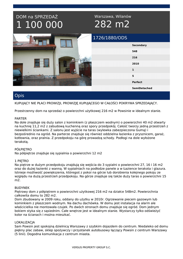 DOM na SPRZEDAŻ 1 100 000 Warszawa, Wilanów 282 m2 1726/1880/ODS Secondary 548 216 2010 1 5 Perfect SemiDetached Opis KUPUJĄCY NIE PŁACI PROWIZJI, PROWIZJĘ KUPUJĄCEGO W CAŁOŚCI POKRYWA SPRZEDAJĄCY. Przestrzenny dom na sprzedaż o powierzchni użytkowej 216 m2 w Powsinie w idealnym stanie. PARTER Na dole znajduje się duży salon z kominkiem (z płaszczem wodnym) o powierzchni 40 m2 otwarty na kuchnię 11,2 m2 z zabudową kuchenną oraz spory przedpokój. Całość tworzy jedną przestrzeń z niewielkimi ściankami. Z salonu jest wyjście na taras (wylewka zabezpieczona Gumą) i bezpośrednio na ogród. Na parterze znajduje się również oddzielna łazienka z prysznicem, garaż, kotłownia, oraz pralnia. Z przedpokoju na górę prowadzą schody. Podłogi na dole wyłożone terakotą. PÓŁPIĘTRO Na półpiętrze znajduje się sypialnia o powierzchni 12 m2 1 PIĘTRO Na piętrze w dużym przedpokoju znajdują się wejścia do 3 sypialni o powierzchni 27, 16 i 16 m2 oraz do dużej łazienki z wanną. W sypialniach na podłodze panele a w Łazience terakota i glazura. Istnieje możliwość powiększenia, któregoś z pokoi na górze lub dorobienia kolejnego pokoju ze względu na dużą przestrzeń przedpokoju. Na górze znajduje się także duży taras o powierzchni 15 m2. BUDYNEK Piętrowy dom z półpiętrem o powierzchni użytkowej 216 m2 na działce 548m2. Powierzchnia całkowita domu to 282 m2. Dom zbudowany w 2009 roku, oddany do użytku w 2010r. Ogrzewanie piecem gazowym lub kominkiem z płaszczem wodnym. Na dachu dachówka. W domu jest instalacja na alarm ale właścicielka nie montowała czujek. Po dwóch stronach domu znajduje się ogród. Dom jednym bokiem styka się z sąsiednim. Całe wnętrze jest w idealnym stanie. Wystarczy tylko odświeżyć kolor na ścianach i można mieszkać. LOKALIZACJA Sam Powsin jest spokojną dzielnicą Warszawy z szybkim dojazdem do centrum. Niedaleko od domu piękny plac zabaw, sklep spożywczy i przystanek autobusowy łączący Powsin z centrum Warszawy (5 linii). Dogodna komunikacja z centrum miasta. VERSUS PROPERTY GROUP S.C. Zapraszamy do oglądania, gdyż przestrzeń domu ciężko ująć na zdjęciach. nr oferty: 1726/ODS Zapraszamy do naszego biura w Piasecznie, ul. Pomorska 22. Nasi pracownicy są do Państwa dyspozycji od 10:00 do 18:00 (pon-pt), w sobotę od 10:00 do 13:00. Kontakt telefoniczny w sprawie ofert codziennie od godziny 8:00 do 22:00 tel. 664 476 532 W celu zapoznania się z naszą pełną ofertą nieruchomości zapraszamy na naszą stronę www.versusgroup.pl Niniejsze ogłoszenie nie stanowi oferty w rozumieniu przepisów Kodeksu Cywilnego oraz innych właściwych przepisów prawnych, a dane w niej zawarte mają jedynie charakter informacyjny. Jacek Gawin tel. 664 476 532 email: [email protected] VERSUS PROPERTY GROUP S.C. Powered by TCPDF (www.tcpdf.org)