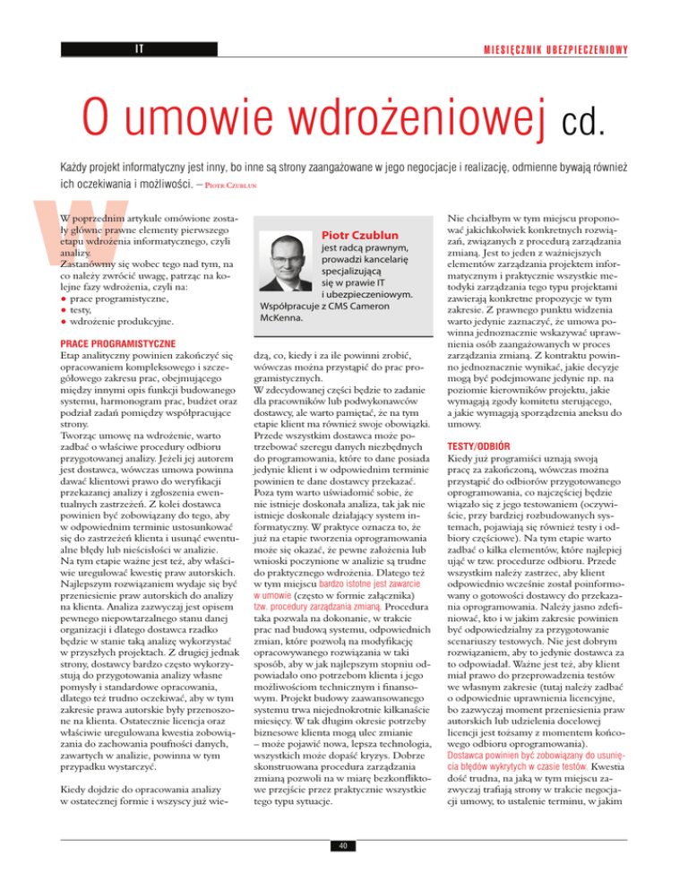 IT MIESIĘCZNIK UBEZPIECZENIOWY O umowie wdrożeniowej cd. Każdy projekt informatyczny jest inny, bo inne są strony zaangażowane w jego negocjacje i realizację, odmienne bywają również ich oczekiwania i możliwości. – PIOTR CZUBLUN W W poprzednim artykule omówione zostały główne prawne elementy pierwszego etapu wdrożenia informatycznego, czyli analizy. Zastanówmy się wobec tego nad tym, na co należy zwrócić uwagę, patrząc na kolejne fazy wdrożenia, czyli na: ● prace programistyczne, ● testy, ● wdrożenie produkcyjne. PRACE PROGRAMISTYCZNE Etap analityczny powinien zakończyć się opracowaniem kompleksowego i szczegółowego zakresu prac, obejmującego między innymi opis funkcji budowanego systemu, harmonogram prac, budżet oraz podział zadań pomiędzy współpracujące strony. Tworząc umowę na wdrożenie, warto zadbać o właściwe procedury odbioru przygotowanej analizy. Jeżeli jej autorem jest dostawca, wówczas umowa powinna dawać klientowi prawo do weryfikacji przekazanej analizy i zgłoszenia ewentualnych zastrzeżeń. Z kolei dostawca powinien być zobowiązany do tego, aby w odpowiednim terminie ustosunkować się do zastrzeżeń klienta i usunąć ewentualne błędy lub nieścisłości w analizie. Na tym etapie ważne jest też, aby właściwie uregulować kwestię praw autorskich. Najlepszym rozwiązaniem wydaje się być przeniesienie praw autorskich do analizy na klienta. Analiza zazwyczaj jest opisem pewnego niepowtarzalnego stanu danej organizacji i dlatego dostawca rzadko będzie w stanie taką analizę wykorzystać w przyszłych projektach. Z drugiej jednak strony, dostawcy bardzo często wykorzystują do przygotowania analizy własne pomysły i standardowe opracowania, dlatego też trudno oczekiwać, aby w tym zakresie prawa autorskie były przenoszone na klienta. Ostatecznie licencja oraz właściwie uregulowana kwestia zobowiązania do zachowania poufności danych, zawartych w analizie, powinna w tym przypadku wystarczyć. Kiedy dojdzie do opracowania analizy w ostatecznej formie i wszyscy już wie- Piotr Czublun jest radcą prawnym, prowadzi kancelarię specjalizującą się w prawie IT i ubezpieczeniowym. Współpracuje z CMS Cameron McKenna. dzą, co, kiedy i za ile powinni zrobić, wówczas można przystąpić do prac programistycznych. W zdecydowanej części będzie to zadanie dla pracowników lub podwykonawców dostawcy, ale warto pamiętać, że na tym etapie klient ma również swoje obowiązki. Przede wszystkim dostawca może potrzebować szeregu danych niezbędnych do programowania, które to dane posiada jedynie klient i w odpowiednim terminie powinien te dane dostawcy przekazać. Poza tym warto uświadomić sobie, że nie istnieje doskonała analiza, tak jak nie istnieje doskonale działający system informatyczny. W praktyce oznacza to, że już na etapie tworzenia oprogramowania może się okazać, że pewne założenia lub wnioski poczynione w analizie są trudne do praktycznego wdrożenia. Dlatego też w tym miejscu bardzo istotne jest zawarcie w umowie (często w formie załącznika) tzw. procedury zarządzania zmianą. Procedura taka pozwala na dokonanie, w trakcie prac nad budową systemu, odpowiednich zmian, które pozwolą na modyfikację opracowywanego rozwiązania w taki sposób, aby w jak najlepszym stopniu odpowiadało ono potrzebom klienta i jego możliwościom technicznym i finansowym. Projekt budowy zaawansowanego systemu trwa niejednokrotnie kilkanaście miesięcy. W tak długim okresie potrzeby biznesowe klienta mogą ulec zmianie – może pojawić nowa, lepsza technologia, wszystkich może dopaść kryzys. Dobrze skonstruowana procedura zarządzania zmianą pozwoli na w miarę bezkonfliktowe przejście przez praktycznie wszystkie tego typu sytuacje. 40 Nie chciałbym w tym miejscu proponować jakichkolwiek konkretnych rozwiązań, związanych z procedurą zarządzania zmianą. Jest to jeden z ważniejszych elementów zarządzania projektem informatycznym i praktycznie wszystkie metodyki zarządzania tego typu projektami zawierają konkretne propozycje w tym zakresie. Z prawnego punktu widzenia warto jedynie zaznaczyć, że umowa powinna jednoznacznie wskazywać uprawnienia osób zaangażowanych w proces zarządzania zmianą. Z kontraktu powinno jednoznacznie wynikać, jakie decyzje mogą być podejmowane jedynie np. na poziomie kierowników projektu, jakie wymagają zgody komitetu sterującego, a jakie wymagają sporządzenia aneksu do umowy. TESTY/ODBIÓR Kiedy już programiści uznają swoją pracę za zakończoną, wówczas można przystąpić do odbiorów przygotowanego oprogramowania, co najczęściej będzie wiązało się z jego testowaniem (oczywiście, przy bardziej rozbudowanych systemach, pojawiają się również testy i odbiory częściowe). Na tym etapie warto zadbać o kilka elementów, które najlepiej ująć w tzw. procedurze odbioru. Przede wszystkim należy zastrzec, aby klient odpowiednio wcześnie został poinformowany o gotowości dostawcy do przekazania oprogramowania. Należy jasno zdefiniować, kto i w jakim zakresie powinien być odpowiedzialny za przygotowanie scenariuszy testowych. Nie jest dobrym rozwiązaniem, aby to jedynie dostawca za to odpowiadał. Ważne jest też, aby klient miał prawo do przeprowadzenia testów we własnym zakresie (tutaj należy zadbać o odpowiednie uprawnienia licencyjne, bo zazwyczaj moment przeniesienia praw autorskich lub udzielenia docelowej licencji jest tożsamy z momentem końcowego odbioru oprogramowania). Dostawca powinien być zobowiązany do usunięcia błędów wykrytych w czasie testów. Kwestia dość trudna, na jaką w tym miejscu zazwyczaj trafiają strony w trakcie negocjacji umowy, to ustalenie terminu, w jakim IT PAŹDZIERNIK 2009 dostawca powinien usunąć wykryte błędy. Klient oczekuje usunięcia błędów w jak najkrótszym i najlepiej ściśle określonym terminie, dostawca z kolei argumentuje, że przecież nie wiadomo