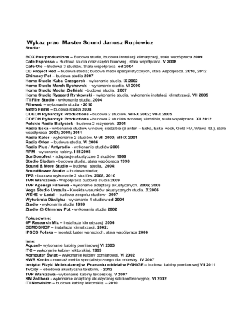 Wykaz prac Master Sound Janusz Rupiewicz Studia: BOX Postproductions – Budowa studia, budowa instalacji klimatyzacji, stała współpraca 2009 Cafe Espresso – Budowa studia oraz części biurowej , stała współpraca. V 2008 Cafe Ole – Budowa 3 studiów. Stała współpraca od 2004 CD Project Red – budowa studia; budowa mebli specjalistycznych, stała współpraca. 2010, 2012 Chimney Pot – budowa studia 2007 Home Studio Kuba Grzegorek - wykonanie studia. IX 2002 Home Studio Marek Bychawski - wykonanie studia. VI 2000 Home Studio Maciej Zieliński –budowa studia. 2007 Home Studio Ryszard Rynkowski - wykonanie studia, wykonanie instalacji klimatyzacji. VII 2005 ITI Film Studio - wykonanie studia. 2004 Filmweb – wykonanie studia - 2010 Metro Films – budowa studia 2008 ODEON Rybarczyk Productions - budowa 2 studiów. VIII-X 2002; VII-X 2005 ODEON Rybarczyk Productions - budowa 2 studiów w nowej siedzibie, stała współpraca. XII 2012 Polskie Radio Białystok - budowa 2 reżyserek. 2001 Radio Eska - wykonanie studiów w nowej siedzibie (6 anten – Eska, Eska Rock, Gold FM, Wawa itd.), stała współpraca 2007; 2008; 2011 Radio Kolor - wykonanie 2 studiów. V-VII 2000; VII-IX 2001 Radio Orlen – budowa studia. VI 2006 Radio Plus / Antyradio - wykonanie studiów 2006 RPM - wykonanie kabiny. I-III 2008 SonSonofect - adaptacje akustyczne 3 studiów. 1999 Studio Siedem - budowa studia, stała współpraca 1998 Sound & More Studio – budowa studia,. 2004; Soundflower Studio – budowa studia;. TPS - budowa wykonanie 2 studiów. 2008, 2010 TVN Warszawa - Współpraca budowa studia 2009 TVP Agencja Filmowa - wykonanie adaptacji akustycznych. 2006; 2008 Vega Studio Urszula - Korekta warunków akustycznych studia. X 2006 WSHE w Łodzi – budowa zespołu studiów - 2007 Wytwórnia Dźwięku - wykonanie 4 studiów od 2004 Ztudio - wykonanie studia 1999 Ztudio @ Chimney Pot - wykonanie studia 2002 Fokusownie: 4P Research Mix – instalacja klimatyzacji 2004 DEMOSKOP – instalacja klimatyzacji. 2002; IPSOS Polska – montaż luster weneckich, stała współpraca 2006 Inne: Aquael– wykonanie kabiny pomiarowej VI 2003 ITC – wykonanie kabiny lektorskiej. 1999 Komputer Świat – wykonanie kabiny pomiarowej. VI 2002 KWB Konin – montaż mebla specjalistycznego dla orkiestry. IV 2007 Instytut Fizyki Molekularnej w Poznaniu oddział w PGNiGE – budowa kabiny pomiarowej VII 2011 TvCity – obudowa akustyczna telebimu - 2012 TVP Warszawa –wykonanie kabiny lektorskiej. V 2007 SM Żoliborz - wykonanie adaptacji akustycznej sali konferencyjnej. VI 2002 ITI Neovision – budowa kabiny lektorskiej – 2010