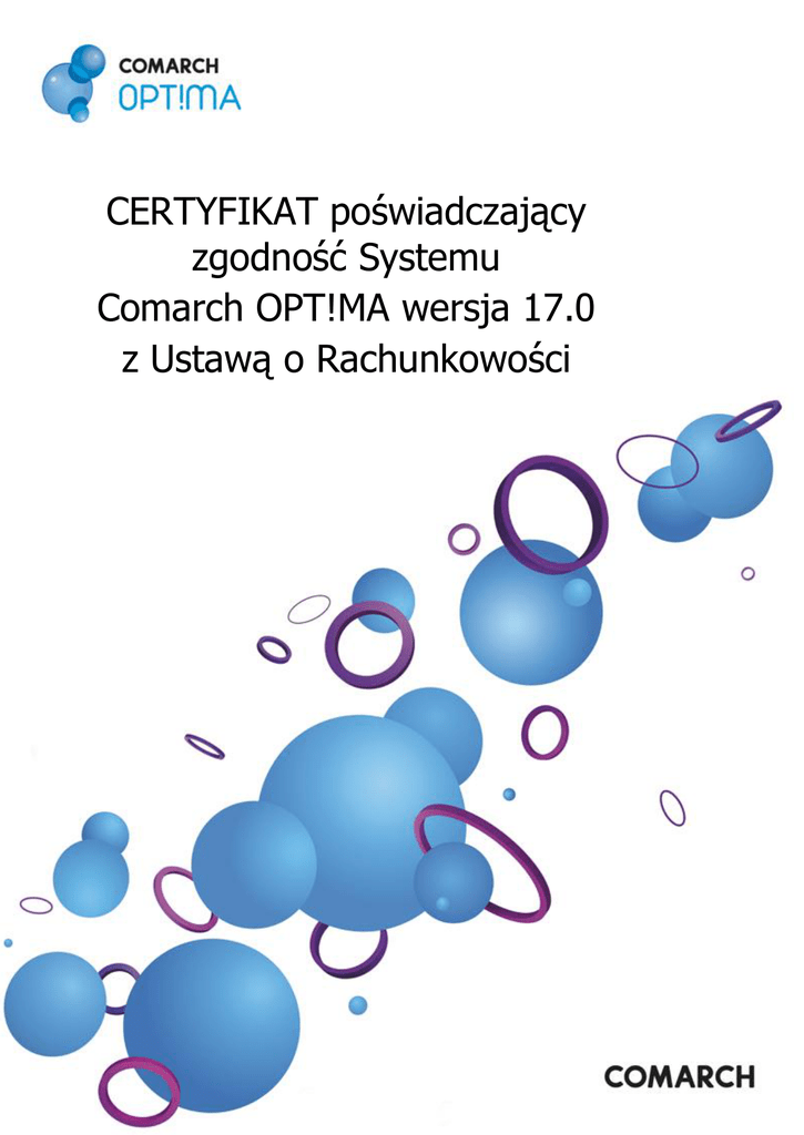 CERTYFIKAT poświadczający zgodność Systemu Comarch OPT!MA wersja 17.0 z Ustawą o Rachunkowości Potwierdzamy, że moduły o nazwie Księga Handlowa (KH) i Księga Handlowa Plus (KHP) wchodzące w skład zintegrowanego sytemu do zarządzania Comarch OPT!MA, służącego do prowadzenia ksiąg rachunkowych przy pomocy komputera, spełniają wymagania Ustawy o Rachunkowości z dnia 29.09.1994 r. 1. Informacje o programie oraz procedurze prowadzenia księgowości wg postanowień art. 10 ust. 1 ww. ustawy: a) Program nie ogranicza liczby ani poziomów analityk zakładowego planu kont; nie ogranicza również liczby i rodzaju prowadzonych dzienników oraz ksiąg pomocniczych, decyzje co do ich struktury podejmuje osoba prowadząca księgowość i określa je w utworzonej przez siebie dokumentacji (Art. 17). Informacje o strukturze ewidencji księgowej dotyczącej danego podmiotu gospodarczego nie są więc przedmiotem dokumentacji programu. b) Zgodnie z Art. 13 program umożliwia prowadzenie: dziennika, lub kilku odrębnych dzienników zapisów księgowych w sposób zgodny z zasadami określonymi w Art. 14, zestawienia obrotów i sald kont księgi głównej oraz sald kont ksiąg pomocniczych wg zasad opisanych w Art. 18, księgi głównej i ksiąg pomocniczych wg zasad opisanych w Art. 15 i 16. c) Spełniając warunek rzetelności zapisów z Art. 22 ustawy, program uniemożliwia dokonywanie zmian zapisu księgowego ujętego w dzienniku. d) Z punktu widzenia technicznego, dane obsługiwane przez program zorganizowane są w zbiory danych, wydzielone w odrębnych kartotekach dyskowych, z których każda zawiera pełną ewidencję księgową dla danej jednostki. Oznacza to, że w przypadku prawidłowej obsługi przez program księgowości kilku jednostek, informacje księgowe dotyczące jednostki nie mogą być zafałszowane przez dane innej jednostki. Struktura bazy danych. W każdej kartotece na dysku zostają założone i utrzymywane następujące zbiory danych związanych z modułami Księga Handlowa/ Księga Handlowa Plus: Nazwa tabeli Opis AutoEwid Lista samochodów prywatnych używanych do celów służbowych AutoKoszty Ewidencja kosztów używania samochodów prywatnych do celów służbowych AutoPrzejazd Ewidencja przejazdów samochodów prywatnych do celów służbowych AutoRozlicz Rozliczenie kosztów używania samochodów prywatnych do celów służbowych AutoTrasy Ewidencja pomocnicza tras BOElem Pozycje bilansu otwarcia BONag Nagłówki dokumentów bilansu otwarcia 2 Certyfikat zgodności Comarch OPT!MA v. 17 BnkDokElem Pozycje dokumentów potwierdzenia salda i ponaglenia zapłaty BnkDokNag Nagłówki dokumentów potwierdzenia salda i ponaglenia zapłaty BnkFormatyElem Elementy formatów elektronicznej wymiany z bankami BnkFormatyNag Formaty elektronicznej wymiany danych z bankami - nagłówki BnkNazwy Lista banków BnkRachZakazy Zakazy dostępu do rachunków kasowo/bankowych BnkRachunki Ewidencja rachunków bankowych i kas gotówkowych firmy BnkRaporty Raporty kasowe i bankowe BnkRozKwoty Rozliczenia BnkRozKwotyMW Powiązania zapisów kasowych/bankowych dla funkcji Magazyn walut BnkRozRelacje Tabela pomocnicza rozliczeń BnkZapisy Zapisy w raportach kasowych i bankowych BnkZdarzenia Preliminarz płatności DeklElem Pozycje deklaracji podatkowych DeklKedu Pliki pomocnicze dla deklaracji KEDU DeklNag Zaliczki podatkowe na: PIT-36, PIT-36L, CIT-8, PIT-4R, PIT8A, deklaracje: VAT-7, VAT-7K, VAT-UE, CIT-8, PIT-8A, PIT-8B, ZUS, PIT-36, PIT-36L i CIT-8 DeklStr Pliki pomocnicze dla deklaracji ZUS DeklWydr Pliki pomocnicze do wydruku deklaracji DekretyElem Pozycje dekretów księgowych zbiorczych DekretyKonta Pliki pomocnicze dekretów księgowych DekretyNag Nagłówki dekretów księgowych zbiorczych DokDefinicje Definicje dokumentów (symbole, schematy numeracji) DziennikZakazy Zakazy do dzienników cząstkowych Dzienniki Nazwy dzienników cząstkowych EwidDodElem Elementy dokumentów z Ewidencji dodatkowej przychodów/kosztów EwidDodNag Nagłówki dokumentów z Ewidencji dodatkowej przychodów/kosztów Firma Parametry określone w konfiguracji firmy FormyPlatnosci Definicje form płatności Grupy Tabela pomocnicza zawierająca nazwy grup kontrahentów, rejestrów VAT, podrejestrów w ramach Ewidencji dodatkowej, grup środków trwałych i WNiP. GrupyKontElem Konta należące do danej grupy kont GrupyKontNag Definicje grup kont (w planie kont) - nagłówek IntrastatElem Pozycje deklaracji Intrastat IntrastatNag Deklaracje Intrastat - nagłówki KartyKredytowe Słownik kart kredytowych Kategorie Opisy pomocnicze dla dokumentów KntAtrybuty Lista atrybutów kontrahentów KntOsoby Lista przedstawicieli kontrahentów KodyCN Słownik kodów CN (dla deklaracji Intrastat) Konta Konta księgowe Certyfikat zgodności Comarch OPT!MA v. 17 3 KontaZakazy Zakazy do operacji na kontach księgowych Kontrahenci Ewidencja kontrahentów KragKosztElem Elementy definicji kręgu kosztów KragKosztNag Definicje kregów kosztów - nagłówek CDN.KsiDokElem Elementy dokumentów: Ponaglenie zapłaty Potwierdzenie salda, Nota odsetkowe, CDN.KsiDokNag Nagłówki dokumentów: Ponaglenie zapłaty Potwierdzenie salda, Nota odsetkowe, KsiRozrachunki Dekrety podlegające rozrachunkom KwotyDodatkowe Kwoty dodatkowe na dokumentach dodatkowa, Zapisy kasowe/bankowe) Miasta Słownik miast NotyOdsElem Elementy noty odsetkowej NotyOdsNag Nagłówki dokumentów not odsetkowych Obroty Tabela pomocnicza zawierająca zagregowane obroty na kontach OkresoweElem Elementy definicji schematów księgowań okresowych OkresoweNag Definicje schematów księgowań okresowych – nagłówki OkresyObrach Definicje okresów obrachunkowych PodmiotyView View serwerowe zawierające listę wszystkich podmiotów PracEtaty Dane personalne pracowników i wspólników PracKod Tabela podstawowa danych pracowników i wspólników PracPitKwoty Kwoty indywidualnych dochodów i odliczeń wspólnika PracPitMies Zakresy miesięczne dla kwot indywidualnyc