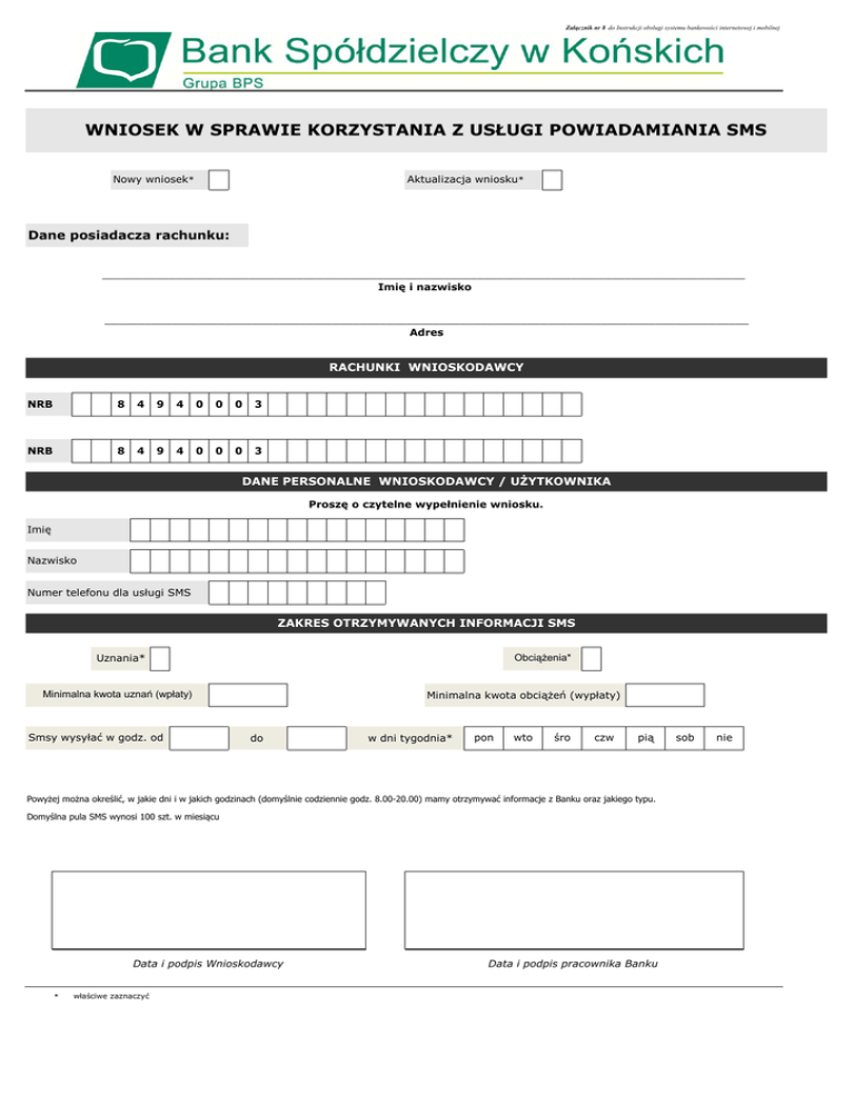Załącznik nr 8 do Instrukcji obsługi systemu bankowości internetowej i mobilnej WNIOSEK W SPRAWIE KORZYSTANIA Z USŁUGI POWIADAMIANIA SMS Nowy wniosek* Aktualizacja wniosku* Dane posiadacza rachunku: ________________________________________________________________________________________________ Imię i nazwisko ________________________________________________________________________________________________ Adres RACHUNKI WNIOSKODAWCY NRB 8 4 9 4 0 0 0 3 NRB 8 4 9 4 0 0 0 3 DANE PERSONALNE WNIOSKODAWCY / UŻYTKOWNIKA Proszę o czytelne wypełnienie wniosku. Imię Nazwisko Numer telefonu dla usługi SMS ZAKRES OTRZYMYWANYCH INFORMACJI SMS Uznania* Obciążenia* Minimalna kwota uznań (wpłaty) Smsy wysyłać w godz. od Minimalna kwota obciążeń (wypłaty) do w dni tygodnia* pon wto śro czw pią Powyżej można określić, w jakie dni i w jakich godzinach (domyślnie codziennie godz. 8.00-20.00) mamy otrzymywać informacje z Banku oraz jakiego typu. Domyślna pula SMS wynosi 100 szt. w miesiącu Data i podpis Wnioskodawcy * właściwe zaznaczyć Data i podpis pracownika Banku sob nie