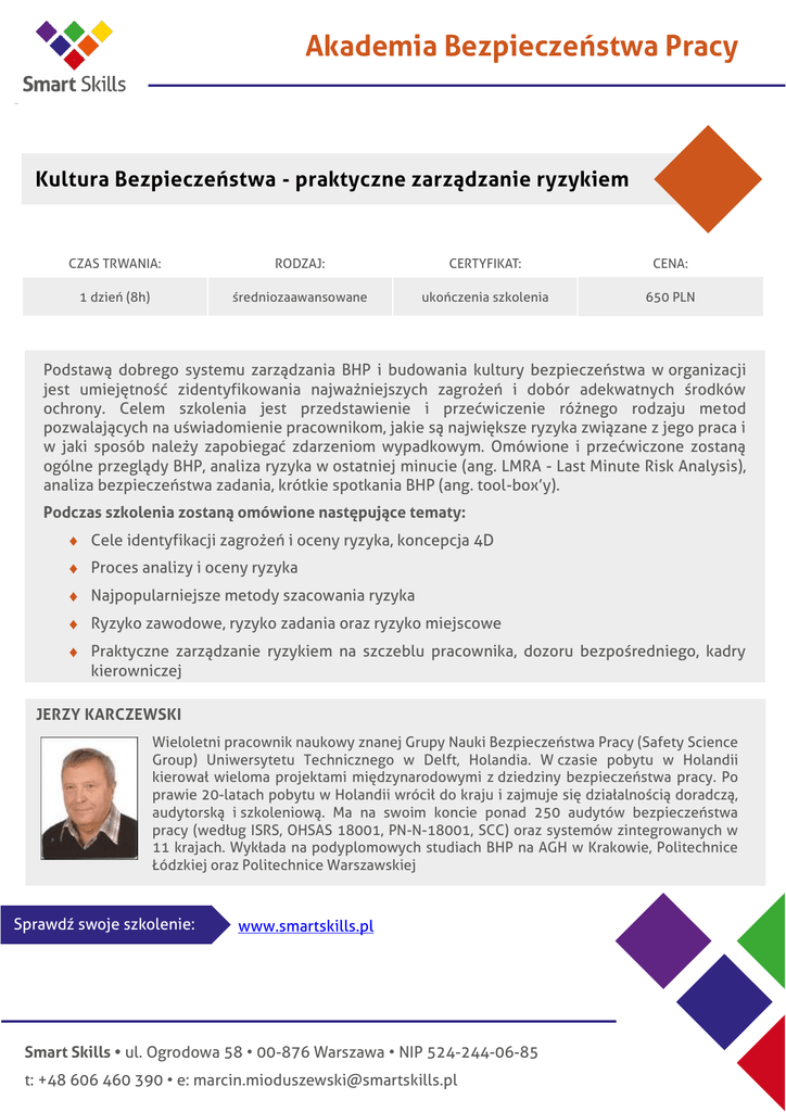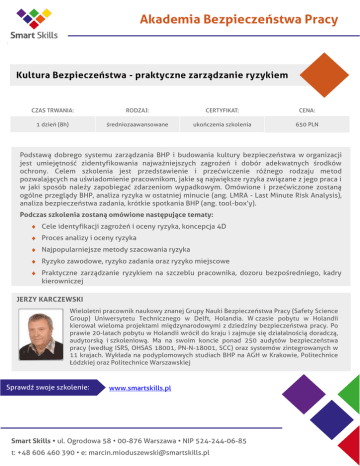Akademia Bezpieczeństwa Pracy «Tytuł» Kultura Bezpieczeństwa - praktyczne zarządzanie ryzykiem CZAS TRWANIA: RODZAJ: CERTYFIKAT: CENA: 1 dzień (8h) średniozaawansowane ukończenia szkolenia 650 PLN Podstawą dobrego systemu zarządzania BHP i budowania kultury bezpieczeństwa w organizacji jest umiejętność zidentyfikowania najważniejszych zagrożeń i dobór adekwatnych środków ochrony. Celem szkolenia jest przedstawienie i przećwiczenie różnego rodzaju metod pozwalających na uświadomienie pracownikom, jakie są największe ryzyka związane z jego praca i w jaki sposób należy zapobiegać zdarzeniom wypadkowym. Omówione i przećwiczone zostaną ogólne przeglądy BHP, analiza ryzyka w ostatniej minucie (ang. LMRA - Last Minute Risk Analysis), analiza bezpieczeństwa zadania, krótkie spotkania BHP (ang. tool-box’y). Podczas szkolenia zostaną omówione następujące tematy: Cele identyfikacji zagrożeń i oceny ryzyka, koncepcja 4D Proces analizy i oceny ryzyka Najpopularniejsze metody szacowania ryzyka Ryzyko zawodowe, ryzyko zadania oraz ryzyko miejscowe Praktyczne zarządzanie ryzykiem na szczeblu pracownika, dozoru bezpośredniego, kadry kierowniczej JERZY KARCZEWSKI Wieloletni pracownik naukowy znanej Grupy Nauki Bezpieczeństwa Pracy (Safety Science Group) Uniwersytetu Technicznego w Delft, Holandia. W czasie pobytu w Holandii kierował wieloma projektami międzynarodowymi z dziedziny bezpieczeństwa pracy. Po prawie 20-latach pobytu w Holandii wrócił do kraju i zajmuje się działalnością doradczą, audytorską i szkoleniową. Ma na swoim koncie ponad 250 audytów bezpieczeństwa pracy (według ISRS, OHSAS 18001, PN-N-18001, SCC) oraz systemów zintegrowanych w 11 krajach. Wykłada na podyplomowych studiach BHP na AGH w Krakowie, Politechnice Łódzkiej oraz Politechnice Warszawskiej Sprawdź swoje szkolenie: www.smartskills.pl Smart Skills • ul. Ogrodowa 58 • 00-876 Warszawa • NIP 524-244-06-85 t: +48 606 460 390 • e: [email protected]