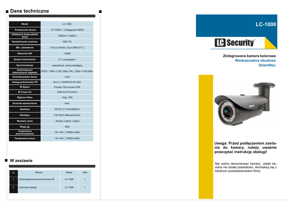 Dane techniczne LC-1000 Model LC-1000 Przetwornik obrazu 1/3" SONY 1.3 Megapixel CMOS Efektywna liczba pikseli (HxV) 1305(H) x 1049(V) Rozdzielczość pozioma 1000 TVL Min. oświetlenie 0.01Lux (Kolor), 0Lux (B/W) F1 2 Stosunek S/N >50dB System skanowania 2:1 z przeplotem Synchronizacja wewnętrzna, siecią zasilającą Automatyczna elektroniczna migawka NTSC: 1/60s~1/100, 000s, PAL: 1/50s~1/100,000s Charakterystyka Gama 0.45 Zasięg podczerwieni IR 40 m ( Zintegrowana kamera kolorowa Wodoszczelna obudowa Dzień/Noc 5X42PCS IR LED) IR Status Poniżej 10Lux przez CDS IR Power On CDS AUTO Control Wyjście Video 1Vpp, 75Ω Kontrola wzmocnienia Auto Zasilanie DC12V (+/-10%)/500mA Obiektyw 2.8-12mm (Manual Zoom) Wymiary (mm) 291(W) x 90(H) x 93(D) Waga (g) 1600 Temperatura przechowywania -30~+60 RH95% MAX Temperatura pracy -10~+50 RH95% MAX Uwaga: Przed podłączeniem zasilania do kamery, należy uważnie przeczytać instrukcję obsługi! W zestawie Lp. Nazwa Model Ilość 1. Wodoodporna kamera kolorowa IR LC-1000 1 2. Instrukcja obsługi LC-1000 1 Nie wolno demontować kamery. Jeżeli kamera nie działa prawidłowo, skontaktuj się z lokalnym przedstawicielem firmy. OPIS PRODUKTU WPROWADZENIE POŁĄCZENIA * Przetwornik Zastosowano 1/3" CMOS Sony. * Automatyczna kontrola wzmocnienia (AGC) Wbudowana automatyczna regulacja wzmocnienia (AGC). Kamera kolorowa można uzyskać obraz wysokiej rozdzielczości w warunkach słabego oświetlenia. * Tryb skanowania Tryb NTSC lub PAL * Wodoodporność Obudowa o klasie szczelności IP66 * Funkcja UTC Z pilotem zdalnego sterowania UTC do wygodnej konfiguracji ustawień w menu OSD * Ustawienia OSD 3D-NR AE MODE On / Off Global / Center / Center Weight/ Black Light / Front Light / Distinguish IMAGE ENHANCE Sharpness / Contrast / Saturation OBRAZ MIRROR On / Off FLIP On / Off BRIGHTNESS ZOOM IN 0.10.20......250 50. 60. 70. 80. 90. 100 Video KLAWIATURA LC-1000 DC12V GÓRA Proszę uważnie przeczytać instrukcję obsługi w celu zapewnienia prawidłowego stosowania produktu. MENU Zasada łączenia: PRAWO LEWO Video Zasilanie WCIŚNIJ DÓŁ DC12V Źródło zasilania ROZWIĄZYWANIE PROBLEMÓW IR-CUT AWB-PRO 1. Brak obrazu po podaniu zasilania - Możliwe, że źródło zasilania podaje niewłaściwe napięcie, należy sprawdzić napięcie na wyjściu zasilacza. - Sprawdź wszystkie połączenia kablowe i określi czy zostały wykonane prawidłowo czy nie. AWB-TEMPORAL AWB-AI WB AWB-SZ AWB-GW OSD SET AWB-CCT ZONE COLOR MASKING AREA NO.0 - AREA NO.7 DIRECTION AREA NO.0 - AREA NO.3 LANGUAGE SOFT VERION SAVE&EXIT 3. Tło obrazu kolorowego zmienia się w sposób ciągły - Świetlówki powodują powstanie pola elektromagnetycznego, które wpływa na kolory. Jest to powszechne zjawisko u kamer. - Zmniejszenie liczby lamp fluorescencyjnych lub zwiększenie odległości między kamerą i lampami fluorescencyjnymi może poprawić jakość pracy kamery. - Użyj zewnętrznego źródła synchronizacji. 4. Rozmyty obraz - Niestabilne napięcie źródła zasilania. - Nieprawidłowo wykonane połączenia kablowe lub za wysoka impedancja. Uwaga: ENGLISH CHINESE LOAD DEFAULT Mosaic / White / Yellow / Cyan / Green / Magenta / Red / Blue / Black Symbol ma na celu zwrócenie uwagi użytkownika na istotne zasady eksploatacji i utrzymania (konserwacji) Instrukcje w literaturze towarzyszącej urządzeniu. Symbol ma na celu zwrócenie uwagi użytkownika na obecność 2. Na obrazie występują płynące fale zakłóceń - Przyczyną mogą być szumy występujące podczas dostaw zasilania AC, konieczne zastosowanie filtru fali zasilania. - Sprawdź monitor i zastosowane urządzenia peryferyjne. AUTO DZIEŃ/NOC Monitor Gratulujemy zakupu tego produktu. Przedstawiamy instrukcję obsługi serii produktów LC-1000. W prezentowanej serii produktów zastosowaliśmy najnowsze rozwiązania technologiczne w dziedzinie przetwarzania obrazów SONY. Kamery kolorowe z serii LC-1000 wyróżniają się wysoką rozdzielczością obrazu oraz bogactwem rzeczywistych kolorów. Wbudowana funkcja Dzień/Noc z reflektorem IR LED oraz wodoszczelna obudowa zapewniają efektywny nadzór wideo nawet w trudnych warunkach środowiskowych. Wygodny montaż, łatwa obsługa oraz wysokie parametry pracy sprawiają, że jest to produkt doskonale nadający się do budowy efektywnych systemów CCTV. W komplecie wandaloodporny uchwyt. ● Zasilacz musi posiadać atest bezpieczeństwa. Jego napięcie wyjściowe, prąd, napięcie polaryzacji i temperatura robocza muszą być zgodne z wymogami kamery. ● Podczas korzystania z kamery w trakcie wyładowań atmosferycznych, należy pamiętać o zapewnieniu odpowiedniego uziemienia lub odłączyć kabel od źródła zasilania. ● W celu przechwycenia wysokiej jakości obrazu, kabel wideo i kabel zasila- nieizolowanych “niebezpiecznych napięć”, które mogą mieć wystarczającą wielkość, aby stworzyć ryzyko porażenia osób prądem. OSTRZEŻENIE: RYZYKO PORAŻENIA. NIE OTWIERAĆ UWAGA: ABY ZMNIEJSZYĆ RYZYKO PORAŻENIA PRĄDEM NIE NALEŻY ZDEJMOWAĆ POKRYWY I DOTYKAĆ SPRAWNYCH URZĄDZEŃ WE WNĘTRZU. SERWISOWANIE NALEŻY POWIERZAĆ WYKWALIFIKOWANEMU PERSONE- UWAGA: Aby uniknąć wstrząsów elektrycznych i ryzyka wystąpienia zagrożeń pożarowych, nie należy używać innych niż określone, źródeł zasilania. Uwaga: ● Należy pamiętać o temperaturze pracy oraz o stosowaniu kamery zgodnie z jej wymogami środowiskowymi. Unikaj stosowania kamery w zbyt wysokiej lub zbyt niskiej temperaturze. Temperatura robocza od -30~+60℃ (rekomendowana -10~+50℃). ● Nie należy ustawiać kamery w kierunku słońca lub silnych źródeł światła, ponieważ może to doprowadzić do uszkodzenia matrycy CMOS. ● Nie montować kamery w pobliżu grzejników i silnych źródeł ciepła.