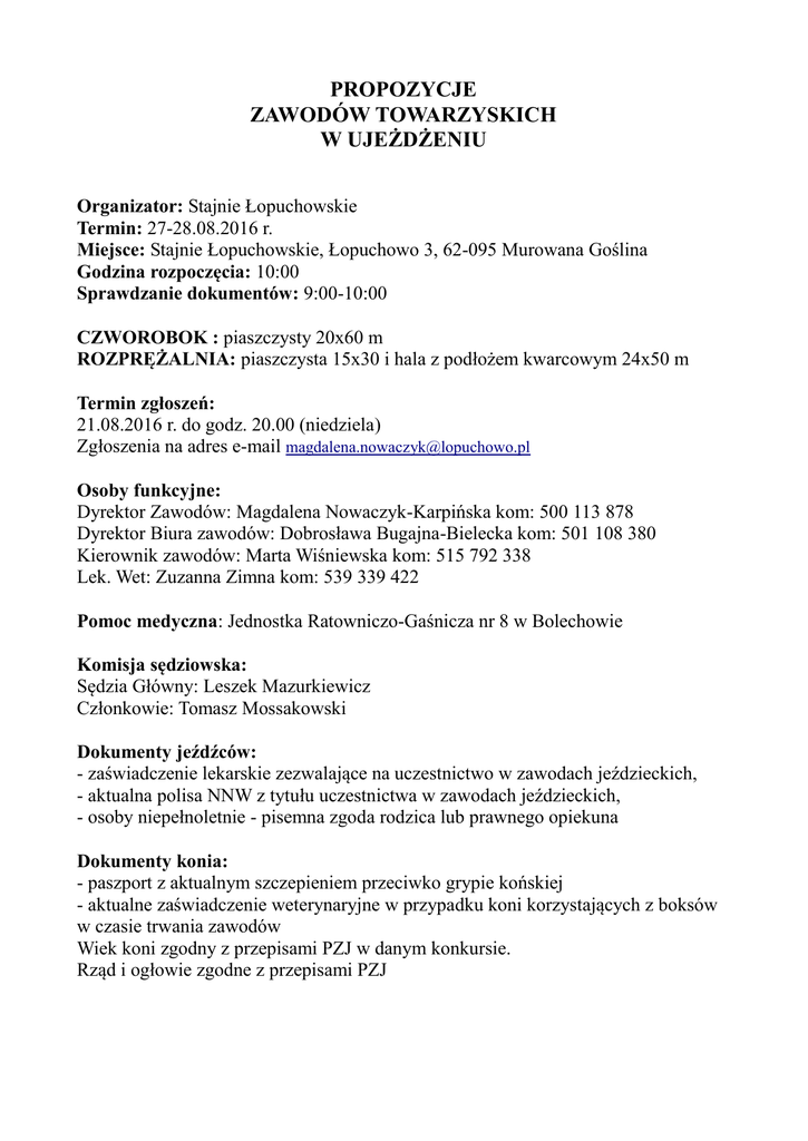 PROPOZYCJE ZAWODÓW TOWARZYSKICH W UJEŻDŻENIU Organizator: Stajnie Łopuchowskie Termin: 27-28.08.2016 r. Miejsce: Stajnie Łopuchowskie, Łopuchowo 3, 62-095 Murowana Goślina Godzina rozpoczęcia: 10:00 Sprawdzanie dokumentów: 9:00-10:00 CZWOROBOK : piaszczysty 20x60 m ROZPRĘŻALNIA: piaszczysta 15x30 i hala z podłożem kwarcowym 24x50 m Termin zgłoszeń: 21.08.2016 r. do godz. 20.00 (niedziela) Zgłoszenia na adres e-mail [email protected] Osoby funkcyjne: Dyrektor Zawodów: Magdalena Nowaczyk-Karpińska kom: 500 113 878 Dyrektor Biura zawodów: Dobrosława Bugajna-Bielecka kom: 501 108 380 Kierownik zawodów: Marta Wiśniewska kom: 515 792 338 Lek. Wet: Zuzanna Zimna kom: 539 339 422 Pomoc medyczna: Jednostka Ratowniczo-Gaśnicza nr 8 w Bolechowie Komisja sędziowska: Sędzia Główny: Leszek Mazurkiewicz Członkowie: Tomasz Mossakowski Dokumenty jeźdźców: - zaświadczenie lekarskie zezwalające na uczestnictwo w zawodach jeździeckich, - aktualna polisa NNW z tytułu uczestnictwa w zawodach jeździeckich, - osoby niepełnoletnie - pisemna zgoda rodzica lub prawnego opiekuna Dokumenty konia: - paszport z aktualnym szczepieniem przeciwko grypie końskiej - aktualne zaświadczenie weterynaryjne w przypadku koni korzystających z boksów w czasie trwania zawodów Wiek koni zgodny z przepisami PZJ w danym konkursie. Rząd i ogłowie zgodne z przepisami PZJ Opłaty: Opłata organizacyjna 100 zł/całe zawody, 60 zł/jeden dzień Opłata za boksy: 50zł/dzień (organizator zapewnia pierwszą ściółkę – słomę) Pierwszeństwo w rezerwacji boksów mają zawodnicy biorący udział w dwóch dniach zawodów. Istnieje możliwość dościelania boksu w sobotę i niedzielę (opłata 10 zł /dzień) oraz zakupu siana 10 zł/4 kg. Istnieje możliwość przyjazdu z koniem i zajęcia boksu od dnia 26.08.2016r. (piątek) od godziny 15 (dodatkowa opłata 30 zł) Opłaty za boksy należy uiścić do dnia 21.08.2016r. Do godziny 20:00 należy przesłać potwierdzenie przelewu za boks na maila [email protected] Brak przesłanego potwierdzenia przelewu do powyższego terminu jest jednoznaczny z rezygnacją rezerwacji. Opłata za niewykorzystany boks jest bezzwrotna. Każda zmiana na listach startowych – po ich zamieszczeniu 20 zł, nie dotyczy skreśleń. Nr konta: 75 1050 1445 1000 0090 7587 0916 Dobrosława Bugajna-Bielecka Organizator zastrzega sobie prawo do zmian w programie zawodów. Organizator nie odpowiada za wypadki, szkody i kradzieże powstałe w trakcie zawodów i w czasie transportu. Wszystkich uczestników zawodów obowiązuje KODEKS POSTĘPOWANIA Z KONIEM Komitet Organizacyjny nie ponosi żadnej odpowiedzialności w razie wypadków i zachorowań trenera, zawodników, luzaków i koni, jak również w przypadku kradzieży, zniszczeń, pożarów i innych wydarzeń. Zawodnicy i właściciele odpowiadają osobiście za zniszczenia w stosunku do osób trzecich, spowodowane przez nich samych, ich pracowników lub ich konie. Dlatego zalecane jest zawarcie stosownego pełnego ubezpieczenia OC na czas udziału w zawodach. Listy startowe oraz uaktualniony program dostępne na stronie fb Stajni Łopuchowskich i na www.hiposfera.pl Na terenie zawodów będzie działała gastronomia od soboty od godz. 10.00. Program: Sobota Niedziela Konkurs 8 - L3 Konkurs nr 9 – D3 Konkurs nr 10 – P2 Konkurs nr 1 – L2 Konkurs nr 2 – D2 Konkurs nr 3 – P1 Konkurs nr 4 – L1 (kuce) Konkurs nr 5 – P3 (kuce) Rundy L towarzyska D towarzyska P towarzyska Sobota Niedziela Konkurs nr 1 Konkurs nr 2 Konkurs nr 3 Konkurs nr 8 Konkurs nr 9 Konkurs nr 10 Opłata startowa za konkurs 20 zł 20 zł 20 zł Konkurs nr 1,4 i 5 będzie zaliczany do eliminacji Pucharu Wielkopolski w Ujeżdżeniu. Regulamin rozgrywania Pucharu Wielkopolski w Ujeżdżeniu dostępny w osobnym załączniku. Nagrody: Nagrody rzeczowe za miejsca 1-3 w Rundach Towarzyskich (przy sklasyfikowanych minimum 5-ciu zawodnikach). Floots dla wszystkich zawodników. KODEKS POSTĘPOWANIA Z KONIEM 1.Na wszystkich etapach treningu i przygotowania konia do startu w zawodach, dobro konia musi stać ponad wszelkimi innymi wymaganiami. Dotyczy to stałej opieki, metod treningu, starannego obrządku, kucia i transportu. 2.Konie i jeźdźcy muszą być wytrenowani, kompetentni i zdrowi zanim wezmą udział w zawodach. Odnosi się to także do podawania leków i środków medycznych, zabiegów chirurgicznych zagrażających dobru konia lub ciąży klaczy oraz do przypadków nadużywania pomocy. 3. Zawody nie mogą zagrażać dobru konia. Wymaga to zwrócenia szczególnej uwagi na teren zawodów, powierzchnię podłoża, pogodę, warunki stajenne, kondycję koni i ich bezpieczeństwo, także podczas podróży powrotnej z zawodów. 4. Należy dołożyć wszelkich starań, aby zapewnić koniom staranna opiekę po zakończeniu zawodów a także humanitarne traktowanie po zakończeniu kariery sportowej. Dotyczy to właściwej opieki weterynaryjnej obrażeń odniesionych na zawodach , spokojnej starości, ewentualnie eutanazji. 5. PZJ zachęca wszystkie osoby działające w sporcie jeździeckim do stałego podnoszenia swojej wiedzy oraz umiejętności dotyczących wszelkich aspektów współpracy z koniem. Zawody zostaną rozegrane zgodnie z uchwałą PZJ z dnia 06.12.2013r. Propozycje zatwierdzone przez WZJ w dniu 06.08.2016-Ryszard Szymoniak