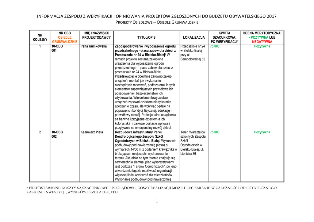 INFORMACJA ZESPOŁU Z WERYFIKACJI I OPINIOWANIA PROJEKTÓW ZGŁOSZONYCH DO BUDŻETU OBYWATELSKIEGO 2017 PROJEKTY OSIEDLOWE – OSIEDLE GRUNWALDZKIE NR KOLEJNY 1 2 NR OBB IMIĘ I NAZWISKO OSIEDLE PROJEKTODAWCY GRUNWALDZKIE 10-OBB Irena Kumkowska, 001 10-OBB 002 Kazimierz Piela TYTUŁ/OPIS LOKALIZACJA Zagospodarowanie i wyposażenie ogrodu przedszkolnego –placu zabaw dla dzieci z Przedszkola nr 24 w Bielsku-Białej/ W ramach projektu zostaną zakupione urządzenia dla wyposażenia ogrodu przedszkolnego – placu zabaw dla dzieci z przedszkola nr 24 w Bielsku-Białej. Przedsięwzięcie obejmuje zarówno zakup urządzeń, montaż jak i wykonanie niezbędnych mocowań, podłoża oraz innych elementów zapewniających prawidłowe ich posadowienie i bezpieczeństwo ich użytkowania. Wieloelementowy zestaw urządzeń zapewni dzieciom nie tylko miłe spędzanie czasu, ale wpływać będzie na poprawę ich kondycji fizycznej, edukację i prawidłowy rozwój. Profesjonalne urządzenia są barwne i przyjazne dzieciom a ich kolorystyka i bajkowe postacie wpływają pozytywnie na emocjonalny rozwój dzieci. Rozbudowa infrastruktury Parku Dendrologicznego Zespołu Szkół Ogrodniczych w Bielsku-Białej/ Wykonanie podbudowy pod nawierzchnię pieszą o wymiarach 14/50 m z dodaniem krawężnika w brakujących miejscach i wydrenowaniu terenu. Aktualnie na tym terenie znajduje się nawierzchnia ziemna, plac wykorzystywany jest podczas "Targów Ogrodniczych", po jego utwardzeniu będzie możliwość organizacji większej ilości wydarzeń dla mieszkańców. Wykonanie podbudowy pod nawierzchnię Przedszkole nr 24 w Bielsku-Białej przy ul. Sempołowskiej 52 Teren Warsztatów szkolnych Zespołu Szkół Ogrodniczych w Bielsku-Białej, ul. Lipnicka 36 KWOTA SZACUNKOWA: PO WERYFIKACJI* 75.000 75.000 OCENA MERYTORYCZNA: - POZTYWNA LUB NEGATYWNA Pozytywna Pozytywna * PRZEDSTAWIONE KOSZTY SĄ SZACUNKOWE I POGLĄDOWE, KOSZT REALIZACJI MOŻE ULEC ZMIANIE W ZALEŻNOŚCI OD OSTATECZNEGO ZAKRESU INWESTYCJI, WYNIKÓW PRZETARGU, ITD. 1 INFORMACJA ZESPOŁU Z WERYFIKACJI I OPINIOWANIA PROJEKTÓW ZGŁOSZONYCH DO BUDŻETU OBYWATELSKIEGO 2017 PROJEKTY OSIEDLOWE – OSIEDLE GRUNWALDZKIE NR KOLEJNY 3 NR OBB OSIEDLE GRUNWALDZKIE 10-OBB 003 IMIĘ I NAZWISKO PROJEKTODAWCY Katarzyna Lisecka TYTUŁ/OPIS LOKALIZACJA jezdną o wymiarach 30 / 20 m wraz z montażem krawężnika i wykonaniem drenażu. Plac wykorzystywany byłby pod miejsca parkingowe, zarówno podczas imprez organizowanych na terenie jak i w ciągu roku dla uczniów i pracowników szkoły oraz Miejskiego Zarządu Oświaty. Docelowo w przyszłości, po wykonaniu nawierzchni asfaltowej - jako plac manewrowy kat. T, która znajduje się w programie nauczania Zespołu Szkół Ogrodniczych. Siłownia zewnętrzna oraz rozbudowa placu zabaw/ Projekt zakłada budowę siłowni zewnętrznej oraz rozbudowę placu zabaw dla mieszkańców z Osiedla Grunwaldzkiego. Celem projektu jest integracja społeczna, aktywność fizyczna i edukacja poprzez zabawę. Ww. plac to dobra, sprawdzona lokalizacja w pobliżu budynków mieszkalnych co daje gwarancję dobrego dostępu i właściwego wykorzystania inwestycji. W ramach projektu przewiduje się montaż 8 urządzeń do ćwiczeń, doposażenie placu zabaw w: 2 sprężynowce (Roadster-auto, Konik), nawierzchnię pod sprężynowce oraz gra w klasy i gąsienica namalowane na chodniku przy placu zabaw. W kosztach projektu wnioskodawca uwzględnia również transport oraz montaż urządzeń i nawierzchni. Plac zabaw pomiędzy budynkiem przy ul. PCK 8 a budynkiem na ul. Młodości 1 KWOTA SZACUNKOWA: PO WERYFIKACJI* 75.000 OCENA MERYTORYCZNA: - POZTYWNA LUB NEGATYWNA Pozytywna * PRZEDSTAWIONE KOSZTY SĄ SZACUNKOWE I POGLĄDOWE, KOSZT REALIZACJI MOŻE ULEC ZMIANIE W ZALEŻNOŚCI OD OSTATECZNEGO ZAKRESU INWESTYCJI, WYNIKÓW PRZETARGU, ITD. 2