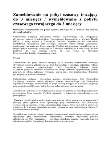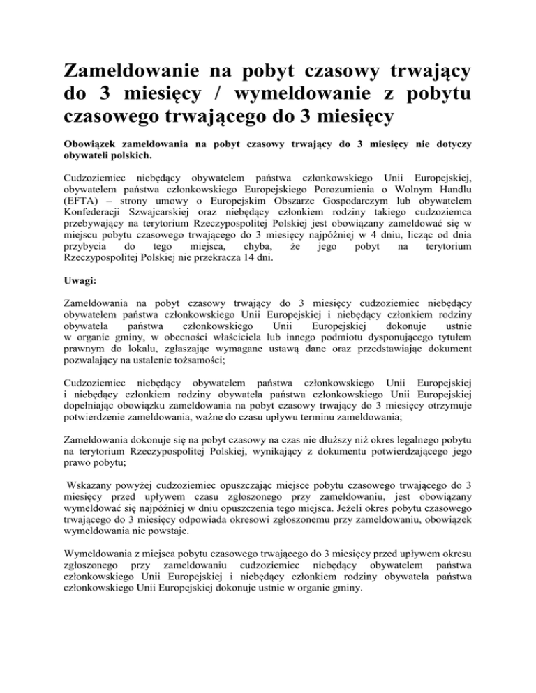 Zameldowanie na pobyt czasowy trwający do 3 miesięcy / wymeldowanie z pobytu czasowego trwającego do 3 miesięcy Obowiązek zameldowania na pobyt czasowy trwający do 3 miesięcy nie dotyczy obywateli polskich. Cudzoziemiec niebędący obywatelem państwa członkowskiego Unii Europejskiej, obywatelem państwa członkowskiego Europejskiego Porozumienia o Wolnym Handlu (EFTA) – strony umowy o Europejskim Obszarze Gospodarczym lub obywatelem Konfederacji Szwajcarskiej oraz niebędący członkiem rodziny takiego cudzoziemca przebywający na terytorium Rzeczypospolitej Polskiej jest obowiązany zameldować się w miejscu pobytu czasowego trwającego do 3 miesięcy najpóźniej w 4 dniu, licząc od dnia przybycia do tego miejsca, chyba, że jego pobyt na terytorium Rzeczypospolitej Polskiej nie przekracza 14 dni. Uwagi: Zameldowania na pobyt czasowy trwający do 3 miesięcy cudzoziemiec niebędący obywatelem państwa członkowskiego Unii Europejskiej i niebędący członkiem rodziny obywatela państwa członkowskiego Unii Europejskiej dokonuje ustnie w organie gminy, w obecności właściciela lub innego podmiotu dysponującego tytułem prawnym do lokalu, zgłaszając wymagane ustawą dane oraz przedstawiając dokument pozwalający na ustalenie tożsamości; Cudzoziemiec niebędący obywatelem państwa członkowskiego Unii Europejskiej i niebędący członkiem rodziny obywatela państwa członkowskiego Unii Europejskiej dopełniając obowiązku zameldowania na pobyt czasowy trwający do 3 miesięcy otrzymuje potwierdzenie zameldowania, ważne do czasu upływu terminu zameldowania; Zameldowania dokonuje się na pobyt czasowy na czas nie dłuższy niż okres legalnego pobytu na terytorium Rzeczypospolitej Polskiej, wynikający z dokumentu potwierdzającego jego prawo pobytu; Wskazany powyżej cudzoziemiec opuszczając miejsce pobytu czasowego trwającego do 3 miesięcy przed upływem czasu zgłoszonego przy zameldowaniu, jest obowiązany wymeldować się najpóźniej w dniu opuszczenia tego miejsca. Jeżeli okres pobytu czasowego trwającego do 3 miesięcy odpowiada okresowi zgłoszonemu przy zameldowaniu, obowiązek wymeldowania nie powstaje. Wymeldowania z miejsca pobytu czasowego trwającego do 3 miesięcy przed upływem okresu zgłoszonego przy zameldowaniu cudzoziemiec niebędący obywatelem państwa członkowskiego Unii Europejskiej i niebędący członkiem rodziny obywatela państwa członkowskiego Unii Europejskiej dokonuje ustnie w organie gminy.