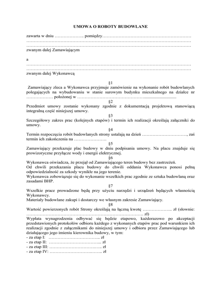 UMOWA O ROBOTY BUDOWLANE zawarta w dniu ……………….. pomiędzy…………………………………………………… ………………………………………………………………………………………………… ………………………………………………………………………………………………… zwanym dalej Zamawiającym a ………………………………………………………………………………………………… ………………………………………………………………………………………………… zwanym dalej Wykonawcą §1 Zamawiający zleca a Wykonawca przyjmuje zamówienie na wykonanie robót budowlanych polegających na wybudowaniu w stanie surowym budynku mieszkalnego na działce nr ……………… położonej w ………………………………………............................. §2 Przedmiot umowy zostanie wykonany zgodnie z dokumentacją projektową stanowiącą integralną część niniejszej umowy. §3 Szczegółowy zakres prac (kolejnych etapów) i termin ich realizacji określają załączniki do umowy. §4 Termin rozpoczęcia robót budowlanych strony ustalają na dzień …………………………, zaś termin ich zakończenia na …………………. §5 Zamawiający przekazuje plac budowy w dniu podpisania umowy. Na placu znajduje się prowizoryczne przyłącze wody i energii elektrycznej. §6 Wykonawca oświadcza, że przejął od Zamawiającego teren budowy bez zastrzeżeń. Od chwili przekazania placu budowy do chwili oddania Wykonawca ponosi pełną odpowiedzialność za szkody wynikłe na jego terenie. Wykonawca zobowiązuje się do wykonanie wszelkich prac zgodnie ze sztuka budowlaną oraz zasadami BHP. §7 Wszelkie prace prowadzone będą przy użyciu narzędzi i urządzeń będących własnością Wykonawcy. Materiały budowlane zakupi i dostarczy we własnym zakresie Zamawiający. §8 Wartość powierzonych robót Strony określają na łączną kwotę ……………….. zł (słownie: ……………………………………………………………………. zł) Wypłata wynagrodzenia odbywać się będzie etapowo, każdorazowo po akceptacji przedstawionych protokołów odbioru każdego z wykonanych etapów prac pod warunkiem ich realizacji zgodnie z załącznikami do niniejszej umowy i odbioru przez Zamawiającego lub działającego jego imieniu kierownika budowy, w tym: - za etap I: …………………………….. zł - za etap II: ……………………………... zł - za etap III: ………………………….….. zł - za etap IV: ……………………….…….. zł Wynagrodzenie będzie płatne w ciągu 7 dni po przedstawieniu przez Wykonawcę faktury VAT §9 W przypadku opóźnień w zakończeniu poszczególnych etapów robót budowlanych przekraczającego 14 dni Wykonawca zapłaci karę umowną w wysokości …………..% wartości wynagrodzenia danego etapu za każdy dzień zwłoki. W przypadku niedotrzymania terminu przez Wykonawcę, Zamawiający zastrzega sobie prawo dochodzenia odszkodowania z tego tytułu. §10 W przypadku odstąpienia od umowy przez Wykonawcę będzie on zobowiązany do zapłaty kary umownej w wysokości …………………….. zł. §11 Inwestorowi przysługuje prawo odstąpienia od umowy jeśli Wykonawca będzie wykonywał roboty niezgodnie z przyjętym harmonogramem lub w sposób niedbały, a po wezwaniu przez Zamawiającego nie zmieni sposobu ich wykonywania lub nie naprawi wadliwie wykonanych prac w terminie wskazanym przez Zamawiającego. §12 Wykonawca udziela 2-letniej gwarancji na wykonane prace i zobowiązuje się do natychmiastowego usunięcia usterek. §13 Wszelkie zmiany i uzupełnienia treści umowy mogą być dokonywane wyłącznie w formie pisemnej. §14 W sprawach nie uregulowanych postanowieniami umowy zastosowanie mieć będą przepisy Kodeksu Cywilnego §15 Umowy sporządzono w 2 jednobrzmiących egzemplarzach, po jednym dla każdej ze stron. ............................................. /Zamawiający/ ..................................................... /Wykonawca/