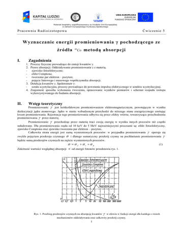 P raco wn i a R ad i o i z o t o p o wa Ć wi cz en i e 5 Wyznaczanie energii promieniowania γ pochodzącego ze źródła I. Co metodą absorpcji Zagadnienia 1. 2. 3. 4. II. 60 Procesy fizyczne prowadzące do emisji kwantów γ. Prawo absorpcji. Oddziaływanie promieniowania γ z materią. zjawisko fotoelektryczne; efekt Comptona; tworzenie par elektron – pozyton; pojęcie liniowego i masowego współczynnika absorpcji. Detekcja kwantów γ. Spektrometr γ: sonda scyntylacyjna, procesy prowadzące do powstania impulsu elektrycznego w sondzie scyntylacyjnej. Znajomość sposobu wykonania ćwiczenia, opracowanie wyników pomiarów i schemat rozpadu izotopu wykorzystywanego do badania absorpcji. Wstęp teoretyczny Promieniowanie γ jest krótkofalowym promieniowaniem elektromagnetycznym, powstającym w wyniku deekscytacji jądra atomowego. Jądro w stanie wzbudzonym przechodzi do niższego stanu energetycznego emitując kwant promieniowania. Rejestracja tego promieniowania odbywa się przez efekty wtórne, towarzyszące przechodzeniu promieniowania γ przez materię. Promieniowanie γ przechodząc przez materię traci swoją energię w wyniku innych procesów niż cząstki naładowane. Dla promieniowania rzędu od 10 keV do 5 MeV najważniejszymi procesami są: efekt fotoelektryczny, zjawisko Comptona oraz zjawisko tworzenia par elektron – pozyton.. Całkowita strata energii jest sumą wymienionych procesów: w przypadku promieniowania γ operuje się zwykle pojęciem przekroju czynnego σ i dlatego sumaryczny przekrój czynny na pochłanianie promieniowania γ będzie sumą przekrojów czynnych na zajście wymienionych procesów. σ =σ f +σc +σ p (1) Zależność wartości względnej absorpcji µ od energii fotonów przedstawia rys. 1. µ Rys. 1. Przebieg przekrojów czynnych na absorpcję kwantów γ w ołowiu w funkcji energii dla każdego z trzech mechanizmów oddziaływania oraz całkowity przekrój czynny. 1 P raco wn i a R ad i o i z o t o p o wa Ć wi cz en i e 5 Efekt fotoelektryczny polega na pochłonięciu fotonu przez atom, przy czym energia fotonu przekazana jednemu z elektronów, w wyniku czego uzyskujemy fotoelektrony o energii: Ee = Eγ − T j , γ zostaje (2) gdzie T j oznacza średnią energię jonizacji. Prawdopodobieństwo tego efektu silnie zależy od liczby porządkowej Z. Zjawisko fotoelektryczne ma praktyczne znaczenie przy energiach kwantu mniejszych od 0,5 MeV. Jeżeli energia kwantu γ przewyższa znacznie energię wiązania elektronów w atomie, elektrony takie można traktować jako swobodne. Padający kwant γ o energii hν rozprasza się na takich elektronach, dając w wyniku kwant o energii hν ' . Kierunek rozproszonego fotonu jest na ogół inny niż kierunek fotonu padającego. Elektron rozpraszający otrzymuje przy tym energię: E e = hν − hν ' , (3) oraz pęd: pe = gdzie θ gdzie Λ= hν hν ' − cosθ c c (4) jest kątem rozproszenia elektronu względem kierunku wiązki pierwotnej Widmo promieniowania rozproszonego zawiera oprócz promieniowania pierwotnego o długości fali λ linię przesuniętą o λ’>λ. Wielkość ∆λ = λ’ - λ rośnie ze wzrostem kąta rozproszenia, nie zależy natomiast od rodzaju substancji rozpraszającej. Korzystając z zasady zachowania energii i pędu można wyprowadzić wzór na ∆λ. ∆λ = λ '−λ = Λ (1 − cos θ ) (5) h = 2,42 ⋅10 −10 cm – comptonowska długość fali elektronu. me c Zjawisko Comptona jest zjawiskiem dominującym przy energiach kwantów γ z przedziału 0.5 – 5 MeV. Przy większych energiach kwantów γ może wystąpić zjawisko tworzenia par elektron – pozyton. Proces ten zachodzi w polu jądra lub elektronu. W zjawisku tym kwant γ ulega całkowitej absorpcji, a pojawia się para elektron i pozyton. Zjawisko tworzenia par może zachodzić wtedy gdy energia kwantu m0 c 2 - energia spoczynkowa elektronu. γ jest większa od energii 2m0 c 2 , gdzie Detekcja promieniowania γ polega na detekcji wtórnych elektronów. Do detekcji promieniowania γ można użyć dowolnego detektora z tym jednak, że do pomiarów ilościowych nadają się tylko takie, w których procesy straty energii promieniowania γ odbywa się w objętości czynnej. Zwykle do takich pomiarów stosuje się komory jonizacyjne o specjalnej konstrukcji i detektory scyntylacyjne. Urządzenie pomiarowe pracujące z licznikiem scyntylacyjnym zawiera scyntylator, fotopowielacz elektronowy ze stabilizowanym zasilaczem wysokiego napięcia, liniowy wzmacniacz impulsów, dyskryminator amplitudy impulsów i urządzenie rejestrujące. Scyntylatorami są substancje, w których pod wpływem padającego promieniowania zachodzi zjawisko luminescencji. Mogą nimi być kryształy nieorganiczne (NaI), organiczne (antracen, naftalen) i niektóre roztwory organiczne. Fotopowielaczami nazywa się lampę próżniową zawierającą fotokatodę, kilka (kilkanaście) dynod i anodę. Zasada działania takiego licznika opiera się na kilku procesach. Cząstka naładowana gdy przechodzi przez scyntylator traci energię na jonizację i wzbudzenie drobin scyntylatora. Część tej energii zostaje wypromieniowany w postaci fotonów światła widzialnego lub ultrafioletu. Niektóre z nich padając na fotokatodę fotopowielacza wybijają z niej fotoelektrony. Elektrony te, pod wpływem różnicy potencjałów, zostają przyspieszane i mogą wybijać kolejne elektrony z dynod. Taka lawina elektronów jest zbierana na anodzie i daje skok napięcia na oporze anodowym. Dalsze urządzenia wzmacniają i rejestrują impulsy. Przechodząc przez warstwę absorbenta część promieniowania zostaje pochłonięta. Natężenie wiązki po przejściu przez absorbent wynosi: I = I 0 exp(− µX ) (6) lub 2 P raco wn i a R ad i o i z o t o p o wa Ć wi cz en i e 5 µ I = I 0 exp(− µ m R ) = I 0 exp − Xρ ρ (7) gdzie I – strumień cząstek γ przechodzących przez absorbent o grubości X, I0 - strumień cząstek γ w nieobecności absorbenta, µ 