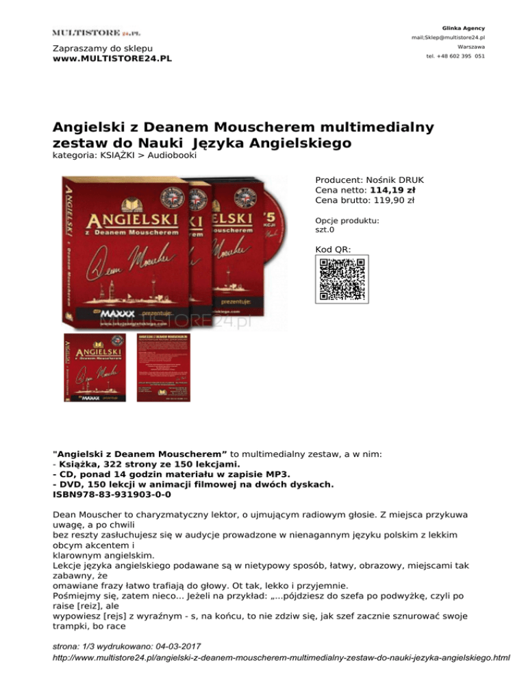 Glinka Agency mail;[email protected] Zapraszamy do sklepu www.MULTISTORE24.PL Warszawa tel. +48 602 395 051 Angielski z Deanem Mouscherem multimedialny zestaw do Nauki Języka Angielskiego kategoria: KSIĄŻKI > Audiobooki Producent: Nośnik DRUK Cena netto: 114,19 zł Cena brutto: 119,90 zł Opcje produktu: szt.0 Kod QR: "Angielski z Deanem Mouscherem” to multimedialny zestaw, a w nim: - Książka, 322 strony ze 150 lekcjami. - CD, ponad 14 godzin materiału w zapisie MP3. - DVD, 150 lekcji w animacji filmowej na dwóch dyskach. ISBN978-83-931903-0-0 Dean Mouscher to charyzmatyczny lektor, o ujmującym radiowym głosie. Z miejsca przykuwa uwagę, a po chwili bez reszty zasłuchujesz się w audycje prowadzone w nienagannym języku polskim z lekkim obcym akcentem i klarownym angielskim. Lekcje języka angielskiego podawane są w nietypowy sposób, łatwy, obrazowy, miejscami tak zabawny, że omawiane frazy łatwo trafiają do głowy. Ot tak, lekko i przyjemnie. Pośmiejmy się, zatem nieco... Jeżeli na przykład: „...pójdziesz do szefa po podwyżkę, czyli po raise [reiz], ale wypowiesz [rejs] z wyraźnym - s, na końcu, to nie zdziw się, jak szef zacznie sznurować swoje trampki, bo race strona: 1/3 wydrukowano: 04-03-2017 http://www.multistore24.pl/angielski-z-deanem-mouscherem-multimedialny-zestaw-do-nauki-jezyka-angielskiego.html [rejs] to po angielsku wyścig". Dean uczy jak w prosty sposób poruszać się w głębi czasów, od zaprzeszłego, przez teraźniejszy do przyszłego. Pokazuje łatwość stosowania przyimków, stopniuje obrazowo przymiotniki, rozświetla wieloznaczność niektórych słów, pozbawia obaw przed czasownikami nieregularnymi, których wcale nie jest tak dużo, wyławia najbardziej użyteczne słowa i zwroty w języku angielskim. Jest to rewolucyjny sposób przekazu, szalenie praktyczny, do zastosowania właściwie w każdej sytuacji i możecie być pewni, że po przyswojeniu jego rad, zawsze spotkacie sie z pozytywną reakcją Waszych rozmówców. Dzieło Deana odbiega od standardów stosowanych w szkołach, lecz dzięki niemu Twój angielski staje się płynny, zasobny w słowa oraz zwroty, bez względu na wiek czy stopień zaawansowania, a wydawcy jego szlagierowych lekcji, sięgając za Deanem, (który zajmuje się nawet przysłowiami, jako ważną i bardzo ciekawą częścią kultury i języka) mogą dodać: Lepiej późno niż wcale, co po angielsku brzmi zaskakująco podobnie: Better late than never [Better lejt then newer]. OD AUTORA Nauka języków to moja pasja. Zanim poznałem język polski, nauczyłem się mówić biegle po francusku i japońsku. Doskonale rozumiem problemy ludzi uczących się języków obcych i wiem jak najlepiej nauczyć ich płynnie rozmawiać po angielsku. Wykładałem angielski na Uniwersytecie Wrocławskim. Znając potrzeby Polaków uczących się tego języka, opracowałem unikatową metodę nauczania angielskiego. Ten program jest tak łatwy z bardzo prostej przyczyny. Tak naprawdę, jest bardzo mało programów angielskiego, przeznaczonych specjalnie i wyłącznie dla Polaków. A jeśli są już przygotowane dla Polaków - to wykonane zostały również przez Polaków - a nie przez tych, dla których angielski jest ojczystym językiem. O ile mi wiadomo, mój program jest jedynym, stworzonym specjalnie dla Polaków, przez Amerykanina. Nauczyłem się dobrze języka polskiego, będąc dorosłym i lepiej niż ktokolwiek inny rozumiem jak przekazać Polakom niuanse angielskiego, pokazać ważne różnice między językiem angielskim i polskim, aby uniknąć częstych błędów spotykanych nawet w podręcznikach do języka angielskiego. Sekrety mojej metody zawarte są w lekcjach na DVD, CD oraz w książce - będą one zabawiać i relaksować, przekazując jednocześnie wszystko, czego potrzebujecie, żeby zacząć płynnie rozmawiać po angielsku. Ponieważ, lekcje są dwujęzyczne i zaprojektowane tylko dla Polaków, nauczycie się dokładnie tego, co znaczą poszczególne słowa i wyrażenia - nie będziecie musieli więcej nic zgadywać. Możecie zrobić to w wolnych chwilach, wchłaniając zdania i struktury języka angielskiego automatycznie ze słuchu lub słuchając i czytając, jak kto woli. Nie będziecie więcej musieli wkuwać słówek i robić nudnych strona: 2/3 wydrukowano: 04-03-2017 http://www.multistore24.pl/angielski-z-deanem-mouscherem-multimedialny-zestaw-do-nauki-jezyka-angielskiego.html ćwiczeń gramatycznych. Lekcje te znane są z „Radio Rytm” w Nowym Jorku, z stacji „Polskie Radio” w Chicago i polskich stacji radiowych w Toronto: „Polskie Radio Toronto” - „Radio 7” oraz „Radio Polonia”. Moja szkoła języka angielskiego dla Polaków w Chicago nauczyła tysiące ludzi, rozmawiać płynnie po angielsku. Ty również możesz skorzystać z tej wiedzy a zobaczysz, jakie to proste… Ten program jest tak prosty i dostępny, że każdy opanuje angielski, bez względu na wiek i stopień zaawansowania! strona: 3/3 wydrukowano: 04-03-2017 http://www.multistore24.pl/angielski-z-deanem-mouscherem-multimedialny-zestaw-do-nauki-jezyka-angielskiego.html
