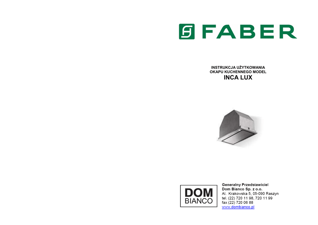 INSTRUKCJA UŻYTKOWANIA OKAPU KUCHENNEGO MODEL INCA LUX Dziękujemy za zaufanie i zakup naszego wyrobu. Gratulujemy dokonania dobrego wyboru. Mamy nadzieję, że urządzenie będzie Państwu służyć przez wiele lat. Okap jest przeznaczony do stosowania w indywidualnych gospodarstwach domowych i służy do eliminowania oparów i zapachów powstających podczas przyrządzania potraw. -1- - 12 Spis treści 1. Zalecenia i rady 2. Opisy okapów 3. Instalacja 4. Użytkowanie 5. Obsługa bieżąca 2 4 5 7 10 -2- 1. ZALECENIA I RADY Instrukcja dotyczy kilku wersji wymiarowych i kolorystycznych okapów kuchennych objętych nazwą „Inca Lux”, dlatego pewne informacje zawarte w niej nie muszą dotyczyć zakupionego przez Państwa modelu. Instalacja Producent i Generalny Przedstawiciel nie ponoszą żadnej odpowiedzialności prawnej i/lub materialnej za szkody powstałe w wyniku niewłaściwej instalacji okapu. Minimalna bezpieczna odległość między najwyższym punktem płyty grzewczej a dolną powierzchnią okapu wynosi 650 mm (niektóre modele mogą być instalowane niżej – patrz rozdziały poświęcone wymiarom i instalacji). Należy sprawdzić, czy parametry prądu w domowej instalacji elektrycznej odpowiadają wartościom podanym na tabliczce znamionowej urządzenia umieszczonej wewnątrz korpusu. Dla urządzeń klasy I należy skontrolować, czy domowa instalacja elektryczna zapewnia odpowiednie uziemienie okapu. Okap w wersji wyciąg należy łączyć z kanałem wentylacyjnym za pomocą rur o minimalnej średnicy 120 mm. Dukt powietrzny powinien być możliwie krótki. Nie wolno podłączać okapu do kanałów, którymi są odprowadzane spaliny z innych urządzeń (np. term gazowych i olejowych, kominków itp.). Jeżeli okap jest instalowany w pomieszczeniu, w którym znajdują się urządzenia zasilane energią inną niż elektryczna, to należy zapewnić odpowiednie przewietrzanie pomieszczenia w celu zapobiegnięcia nawrotowi spalin. Kuchnia musi być wyposażona w otwór ścienny wychodzący na zewnątrz budynku gwarantujący dopływ świeżego powietrza (rozporządzenie Ministra Infrastruktury z dnia 12 kwietnia 2002 r. w sprawie warunków technicznych, jakim powinny odpowiadać budynki i ich usytuowanie, Dz. U. nr 75 z 2002 r., poz. 690 wraz z późniejszymi zmianami i uzupełnieniami). Podciśnienie w pomieszczeniu kuchennym, w którym są stosowane urządzenia zasilane energią inną, niż elektryczna, nie może przekraczać 4 Pa (0,04 mbar). - 11 Resetowanie alarmu • Wyłączyć oświetlenie i silnik. • Nacisnąć i przytrzymać przez 3 s przycisk T3 do chwili, gdy lampka kontrolna mignie trzykrotnie. Wymiana filtrów z węgla aktywowanego • Otworzyć panel czołowy • Wyjąć pojedynczo metalowe filtry przeciwtłuszczowe naciskają płytkę zamka do tyłu i jednocześnie lekko pociągając filtr w dół. • Zdemontować zużyte filtry z węgla aktywowanego w sposób pokazany na rysunku obok (A). • Założyć nowe filtry w sposób pokazany na rysunku (B). • Zainstalować filtry przeciwtłuszczowe. • Sprawdzić, czy płytki zamków w pełni się wysunęły. • Zamknąć panel czołowy. 5.3. Oświetlenie Na zespół oświetleniowy składają się lampki halogenowe o mocy 20 W każda. • Wyjąć uszkodzoną lampkę z oprawki delikatnie ją wyciągając. • Założyć nową lampkę tego samego typu i o tej samej mocy upewniając się, czy druciki kontaktowe są prawidłowo umieszczone w oprawce. - 10 - 5. OBSŁUGA BIEŻĄCA -3Użytkowanie 5.1. Metalowe filtry przeciwtłuszczowe Filtry należy czyścić po zapaleniu się lampki kontrolnej S1, ale nie rzadziej, niż raz na dwa miesiące lub częściej, gdy okap jest intensywnie użytkowany. Resetowanie alarmu nasycenia • Wyłączyć silnik i oświetlenie. • Nacisnąć i przytrzymać przycisk T3 przez ok. 3 s do chwili, gdy lampa kontrolna mignie trzykrotnie. Czyszczenie filtrów • Otworzyć panel czołowy. • Wyjąć pojedynczo filtry naciskają płytkę zamka do tyłu i jednocześnie lekko pociągając filtr w dół. • Oczyścić filtry unikając ich zginania i pozostawić do całkowitego wyschnięcia, a następnie ponownie zainstalować. Zabarwienie powierzchni filtrów może z czasem ulegać zmianie, co nie ma znaczenia dla ich sprawności. • Zainstalować filtry i sprawdzić, czy płytki zamków w pełni się wysunęły. • Zamknąć panel czołowy. 5.2. Filtry z węgla aktywowanego (tylko w wersji pochłaniacz) Filtry z węgla aktywowanego są instalowane tylko w urządzeniach przeznaczonych do pracy w trybie pochłaniacz i zatrzymują na swojej powierzchni substancje zapachowe aż do nasycenia zdolności sorpcyjnych. Nie mogą być czyszczone ani regenerowane, lecz wymieniane, ale nie rzadziej, niż raz na 4 miesiące albo częściej, gdy okap jest użytkowany intensywnie. Alarm nasycenia filtrów, o ile został uaktywniony, pojawia się tylko przy wyłączonym silniku i oświetleniu. Uaktywnienie alarmu nasycenia • W przypadku instalowania okapu w wersji pochłaniacz alarm nasycenia filtrów węglowych można uruchomić podczas prac instalacyjnych lub później. • Wyłączyć silnik i oświetlenie. • Nacisnąć przycisk T2 i trzymać wciśnięty przez 5 s do chwili, gdy kontrolka mignie dwukrotnie – alarm nasycenia został uaktywniony. Okap został zaprojektowany do stosowania wyłącznie w indywidualnych gospodarstwach domowych do eliminowania zapachów powstających w kuchni. Nie wolno używać okapu do celów innych, niż te, do których został zaprojektowany. Nie wolno pozostawiać otwartego płomienia pod okapem podczas jego pracy. Wysokość płomienia należy regulować tak, aby nie wychodził on poza obrys dna naczynia. Podczas smażenia w głębokim tłuszczu proces gotowania musi być stale nadzorowany, gdyż przegrzany tłuszcz może ulec zapaleniu. Nie wolno pod okapem przyrządzać potraw flambowanych („płonących”) – zagrożenie pożarem. Okap nie może być obs