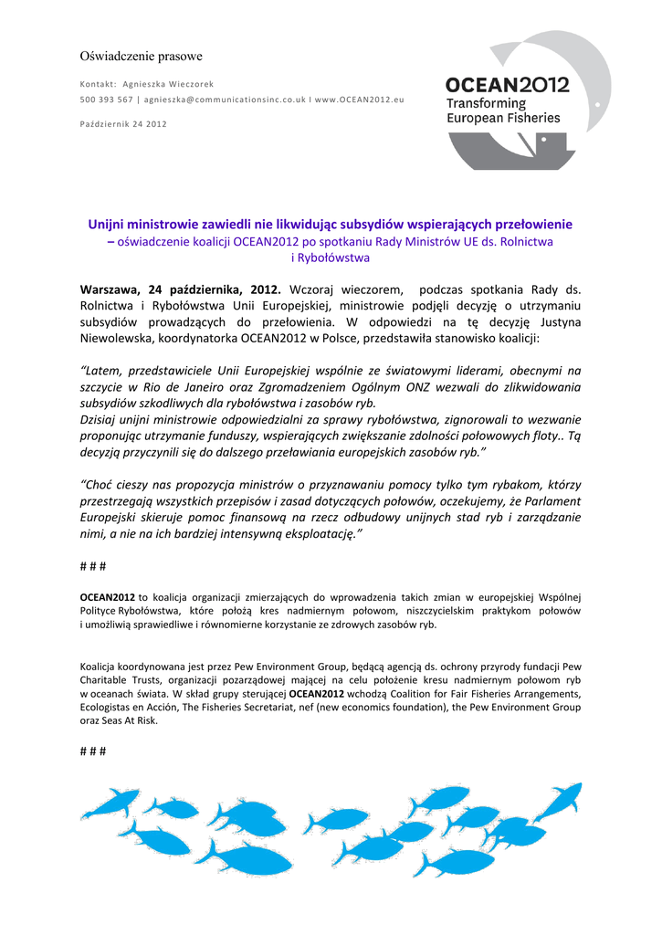 Oświadczenie prasowe Konta kt: Agn ies zka Wieczorek 500 393 567 | agnies zka@ com munica tions in c.co.u k I www.OCEAN2012.eu Październ ik 24 2012 Unijni ministrowie zawiedli nie likwidując subsydiów wspierających przełowienie – oświadczenie koalicji OCEAN2012 po spotkaniu Rady Ministrów UE ds. Rolnictwa i Rybołówstwa Warszawa, 24 października, 2012. Wczoraj wieczorem, podczas spotkania Rady ds. Rolnictwa i Rybołówstwa Unii Europejskiej, ministrowie podjęli decyzję o utrzymaniu subsydiów prowadzących do przełowienia. W odpowiedzi na tę decyzję Justyna Niewolewska, koordynatorka OCEAN2012 w Polsce, przedstawiła stanowisko koalicji: “Latem, przedstawiciele Unii Europejskiej wspólnie ze światowymi liderami, obecnymi na szczycie w Rio de Janeiro oraz Zgromadzeniem Ogólnym ONZ wezwali do zlikwidowania subsydiów szkodliwych dla rybołówstwa i zasobów ryb. Dzisiaj unijni ministrowie odpowiedzialni za sprawy rybołówstwa, zignorowali to wezwanie proponując utrzymanie funduszy, wspierających zwiększanie zdolności połowowych floty.. Tą decyzją przyczynili się do dalszego przeławiania europejskich zasobów ryb.” “Choć cieszy nas propozycja ministrów o przyznawaniu pomocy tylko tym rybakom, którzy przestrzegają wszystkich przepisów i zasad dotyczących połowów, oczekujemy, że Parlament Europejski skieruje pomoc finansową na rzecz odbudowy unijnych stad ryb i zarządzanie nimi, a nie na ich bardziej intensywną eksploatację.” ### OCEAN2012 to koalicja organizacji zmierzających do wprowadzenia takich zmian w europejskiej Wspólnej Polityce Rybołówstwa, które położą kres nadmiernym połowom, niszczycielskim praktykom połowów i umożliwią sprawiedliwe i równomierne korzystanie ze zdrowych zasobów ryb. Koalicja koordynowana jest przez Pew Environment Group, będącą agencją ds. ochrony przyrody fundacji Pew Charitable Trusts, organizacji pozarządowej mającej na celu położenie kresu nadmiernym połowom ryb w oceanach świata. W skład grupy sterującej OCEAN2012 wchodzą Coalition for Fair Fisheries Arrangements, Ecologistas en Acción, The Fisheries Secretariat, nef (new economics foundation), the Pew Environment Group oraz Seas At Risk. ###