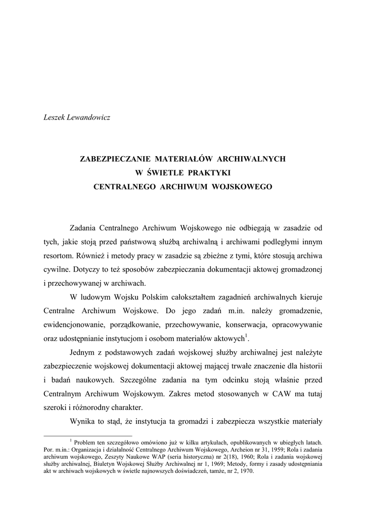Leszek Lewandowicz ZABEZPIECZANIE MATERIAŁÓW ARCHIWALNYCH W ŚWIETLE PRAKTYKI CENTRALNEGO ARCHIWUM WOJSKOWEGO Zadania Centralnego Archiwum Wojskowego nie odbiegają w zasadzie od tych, jakie stoją przed państwową służbą archiwalną i archiwami podległymi innym resortom. Również i metody pracy w zasadzie są zbieżne z tymi, które stosują archiwa cywilne. Dotyczy to też sposobów zabezpieczania dokumentacji aktowej gromadzonej i przechowywanej w archiwach. W ludowym Wojsku Polskim całokształtem zagadnień archiwalnych kieruje Centralne Archiwum Wojskowe. Do jego zadań m.in. należy gromadzenie, ewidencjonowanie, porządkowanie, przechowywanie, konserwacja, opracowywanie oraz udostępnianie instytucjom i osobom materiałów aktowych1. Jednym z podstawowych zadań wojskowej służby archiwalnej jest należyte zabezpieczenie wojskowej dokumentacji aktowej mającej trwałe znaczenie dla historii i badań naukowych. Szczególne zadania na tym odcinku stoją właśnie przed Centralnym Archiwum Wojskowym. Zakres metod stosowanych w CAW ma tutaj szeroki i różnorodny charakter. Wynika to stąd, że instytucja ta gromadzi i zabezpiecza wszystkie materiały 1 Problem ten szczegółowo omówiono już w kilku artykułach, opublikowanych w ubiegłych latach. Por. m.in.: Organizacja i działalność Centralnego Archiwum Wojskowego, Archeion nr 31, 1959; Rola i zadania archiwum wojskowego, Zeszyty Naukowe WAP (seria historyczna) nr 2(18), 1960; Rola i zadania wojskowej służby archiwalnej, Biuletyn Wojskowej Służby Archiwalnej nr 1, 1969; Metody, formy i zasady udostępniania akt w archiwach wojskowych w świetle najnowszych doświadczeń, tamże, nr 2, 1970. archiwalne wytworzone przez instytucje, zakłady i jednostki wojskowe od roku 1914 do czasów współczesnych2. * Metody zabezpieczania archiwaliów wojskowych stosowane; przez CAW podzielić można na dwa zasadnicze rodzaje. Pierwszy — to czuwanie i wpływ CAW na to, aby materiały o trwałym znaczeniu historycznym wytworzone w jednostkach i instytucjach wojskowych nie uległy zniszczeniu i znalazły się w archiwach terenowych, a następnie w Centralnym Archiwum Wojskowym. Drugi — to zabezpieczanie, pod względem konserwatorskim, archiwaliów wojskowych, które znalazły się już w archiwach terenowych i CAW. Ten sposób zabezpieczania podzielić można z kolei na szereg form, z których do podstawowych należy fizyczne zabezpieczenie akt drogą ich reperacji, oprawy introligatorskiej, przeprowadzania dezynsekcji akt skażonych i zagrożonych oraz ich mikrofilmowanie3. * Zgodnie z przepisami — archiwa terenowe utrzymują ścisły kontakt z kancelariami jednostek wojskowych w zakresie przygotowania akt do przekazania na dalsze przechowywanie. Chodzi o to, aby już tam oczyścić wytwór kancelaryjny z akt o wartości krótkotrwałej, tzw. kat. „C”, które przekazuje się na makulaturę, a równocześnie dopilnować, aby akta o dłuższym okresie przechowywania np. 10—50 lat zaliczone do kat. „B” nie uległy przedwczesnemu zniszczeniu i znalazły się w archiwach. Głównie chodzi jednak o to, aby akta o wartości trwałej zaliczone do kat. „A” z biegiem czasu przekazane zostały już na stałe przechowywanie do CAW4. 2 Informacje o zasobie aktowym Centralnego Archiwum Wojskowego podane zostały w kilku czasopismach: Zasób aktowy Centralnego Archiwum Wojskowego, Biuletyn WAP (seria historyczną) nr 2, 1959; Dwadzieścia lat działalności Centralnego Archiwum Wojskowego, Wojskowy Przegląd Historyczny nr 2, 1966; Początkowy okres kształtowania zasobu aktowego Centralnego Archiwum Wojskowego po zakończeniu wojny w roku 1945, Biuletyn Wojskowej Służby Archiwalnej nr 3, 1971. 3 Całokształt zagadnień związanych z metodami zabezpieczania archiwaliów omawiają: M. H u s a r s k a, I. S a d u r s k a, Konserwacja zbiorów archiwalnych i bibliotecznych. Warszawa 1968. 4 Sprawy związane z podziałem akt wojskowych na odpowiednie kategorie omawia J. M a l c z e w s k i, Selekcja akt w archiwach wojskowych, Biuletyn Wojskowej Służby Archiwalnej nr 4, 1972, Ważną czynnością jest kwalifikowanie akt, które wpłynęły już do archiwum terenowego. W pracach z tym związanych uczestniczy odpowiednia komisja wyznaczona okresowo przez dowódcę, któremu archiwum podlega. Członkami tej komisji są oficerowie reprezentujący poszczególne rodzaje wojsk i służb, których akta podlegają selekcji. Jednostki wojskowe przekazują do właściwego archiwum terenowego materiały archiwalne po 2—5 latach od chwili ich wytworzenia w zależności od rodzaju służby, licząc od 1 stycznia następnego roku po zakończeniu spraw5. Materiały kategorii „A” (o wartości trwałej) archiwa terenowe przechowują przez okres pięciu lat, po czym przekazują je do Centralnego Archiwum Wojskowego. W ten sposób wojskowa służba archiwalna na bieżąco zabezpiecza przed zniszczeniem materiały źródłowe o trwałej wartości historycznej, które po naukowym opracowaniu będą stanowić bazę dla przyszłych badań. Akta kategorii „B” (o czasowej wartości) zabezpieczają natomiast archiwa terenowe. Do obowiązków CAW należy zaś okresowa kontrola podstawowej działalności tych archiwów w zakresie metod przechowywania powierzonego zasobu aktowego. * Drugi rodzaj zabezpieczania materiałów archiwalnych o wartości trwałej, które znalazły się już w magazynach CAW dotyczy odpowiedniej ich konserwacji. Jak już wspomniano, CAW przechowuje źródła wojskowe z pierwszej i drugiej wojny światowej6. Wiele z nich uległo poważnemu zniszczeniu w czasie działań wojennych. Akta te w znacznej części zostały wytworzone na papierze niskiego gatunku, a częste ich udostępnianie dla celów naukowo-badawczych oraz poświadczeniowych powoduje poważne ich niszczenie. Zachodzi więc konieczność właściwego zabezpieczenia i zapewnienia archiwaliom jak najdłuższej trwałości. s. 14 i nast. 5 Całokształt zagad