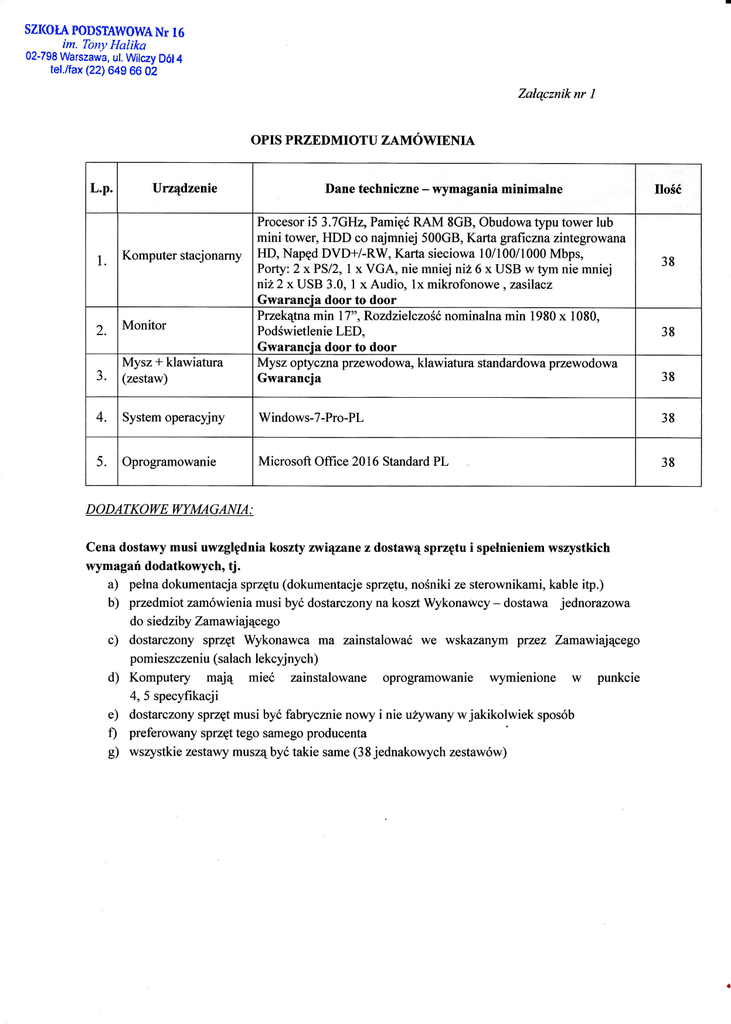 §ZIOŁAPOD§TAWOWANI 16 im. Tonv Halika 02-798Warszawa, ul, Wilczy Dól4 tel.|fax (22) 649 66 02 Załącznik nr l OPIS PRZEDMIOTU ZAMÓWIENIA L.p. l 2. Urządzenie Komputer stacjonarny Monitor Mysz + klawiatura Dane techniczne - rvymagania minimalne Procesor i5 3.7GHz, Pamięć RAM 8GB, Obudowa typu tower lub mini tower, HDD co najmniej 500GB, Karta graficznazintegrowana HD, Napęd DVD+/-RW,Karta sieciowa 10/100/1000 Mbps, Porty: 2 xPSlZ, l x VGA, nie mniej niż 6 x USB w Ęm nie mniej niż 2 x USB 3.0, 1 x Audio, lx mikrofon owe, zasi|acz Gwarancia door to door Przekątna min 17", Rozdzielczośó nominalna min 1980 x 1080, Podświetlenie LED, Gwarancia door to door Mysz optyczna przewodowa, klawiatura standardowa przewodowa Ilość 38 38 (zestaw) Gwarancja 38 4, System operacyjny Windows-7-Pro-PL 38 5. Oprogramowanie Microsoft Office 2016 Standard PL 38 J. DODATKOWE WMAGANIA: Cena dostawy musi uwzględnia koszty związane z dostawą sprzętu i spełnieniem wszystkich rvymagań dodatkowych, tj. a) pełna dokumentacja sprzętu (dokumentacje sprzętu, nośniki ze sterownikami, kable ię.) b) przedmiot zamówienia musi być dostarczony na kosź Wykonawcy - dostawa jednorazowa do s iedziby Zamaw iaj ące go c) dostarczony sprzęt Wykonawca ma zainstalowaó we wskazanym przez Zamawiającego pomieszczeniu (salach lekcyjnych) d) Komputery mają mieć zainstalowane oprogramowanie wymienione w punkcie 4, 5 specyfikacji e) dostarczony sprzęt musi byó fabrycznie nowy i nie używany w jakikolwiek sposób 0 preferowany sprzęt tego samego producenta g) wsrystkie zestawy musząbyó takie same (38 jednakowych zestawów)