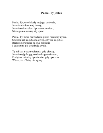 Panie, Ty jesteś Panie, Ty jesteś skałą mojego ocalenia, Jesteś światłem mej duszy; Jesteś moim celem i przeznaczeniem, Niczego nie muszę się lękać. Panie, Ty mnie prowadzisz przez meandry życia, Szukasz jak zagubioną owcę, gdy się zagubię; Bierzesz zranioną na swe ramiona I dajesz mi pić ze zdroju życia. Ty mi łzy z oczu ocierasz, gdy płaczę, Jesteś moją drogą, moim drogowskazem, Podajesz mi rękę i podnosisz gdy upadam. Wiem, że z Tobą nie zginę.