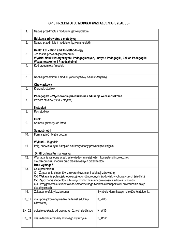 OPIS PRZEDMIOTU / MODUŁU KSZTAŁCENIA (SYLABUS) 1. Nazwa przedmiotu / modułu w języku polskim 2. Edukacja zdrowotna z metodyką Nazwa przedmiotu / modułu w języku angielskim 4. Health Education and Its Methodology Jednostka prowadząca przedmiot Wydział Nauk Historycznych i Pedagogicznych, Instytut Pedagogiki, Zakład Pedagogiki Wczesnoszkolnej i Przedszkolnej Kod przedmiotu / modułu 5. Rodzaj przedmiotu / modułu (obowiązkowy lub fakultatywny) 6. Obowiązkowy Kierunek studiów 7. Pedagogika – Wychowanie przedszkolne i edukacja wczesnoszkolna Poziom studiów (I lub II stopień) 8. II stopień Rok studiów 9. II rok Semestr (zimowy lub letni) 10. Semestr letni Forma zajęć i liczba godzin 11. Wykład – 15 godzin Imię, nazwisko, tytuł / stopień naukowy osoby prowadzącej zajęcia 3. 12. 13. 14. Dr Mirosława Furmanowska Wymagania wstępne w zakresie wiedzy, umiejętności i kompetencji społecznych dla przedmiotu / modułu oraz zrealizowanych przedmiotów Brak wymagań Cele przedmiotu: C-1 Zapoznanie studentów z uwarunkowaniami edukacji zdrowotnej C-2 Wskazanie potencjału edukacyjnego różnorodnych środowisk wychowawczych (siedlisk) C-3 Zapoznanie studentów z historycznymi zmianami pojmowania zdrowia i choroby C-4 Przygotowanie studentów do samodzielnego tworzenia konspektów i prowadzenia zajęć dydaktycznych Zakładane efekty kształcenia: Symbole kierunkowych efektów kształcenia: EK_01 ma uporządkowaną wiedzę na temat edukacji zdrowotnej K_W03 EK_02 opisuje edukację zdrowotną w różnych siedliskach K_W15 EK_03 charakteryzuje zasady zdrowego stylu życia K_W22 EK_04 weryfikuje i wdraża procedury edukacji zdrowotnej K_U11 EK_05 sporządza projekty działań prozdrowotnych K_U15 EK_06 aktywnie realizuje potrzebę permanentnego wzbogacania swego warsztatu pracy oraz swych osobistych i zawodowych kompetencji K_K01 15. Treści programowe: - Edukacja zdrowotna w aspekcie historycznym. - Definicje zdrowia i choroby. - Modele zdrowia. - Różnorodność siedlisk edukacji zdrowotnej. - Etyczne aspekty edukacji zdrowotnej. - Fakty i mity w sytuacjach zdrowotnych. - Etapy planowania programu edukacji zdrowotnej - Ewaluacja w edukacji zdrowotnej. - Zasady układania scenariusza zajęć. - Środki dydaktyczne w edukacji zdrowotnej. 16. Zalecana literatura: Literatura podstawowa: Karski J.B., Praktyka i teoria promocji zdrowia, Warszawa 2007. Woynarowska B., Edukacja zdrowotna. Podręcznik akademicki, Warszawa 2012. Stypułkowski C. Wychowanie zdrowotne w nauczaniu przedmiotowym, Kraków 2002. Literatura uzupełniająca Brzeziński T., Historia medycyny, Warszawa 2004. Charzyńska-Gula M., Środowiskowy program wychowania zdrowotnego w szkole. Scenariusze zajęć w klasach I-III, Lublin 1997. Cylkowska-Nowak M., Edukacja zdrowotna, Poznań 2008. Lewicki C. Edukacja zdrowotna – systemowa analiza zagadnień, Rzeszów 2006. Woynarowska B., Sokołowska M., Szkoła promująca zdrowie, Warszawa 2000. 17. Forma zaliczenia poszczególnych komponentów przedmiotu / modułu, sposób sprawdzenia osiągnięcia zamierzonych efektów kształcenia: - ma uporządkowaną wiedzę na temat edukacji zdrowotnej – EK_01 - opisuje edukację zdrowotną w różnych siedliskach – EK_02 - charakteryzuje zasady zdrowego stylu życia – EK_03 - weryfikuje i wdraża procedury edukacji zdrowotnej – EK_04 - sporządza projekty działań prozdrowotnych – EK_05 - aktywnie realizuje potrzebę permanentnego wzbogacania swego warsztatu pracy oraz swych osobistych i zawodowych kompetencji – EK_06 Systematyczna ocena udziału w dyskusji oraz swobodnych wypowiedzi ocena bardzo dobra – student ma ugruntowaną wiedzę z zakresu edukacji zdrowotnej. Opanował umiejętność wdrażania procedur edukacji zdrowotnej. Dobiera i stosuje właściwe metody nauczania. - ocena dobra - student ma wystarczającą wiedzę z zakresu edukacji zdrowotnej. Opanował na dobrym poziomie umiejętność wdrażania procedur edukacji zdrowotnej. Dobiera i stosuje właściwe metody nauczania. - ocena dostateczna - student ma podstawową wiedzę z zakresu edukacji zdrowotnej. Opanował umiejętność wdrażania procedur edukacji zdrowotnej. Poprawnie dobiera i stosuje właściwe metody nauczania. ocena niedostateczna – student nie posiada podstawowej wiedzy z zakresu edukacji zdrowotnej. Nie 18. 19. opanował umiejętności wdrażania procedur edukacji zdrowotnej. Nie radzi sobie z doborem i stosowaniem właściwych metod nauczania. Język wykładowy polski Obciążenie pracą studenta Forma aktywności studenta Godziny zajęć (według planu studiów) z nauczycielem: - wykład Praca własna studenta - czytanie wskazanej literatury Suma godzin Liczba punktów ECTS Średnia liczba godzin na zrealizowanie aktywności 15 15 30 1