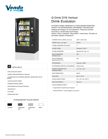 G-Drink DY6 Vertical Drink Evolution AUTOMAT NOWEJ GENERACJI Z PODAJNIKIEM-ROBOTEM OPARTY NA SPRAWDZONEJ JAPOŃSKIEJ TECHNOLOGII. Najlepiej sprzedający się nasz glassfront. Połączenie prostoty konstrukcji z wyrafinowaną technologią. Solidny i łatwy w obsłudze. NIezawodny i nowoczesny. Nie tylko do sprzedaży napojów chłodzących. LISTA OPCJI • OPCJE KOLORU SZAFY • ZAMEK PROGRAMOWANLY (RIELDA) • KLAWIATURA ANTYWANDALIZMOWA I BEZPIECZNY WLOT MONET • OSŁONA SZYBY DRZWI • ZABEZPIECZENIE ZAMKA • MOCOWANIE DO ŚCIANY/PODŁOGI CIĘŻAR (netto - bez opcji) 295 Kg LICZBA WYBORÓW NA PÓŁCE 6 LICZBA PÓŁEK Standard 5 / Max. 7 LICZBA WYBORÓW Standard 30 / Max. 42 MAX POJEMNOŚĆ (PUSZKI 0,33 l) 336 MAX POJEMNOŚĆ (BUTELKI PET 0,5 l) 240 STEROWANIE Executive / MDB STEROWANIE ZESPOŁU CHŁODZENIA Elektroniczne ZAKRES TEMPERATURY WEWNĘTRZNEJ +2°C do +10°C MAX POBÓR MOCY 800 W ZASILANIE 230 V / 50 Hz KLASA KLIMATYCZNA ST (+16°C do +38°C) ZUŻYCIE ENERGII ** 252 wh/h KLASA ENERGETYCZNA ** A ** Wg EVA EMP 3.0 - dane dostępne na życzenie • DYSTANS • RÓŻNE ZESTAWY STANDARDOWY KOLOR SZAFKI CIEMNOSZ ARY © Sanden International (Europe) Limited Powered by TCPDF (www.tcpdf.org) 1830* x 950 x 845 * Z regulowanymi śrubami poziomującymi • DEKORACJA CZARNY WYMIARY WYS x SZER x GŁ (mm) JASNOSZA RY BIAŁY
