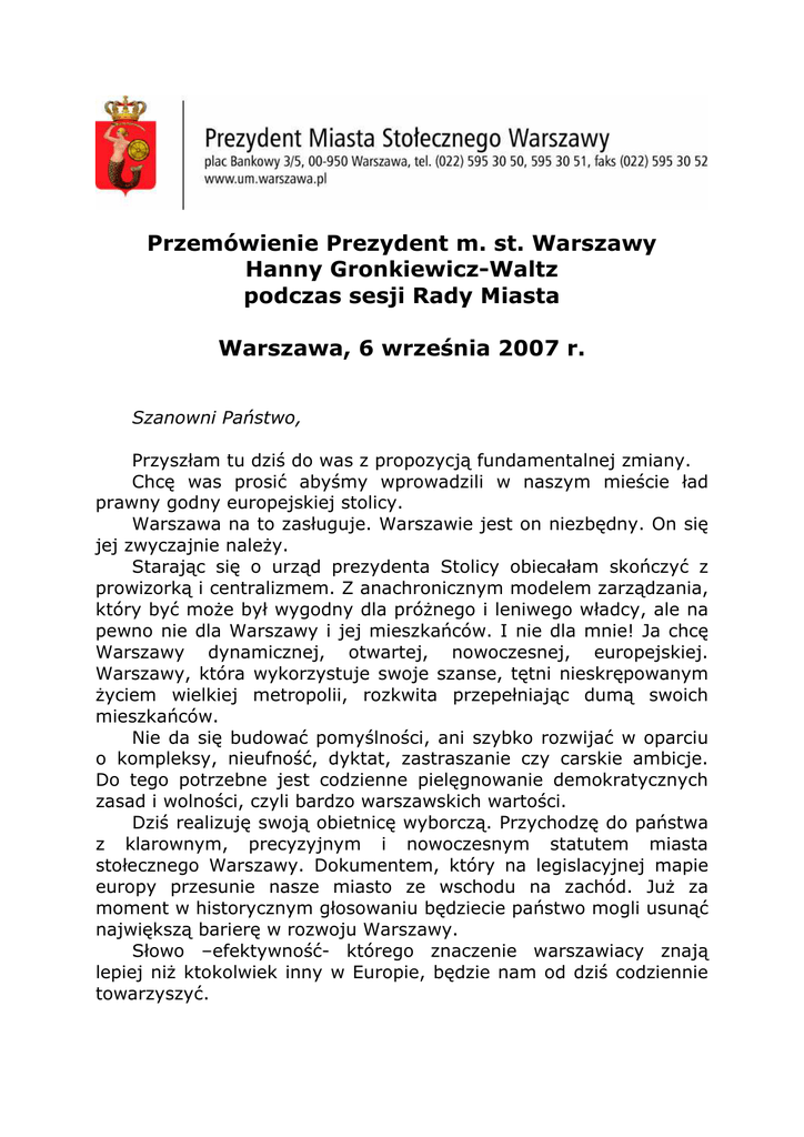 Przemówienie Prezydent m. st. Warszawy Hanny Gronkiewicz-Waltz podczas sesji Rady Miasta Warszawa, 6 września 2007 r. Szanowni Państwo, Przyszłam tu dziś do was z propozycją fundamentalnej zmiany. Chcę was prosić abyśmy wprowadzili w naszym mieście ład prawny godny europejskiej stolicy. Warszawa na to zasługuje. Warszawie jest on niezbędny. On się jej zwyczajnie naleŜy. Starając się o urząd prezydenta Stolicy obiecałam skończyć z prowizorką i centralizmem. Z anachronicznym modelem zarządzania, który być moŜe był wygodny dla próŜnego i leniwego władcy, ale na pewno nie dla Warszawy i jej mieszkańców. I nie dla mnie! Ja chcę Warszawy dynamicznej, otwartej, nowoczesnej, europejskiej. Warszawy, która wykorzystuje swoje szanse, tętni nieskrępowanym Ŝyciem wielkiej metropolii, rozkwita przepełniając dumą swoich mieszkańców. Nie da się budować pomyślności, ani szybko rozwijać w oparciu o kompleksy, nieufność, dyktat, zastraszanie czy carskie ambicje. Do tego potrzebne jest codzienne pielęgnowanie demokratycznych zasad i wolności, czyli bardzo warszawskich wartości. Dziś realizuję swoją obietnicę wyborczą. Przychodzę do państwa z klarownym, precyzyjnym i nowoczesnym statutem miasta stołecznego Warszawy. Dokumentem, który na legislacyjnej mapie europy przesunie nasze miasto ze wschodu na zachód. JuŜ za moment w historycznym głosowaniu będziecie państwo mogli usunąć największą barierę w rozwoju Warszawy. Słowo –efektywność- którego znaczenie warszawiacy znają lepiej niŜ ktokolwiek inny w Europie, będzie nam od dziś codziennie towarzyszyć. Namawiam abyście przyłoŜyli rękę do reformy rządzenia opartej na zasadach decentralizacji, pomocniczości i partycypacji społecznej. Zagłosujcie za statutem, który Warszawie i warszawiakom jest potrzebny, jak powietrze. Prace nad jego projektem rozpoczęłam niezwłocznie po objęciu obowiązków Prezydenta Warszawy . 22 stycznia 2007 r. powołałam zespół do opracowania projektu statutu. W jego skład weszli urzędnicy, prawnicy i eksperci, burmistrzowie dzielnic oraz - w roli obserwatora - Przewodniczący Komisji Statutowej Rady m.st. Warszawy. Opracowany przez zespół projekt statutu m.st. Warszawy przesłałam miesiąc później do Rady m.st. Warszawy. W wyniku prac Komisji Statutowo -Regulaminowej powstała kolejna wersja projektu zawierająca rozwiązania, które są gwarantem wykonywania ustawowych zadań w zakresie zaspokajania potrzeb mieszkańców w sposób przejrzysty i zrozumiały dla wszystkich. Zasady decentralizacji i pomocniczości gwarantują organom dzielnic moŜliwości istotnego wpływu na rozwój miasta i przenoszą na poziom jednostek pomocniczych zadania o charakterze stricte lokalnym i organizacyjnym. Decentralizacji ulega nie tylko zarządzanie miastem – decentralizacji ulega przede wszystkim myślenie o tym, jak najskuteczniej, jak najbliŜej mieszańców naleŜy rozwiązywać ich problemy. Jestem zdecydowaną zwolenniczką twierdzenia, Ŝe kaŜdy problem powinien być rozwiązywany na jak najniŜszym szczeblu. Dlatego statut, który państwu prezentuję zawiera klarowny podział na zadania wykonywane na poziomie miasta i dzielnic i przekazuje im wiele kompetencji. Chodzi o sprawy o zasięgu dzielnicowym dotyczące: • inwestycji, • geodezji i kartografii, • ochrony praw lokatorów i dodatków mieszkaniowych, • działalności kulturalnej, • ochrony środowiska, odpadów i wód, • dróg publicznych, z wyłączeniem dróg przekazanych innym podmiotom, transportu drogowego, ruchu drogowego i przewozów, • architektury i budownictwa, • działalności gospodarczej, • ewidencji ludności i dowodów osobistych, • podatków i opłat lokalnych oraz opłaty skarbowej, podatku rolnego, leśnego, a takŜe ubezpieczenia społecznego rolników, • promocji dzielnicy, uŜywania własnych herbów, wnioskowania do Prezydenta w sprawie struktury organizacyjnej • a takŜe innych spraw przekazanych dzielnicom uchwałą Rady Miasta. Katalog tych spraw pokazuje zakres decentralizacji. Oczywiście granice samodzielności dzielnicy i szczegółowe katalogi zadań będą moŜliwe do określenia w odrębnej uchwale kompetencyjnej, co pozwoli w przyszłości uniknąć sporów kompetencyjnych pomiędzy miastem a dzielnicą. Opracowanie projektu takiej uchwały jest juŜ w toku. Statut dostrzega teŜ istotną rolę organów Dzielnic w procesie podejmowania decyzji w waŜnych sprawach dla miasta, np.: poprzez moŜliwość przeprowadzania konsultacji społecznych wśród mieszkańców dzielnicy lub organizacji referendów. Udział obywateli w decydowaniu o sprawach samorządu m.st. Warszawy i wspólnego rozwiązywania problemów lokalnej społeczności wynika ze wspomnianej przeze mnie na początku zasady partycypacji społecznej. Statut w ślad za przekazaniem zadań i kompetencji określa równieŜ zasady finansowania dzielnic poprzez zapewnienie im środków finansowych na zadania przekazane im do realizacji, określając jednocześnie ich minimalną wysokość tj. wskazując, Ŝe nie mogą być one mniejsze, niŜ określone w art.12 „ustawy warszawskiej”. W statucie znalazł się równieŜ zapis o tym, Ŝe przy podziale środków Rada Miasta uwzględnia zasadę równomiernego rozwoju wszystkich Dzielnic. Statut upowaŜnia ponadto Radę Miasta do: tworzenia, łączenia, dzielenia i znoszenia Dzielnic Miasta - po przeprowadzeniu konsultacji z mieszkańcami lub z ich inicjatywy, do powoływania i odwoływania Miejskiego Rzecznika konsumentów. Statut daje moŜliwość Przewodniczącemu Rady m.st. Warszawy udzielenia głosu osobie nie będącej radnym oraz uprawnia do tworzenia jednostek pomocniczych niŜszego rzędu np.: rad osiedlowych, na wniosek, co najmniej 10% mieszkańców, uprawnionych do głosowania, zamieszkałych na terenie jednostki. Istotną rolę będzie odgrywał przepis, który umoŜliwi miastu tworzenie jednostek organizacyjnych pr