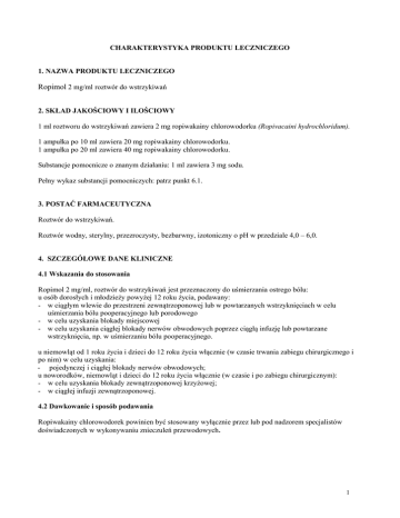 CHARAKTERYSTYKA PRODUKTU LECZNICZEGO 1. NAZWA PRODUKTU LECZNICZEGO Ropimol 2 mg/ml roztwór do wstrzykiwań 2. SKŁAD JAKOŚCIOWY I ILOŚCIOWY 1 ml roztworu do wstrzykiwań zawiera 2 mg ropiwakainy chlorowodorku (Ropivacaini hydrochloridum). 1 ampułka po 10 ml zawiera 20 mg ropiwakainy chlorowodorku. 1 ampułka po 20 ml zawiera 40 mg ropiwakainy chlorowodorku. Substancje pomocnicze o znanym działaniu: 1 ml zawiera 3 mg sodu. Pełny wykaz substancji pomocniczych: patrz punkt 6.1. 3. POSTAĆ FARMACEUTYCZNA Roztwór do wstrzykiwań. Roztwór wodny, sterylny, przezroczysty, bezbarwny, izotoniczny o pH w przedziale 4,0 – 6,0. 4. SZCZEGÓŁOWE DANE KLINICZNE 4.1 Wskazania do stosowania Ropimol 2 mg/ml, roztwór do wstrzykiwań jest przeznaczony do uśmierzania ostrego bólu: u osób dorosłych i młodzieży powyżej 12 roku życia, podawany: - w ciągłym wlewie do przestrzeni zewnątrzoponowej lub w powtarzanych wstrzyknięciach w celu uśmierzania bólu pooperacyjnego lub porodowego - w celu uzyskania blokady miejscowej - w celu uzyskania ciągłej blokady nerwów obwodowych poprzez ciągłą infuzję lub powtarzane wstrzyknięcia, np. w uśmierzaniu bólu pooperacyjnego. u niemowląt od 1 roku życia i dzieci do 12 roku życia włącznie (w czasie trwania zabiegu chirurgicznego i po nim) w celu uzyskania: - pojedynczej i ciągłej blokady nerwów obwodowych; u noworodków, niemowląt i dzieci do 12 roku życia włącznie (w czasie i po zabiegu chirurgicznym): - w celu uzyskania blokady zewnątrzoponowej krzyżowej; - w ciągłej infuzji zewnątrzoponowej. 4.2 Dawkowanie i sposób podawania Ropiwakainy chlorowodorek powinien być stosowany wyłącznie przez lub pod nadzorem specjalistów doświadczonych w wykonywaniu znieczuleń przewodowych. 1 Dawkowanie DOROŚLI I MŁODZIEŻ POWYŻEJ 12 ROKU ŻYCIA Poniższa tabela przedstawia dawkowanie zalecane dla najczęściej stosowanych typów znieczuleń. Obowiązuje zasada podawania najmniejszej skutecznej dawki. Dawkowanie należy ustalić na podstawie doświadczenia specjalisty oraz stanu ogólnego pacjenta. Tabela 1 Dorośli i młodzież powyżej 12 roku życia ZNIECZULENIA W CHIRURGII Znieczulenie zewnątrzoponowe w odcinku lędźwiowym Stężenie Objętość Dawka (§) Czas Czas trwania mg/ml ml mg indukcji Chirurgia 7,5 15-25 113-188 10-20 3-5 10 15-20 150-200 10-20 4-6 Cięcie cesarskie 7,5 15-20 113-150 (1) 10-20 3-5 Znieczulenie zewnątrzoponowe w odcinku piersiowym Blokada w zwalczaniu bólu 7,5 5-15 38-113 10-20 n/a (2) pooperacyjnego (w zależności od poziomu wstrzykiwania) Blokada dużych nerwów* 10-25 6-10 Blokada splotu ramiennego 7,5 30-40 225 300 (3) Blokada miejscowa (np. blokada małych nerwów i 7,5 1-30 7,5-225 1-15 2-6 infiltracja) ZWALCZANIE OSTREGO BÓLU Znieczulenie zewnątrzoponowe w odcinku lędźwiowym Bolus 2 10-20 20-40 10-15 0,5-1,5 Powtarzane wstrzykiwania 2 10-15 20-30 (np. zwalczanie bólu porodowego) (minimalny odstęp 30 minut) Infuzja ciągła, np. ból porodowy 2 6-10 ml/h 12-20 mg/h n/a n/a Zwalczanie bólu pooperacyjnego 2 6-14 ml/h 12-28 mg/h n/a n/a Znieczulenie zewnątrzoponowe w odcinku piersiowym Infuzja ciągła (zwalczanie bólu 2 6-14 ml/h 12-28 mg/h n/a n/a pooperacyjnego) Blokada miejscowa (np. blokada małych nerwów 2 1-100 2-200 1-5 2-6 obwodowych i infiltracja) Blokada nerwów obwodowych (blokada udowa lub z dostępu pomiędzy mięśniami pochyłymi) Infuzja ciągła lub powtarzane 2 5-10 ml/h 10-20 mg/h n/a n/a wstrzykiwanie (np. zwalczanie bólu pooperacyjnego) (§) Przyjmuje się, że przedstawione w tabeli dawki dotyczące ropiwakainy chlorowodorku są minimalnymi dawkami skutecznymi i powinny być traktowane jako wytyczne do stosowania u dorosłych pacjentów. Możliwe są indywidualne różnice w indukcji i okresie oddziaływania dawki. Dane w kolumnie „Dawka” odzwierciedlają średni przewidywany zakres niezbędnej do podania dawki ropiwakainy chlorowodorku. W celu uzyskania informacji dotyczących czynników wpływających na określone techniki blokowania, jak również wymagań dotyczących poszczególnych pacjentów, należy skorzystać ze standardowych podręczników. * W przypadku blokady dużych nerwów istnieją jedynie zalecenia dotyczące dawkowania przy blokadzie splotu ramiennego. Pozostałe blokady dużych nerwów mogą wymagać stosowania mniejszych dawek. Obecnie nie ma jednak popartych doświadczeniem zaleceń dotyczących określonego dawkowania w 2 1) 2) 3) przypadku innych blokad. Zaleca się stosowanie dawkowania wzrastającego, gdzie dawka inicjująca wynosząca około 100 mg (97,5 mg = 13 ml; 105 mg = 14 ml) podawana jest w przedziale czasowym 3-5 min. W razie potrzeby można podać dwie dodatkowe dawki, w sumie dodatkowo 50 mg. n/a = nie ma zastosowania Dawka przy blokadzie dużych nerwów musi być dostosowana do miejsca podania oraz stanu ogólnego pacjenta. Blokada splotu ramiennego z dostępu pomiędzy mięśniami pochyłymi oraz z dostępu nadobojczykowego może wiązać się ze zwiększonym ryzykiem wystąpienia ciężkich działań niepożądanych, niezależnie od rodzaju użytego miejscowego leku znieczulającego (patrz punkt 4.4.). Znieczulenia w chirurgii (np. podanie zewnątrzoponowe) wymagają stosowania większych stężeń i dawek. W zabiegach chirurgicznych, do których w znieczuleniach zewnątrzoponowych konieczne jest uzyskanie całkowitej blokady nerwów ruchowych zaleca się podanie ropiwakainy chlorowodorku w postaci roztworu do wstrzykiwań w stężeniu 10 mg/ml. Mniejsze stężenia i dawki zalecane są w przypadku analgezji (np. znieczulenie zewnątrzoponowe w zwalczaniu ostrego bólu). Sposób podawania Podanie nadtwardówkowe i okołonerwowe. Zaleca się uważną aspirację przed i podczas wstrzykiwania leku w celu uniknięcia podania donaczyniowego. W przypadku konieczności podania dużych dawek zaleca się zastosowanie próbnej dawki 3 do 5 ml roztworu lidokainy z adrenaliną. Niezamierzone podanie donaczyniowe można rozpoznać 