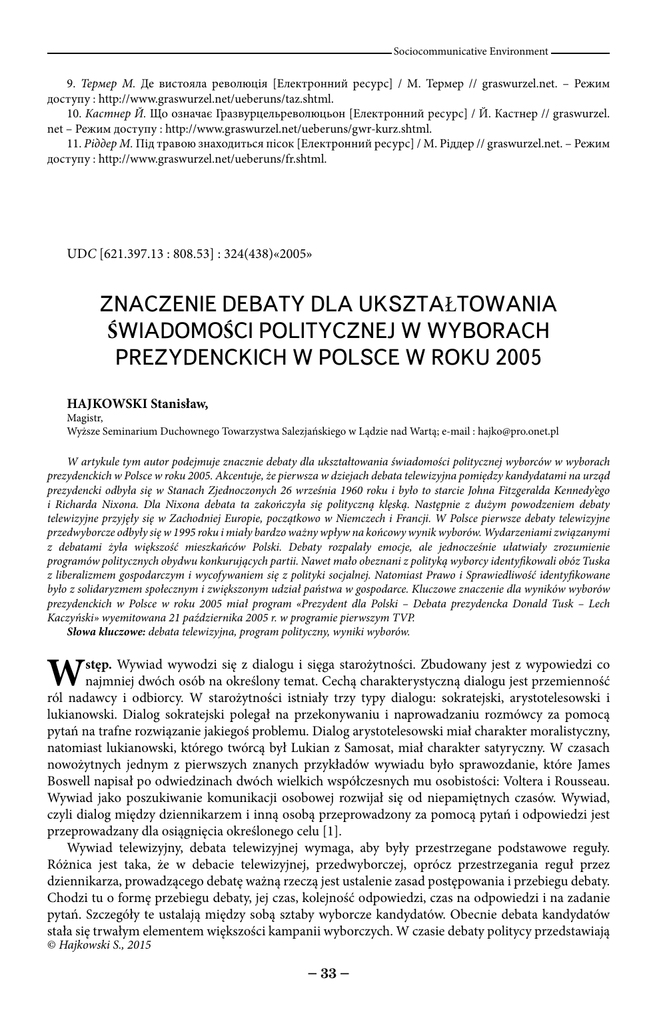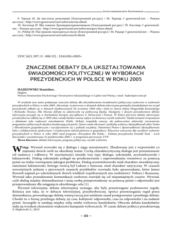 Sociocommunicative Environment 9. Термер М. Де вистояла революція [Електронний ресурс] / М. Термер // graswurzel.net. – Режим доступу : http://www.graswurzel.net/ueberuns/taz.shtml. 10. Кастнер Й. Що означає Гразвурцельреволюцьон [Електронний ресурс] / Й. Кастнер // graswurzel. net – Режим доступу : http://www.graswurzel.net/ueberuns/gwr-kurz.shtml. 11. Ріддер М. Під травою знаходиться пісок [Електронний ресурс] / М. Ріддер // graswurzel.net. – Режим доступу : http://www.graswurzel.net/ueberuns/fr.shtml. UDС [621.397.13 : 808.53] : 324(438)«2005» Znaczenie debaty dla ukształtowania świadomości politycznej w wyborach prezydenckich w Polsce w roku 2005 Hajkowski Stanisław, Magistr, Wyższe Seminarium Duchownego Towarzystwa Salezjańskiego w Lądzie nad Wartą; e-mail : [email protected] W artykule tym autor podejmuje znacznie debaty dla ukształtowania świadomości politycznej wyborców w wyborach prezydenckich w Polsce w roku 2005. Akcentuje, że pierwsza w dziejach debata telewizyjna pomiędzy kandydatami na urząd prezydencki odbyła się w Stanach Zjednoczonych 26 września 1960 roku i było to starcie Johna Fitzgeralda Kennedy’ego i Richarda Nixona. Dla Nixona debata ta zakończyła się polityczną klęską. Następnie z dużym powodzeniem debaty telewizyjne przyjęły się w Zachodniej Europie, początkowo w Niemczech i Francji. W Polsce pierwsze debaty telewizyjne przedwyborcze odbyły się w 1995 roku i miały bardzo ważny wpływ na końcowy wynik wyborów. Wydarzeniami związanymi z debatami żyła większość mieszkańców Polski. Debaty rozpalały emocje, ale jednocześnie ułatwiały zrozumienie programów politycznych obydwu konkurujących partii. Nawet mało obeznani z polityką wyborcy identyfikowali obóz Tuska z liberalizmem gospodarczym i wycofywaniem się z polityki socjalnej. Natomiast Prawo i Sprawiedliwość identyfikowane było z solidaryzmem społecznym i zwiększonym udział państwa w gospodarce. Kluczowe znaczenie dla wyników wyborów prezydenckich w Polsce w roku 2005 miał program «Prezydent dla Polski – Debata prezydencka Donald Tusk – Lech Kaczyński» wyemitowana 21 października 2005 r. w programie pierwszym TVP. Słowa kluczowe: debata telewizyjna, program polityczny, wyniki wyborów. W stęp. Wywiad wywodzi się z dialogu i sięga starożytności. Zbudowany jest z wypowiedzi co najmniej dwóch osób na określony temat. Cechą charakterystyczną dialogu jest przemienność ról nadawcy i odbiorcy. W starożytności istniały trzy typy dialogu: sokratejski, arystotelesowski i lukianowski. Dialog sokratejski polegał na przekonywaniu i naprowadzaniu rozmówcy za pomocą pytań na trafne rozwiązanie jakiegoś problemu. Dialog arystotelesowski miał charakter moralistyczny, natomiast lukianowski, którego twórcą był Lukian z Samosat, miał charakter satyryczny. W czasach nowożytnych jednym z pierwszych znanych przykładów wywiadu było sprawozdanie, które James Boswell napisał po odwiedzinach dwóch wielkich współczesnych mu osobistości: Voltera i Rousseau. Wywiad jako poszukiwanie komunikacji osobowej rozwijał się od niepamiętnych czasów. Wywiad, czyli dialog między dziennikarzem i inną osobą przeprowadzony za pomocą pytań i odpowiedzi jest przeprowadzany dla osiągnięcia określonego celu [1]. Wywiad telewizyjny, debata telewizyjnej wymaga, aby były przestrzegane podstawowe reguły. Różnica jest taka, że w debacie telewizyjnej, przedwyborczej, oprócz przestrzegania reguł przez dziennikarza, prowadzącego debatę ważną rzeczą jest ustalenie zasad postępowania i przebiegu debaty. Chodzi tu o formę przebiegu debaty, jej czas, kolejność odpowiedzi, czas na odpowiedzi i na zadanie pytań. Szczegóły te ustalają między sobą sztaby wyborcze kandydatów. Obecnie debata kandydatów stała się trwałym elementem większości kampanii wyborczych. W czasie debaty politycy przedstawiają © Hajkowski S., 2015 – 33 – Obraz. – Vol. 2 (17) ‘2015 swój program, wyrażają własne opinie i mogą zaprezentować się publiczności tak licznej, jakiej nie gwarantuje żadne inne medium. Obok zalet debata ma też i drugą stronę: zwycięsko wychodzi tylko jeden z uczestników debaty [2, c. 15–24; 3, c. 359]. Pierwsza w dziejach debata telewizyjna pomiędzy kandydatami na urząd prezydencki odbyła się w Stanach Zjednoczonych 26 września 1960 roku i było to starcie Johna Fitzeralda Kenney’ego i Richarda Nixona. Dla Nixona debata ta zakończyła się polityczną klęską. Z dużym powodzeniem debaty telewizyjne przyjęły Niemcy i Francja. W Polsce pierwsze debaty telewizyjne przedwyborcze odbyły się w 1995 roku i miały bardzo ważny wpływ na końcowy wynik wyborów [4, c. 64–69]. Wyniki i omówienie. Kluczowe znaczenie dla wyników wyborów prezydenckich w Polsce w roku 2005 miał program „Prezydent dla Polski-Debata prezydencka Donald Tusk – Lech Kaczyński wyemitowana 21 października w programie pierwszym TVP. Został on podzielony na trzy części poprzedzone rozmową z rodzinami kandydatów. Lech Kaczyński i Donald Tusk następnie toczyli spór wokół najistotniejszych zagadnień dla bytu państwowego: spierali o gospodarkę, o wizję Rzeczypospolitej i o sprawy zagraniczne. Na zakończenie mogli wygłosić krótkie orędzie, wystąpienie skierowane do wyborców.Jednak w starciu Donalda Tuska i Lecha Kaczyńskiego trudno mówić o obrazie jednej debaty telewizyjnej ponieważ Donald Tusk i Lech Kaczyński mieli okazje skonfrontować swoje poglądy „twarzą w twarz” na przestrzeni dwóch miesięcy pięciokrotnie. Niewątpliwie musiało to wpłynąć na odbiór społeczny kampanii wyborczej. Przyczyniało się również do wzrostu wyrobienia politycznego szerokich rzesz telewidzów, 