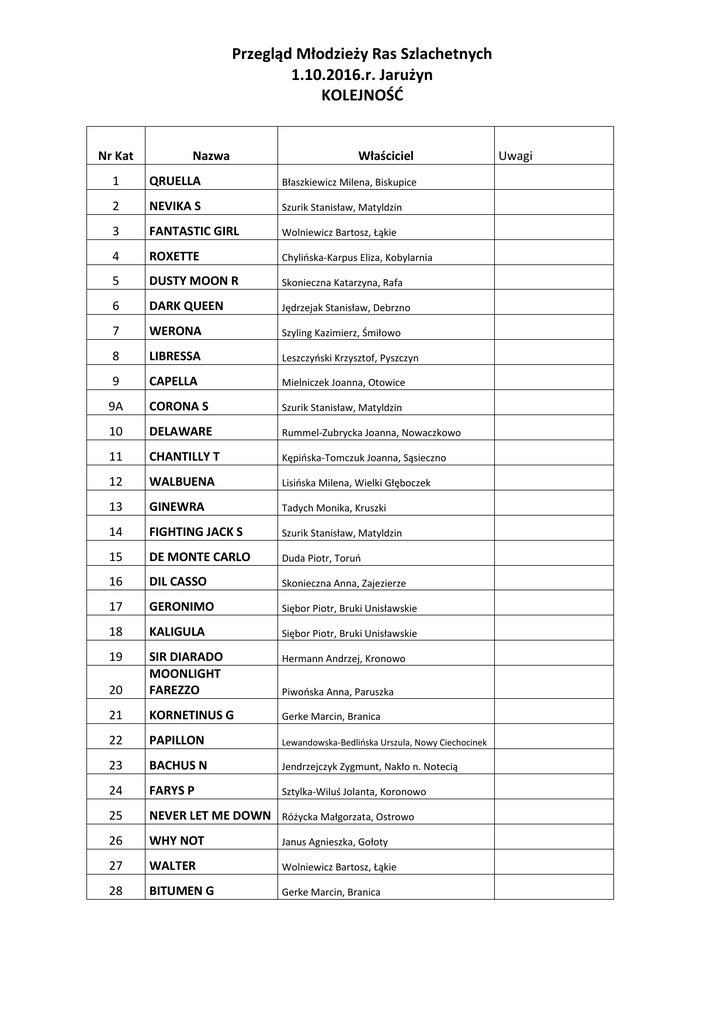 Przegląd Młodzieży Ras Szlachetnych 1.10.2016.r. Jarużyn KOLEJNOŚĆ Nr Kat Nazwa Właściciel 1 QRUELLA Błaszkiewicz Milena, Biskupice 2 NEVIKA S Szurik Stanisław, Matyldzin 3 FANTASTIC GIRL Wolniewicz Bartosz, Łąkie 4 ROXETTE Chylińska-Karpus Eliza, Kobylarnia 5 DUSTY MOON R Skonieczna Katarzyna, Rafa 6 DARK QUEEN Jędrzejak Stanisław, Debrzno 7 WERONA Szyling Kazimierz, Śmiłowo 8 LIBRESSA Leszczyński Krzysztof, Pyszczyn 9 CAPELLA Mielniczek Joanna, Otowice 9A CORONA S Szurik Stanisław, Matyldzin 10 DELAWARE Rummel-Zubrycka Joanna, Nowaczkowo 11 CHANTILLY T Kępińska-Tomczuk Joanna, Sąsieczno 12 WALBUENA Lisińska Milena, Wielki Głęboczek 13 GINEWRA Tadych Monika, Kruszki 14 FIGHTING JACK S Szurik Stanisław, Matyldzin 15 DE MONTE CARLO Duda Piotr, Toruń 16 DIL CASSO Skonieczna Anna, Zajezierze 17 GERONIMO Siębor Piotr, Bruki Unisławskie 18 KALIGULA Siębor Piotr, Bruki Unisławskie 19 Hermann Andrzej, Kronowo 20 SIR DIARADO MOONLIGHT FAREZZO 21 KORNETINUS G Gerke Marcin, Branica 22 PAPILLON Lewandowska-Bedlińska Urszula, Nowy Ciechocinek 23 BACHUS N Jendrzejczyk Zygmunt, Nakło n. Notecią 24 FARYS P Sztylka-Wiluś Jolanta, Koronowo 25 NEVER LET ME DOWN Różycka Małgorzata, Ostrowo 26 WHY NOT Janus Agnieszka, Gołoty 27 WALTER Wolniewicz Bartosz, Łąkie 28 BITUMEN G Gerke Marcin, Branica Piwońska Anna, Paruszka Uwagi